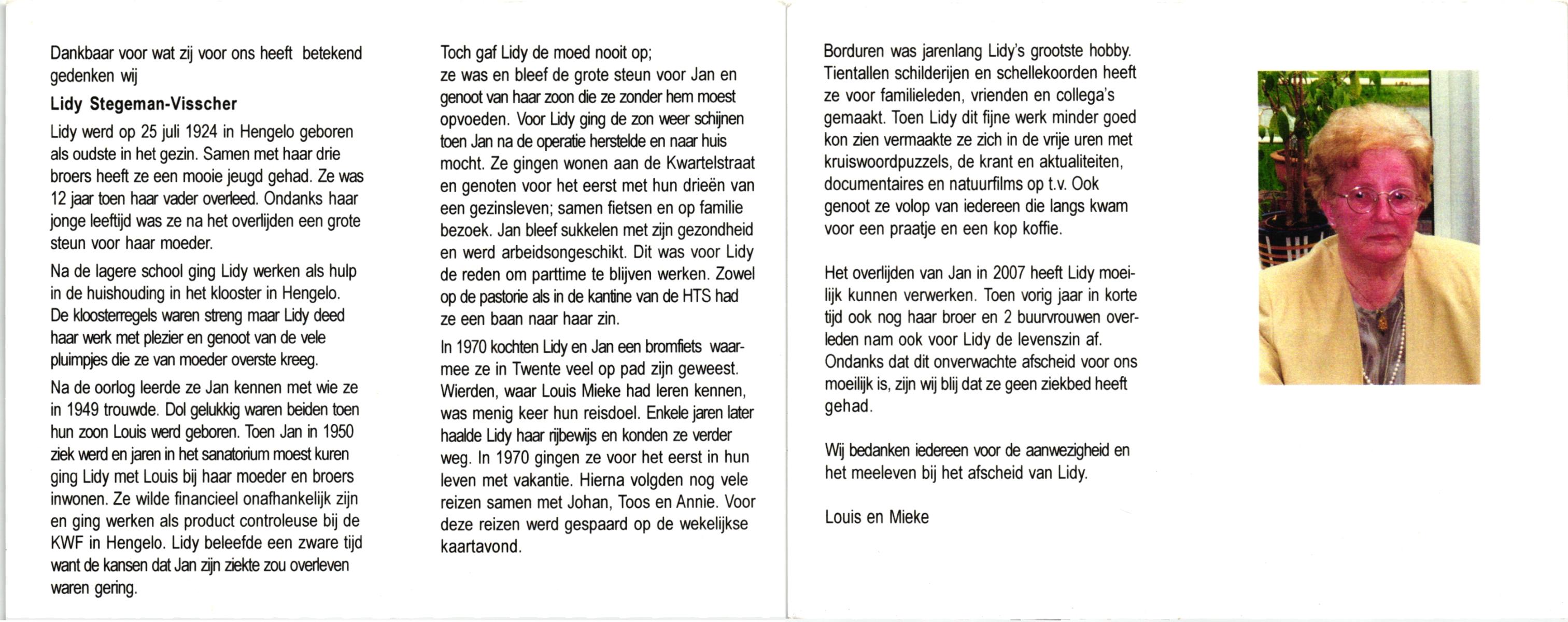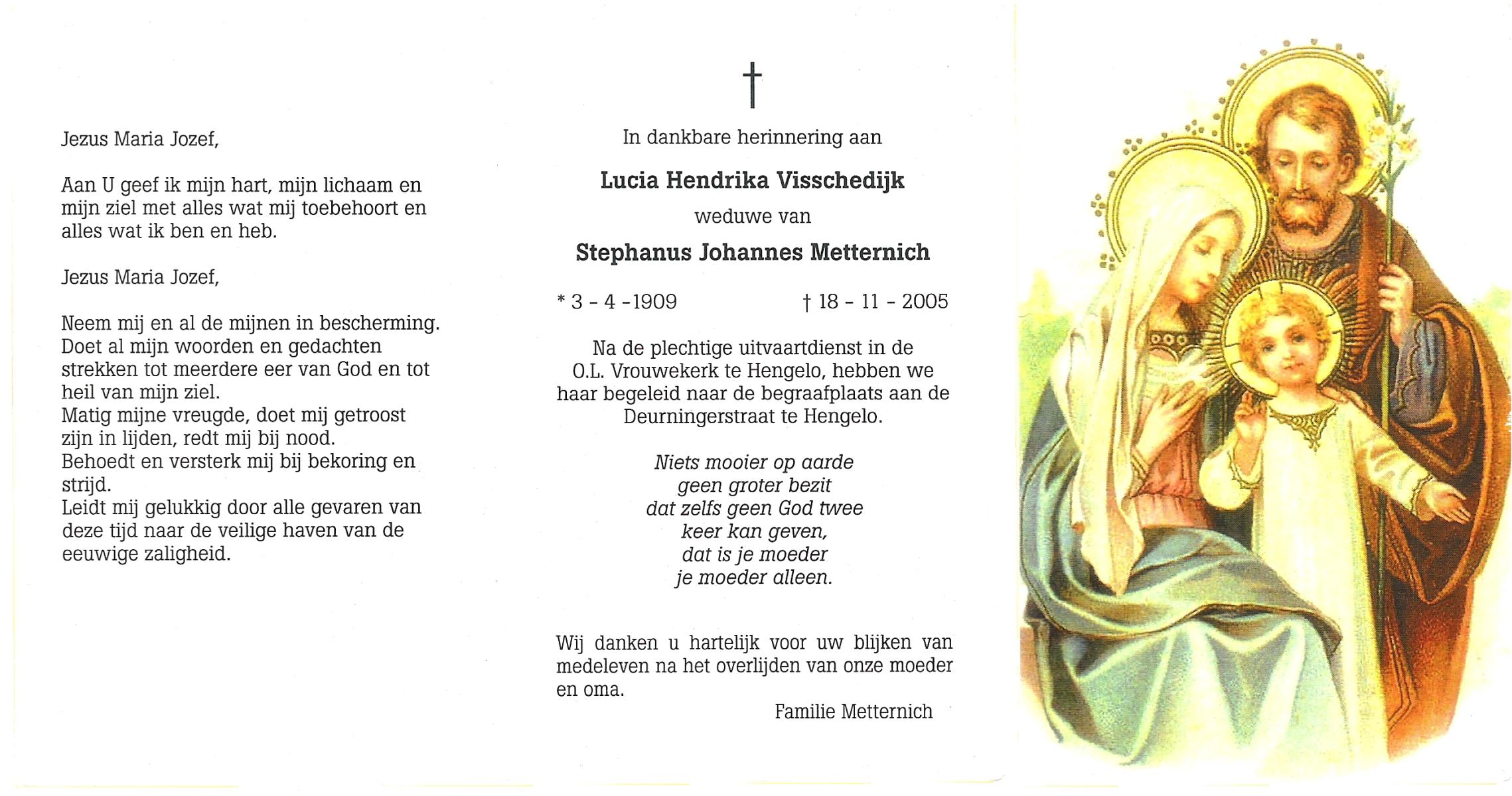 VISSCHEDIJK, Lucia Hendrika, geboren op 3-4-1909, overleden op 18-11-2005 te Hengelo (Ov.) op 96-jarige leeftijd, begraven te Hengelo (Ov.).