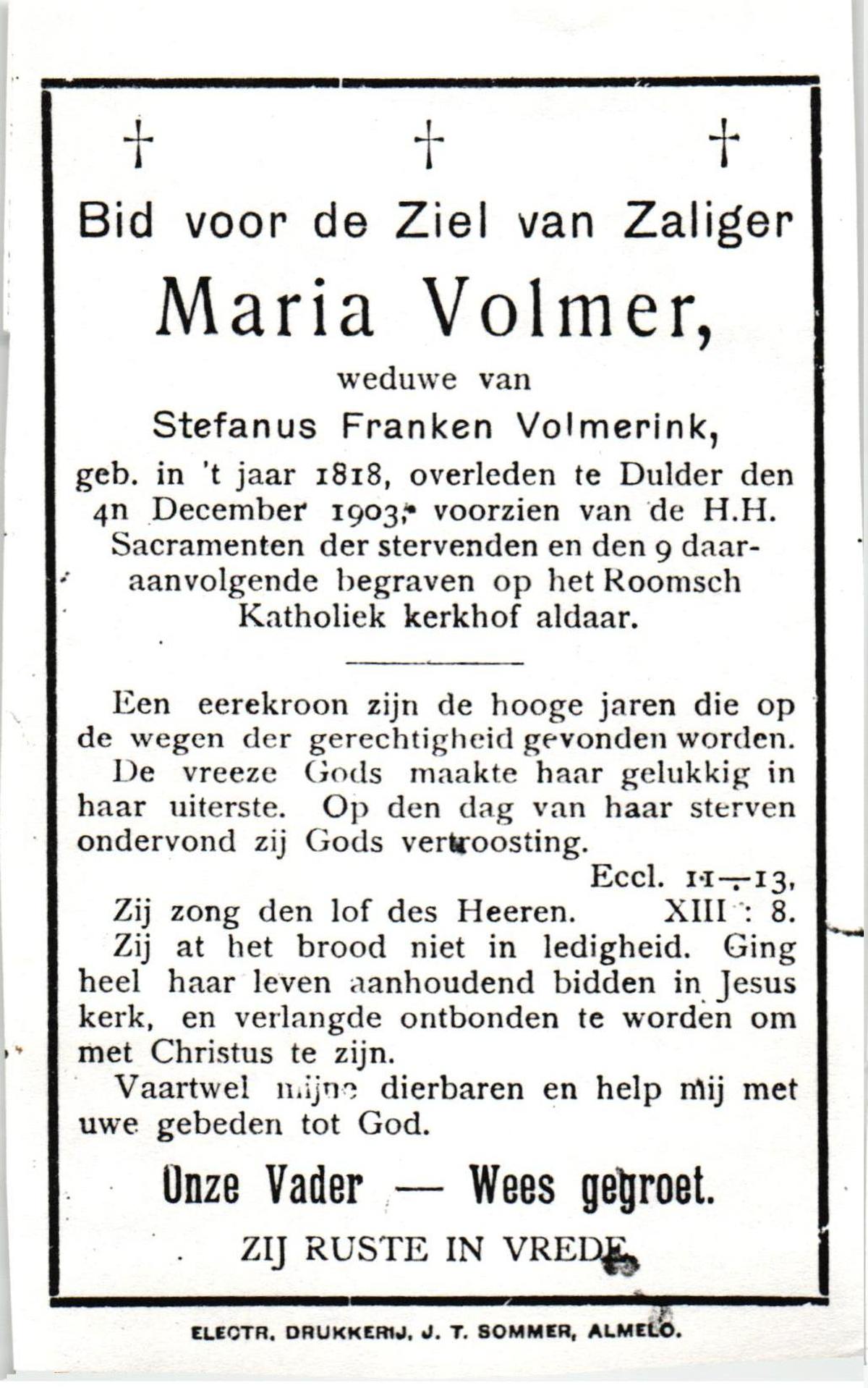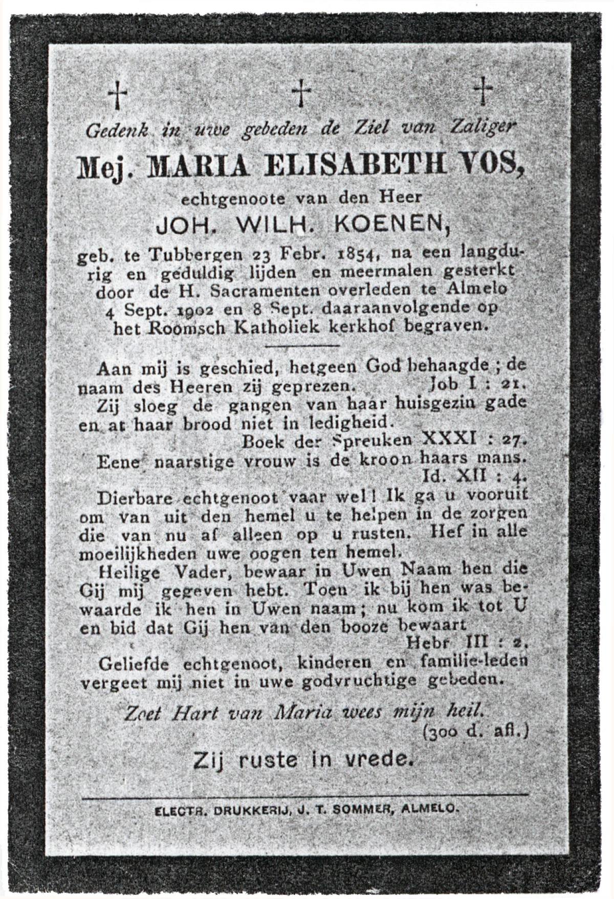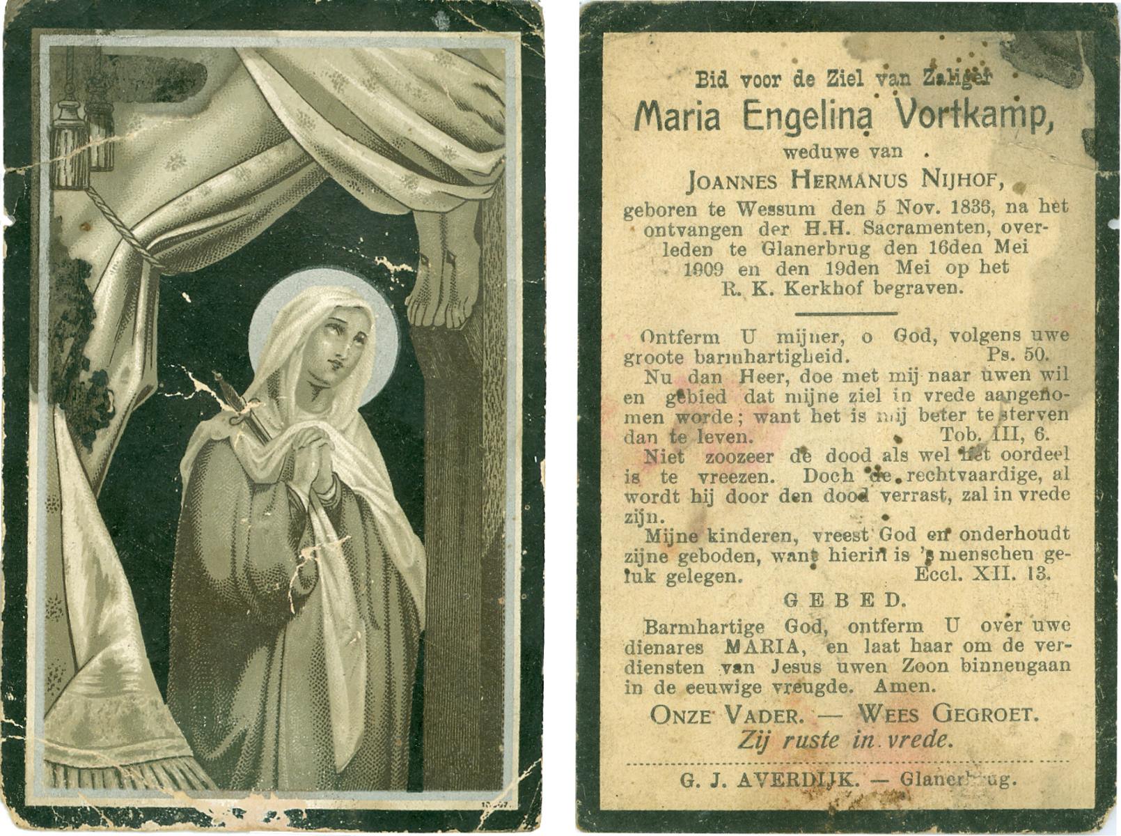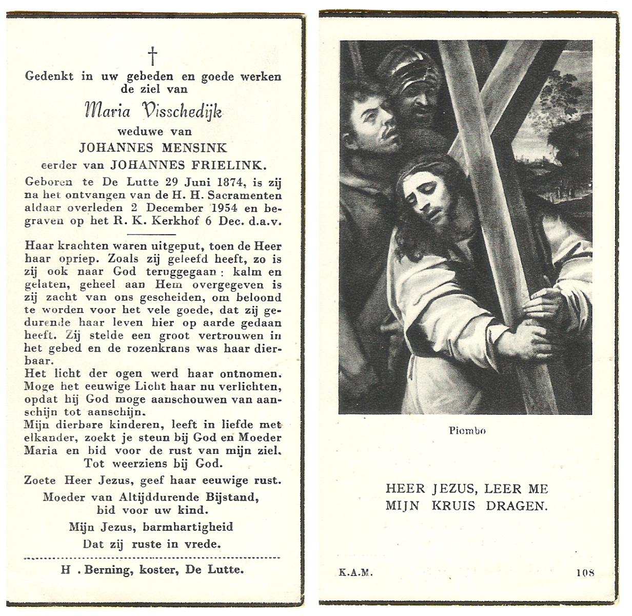VISSCHEDIJK, Maria, geboren op 29-06-1874 te De Lutte, overleden op 2-12-1954 te De Lutte op 80-jarige leeftijd, begraven op 6-12-1954 te De Lutte.