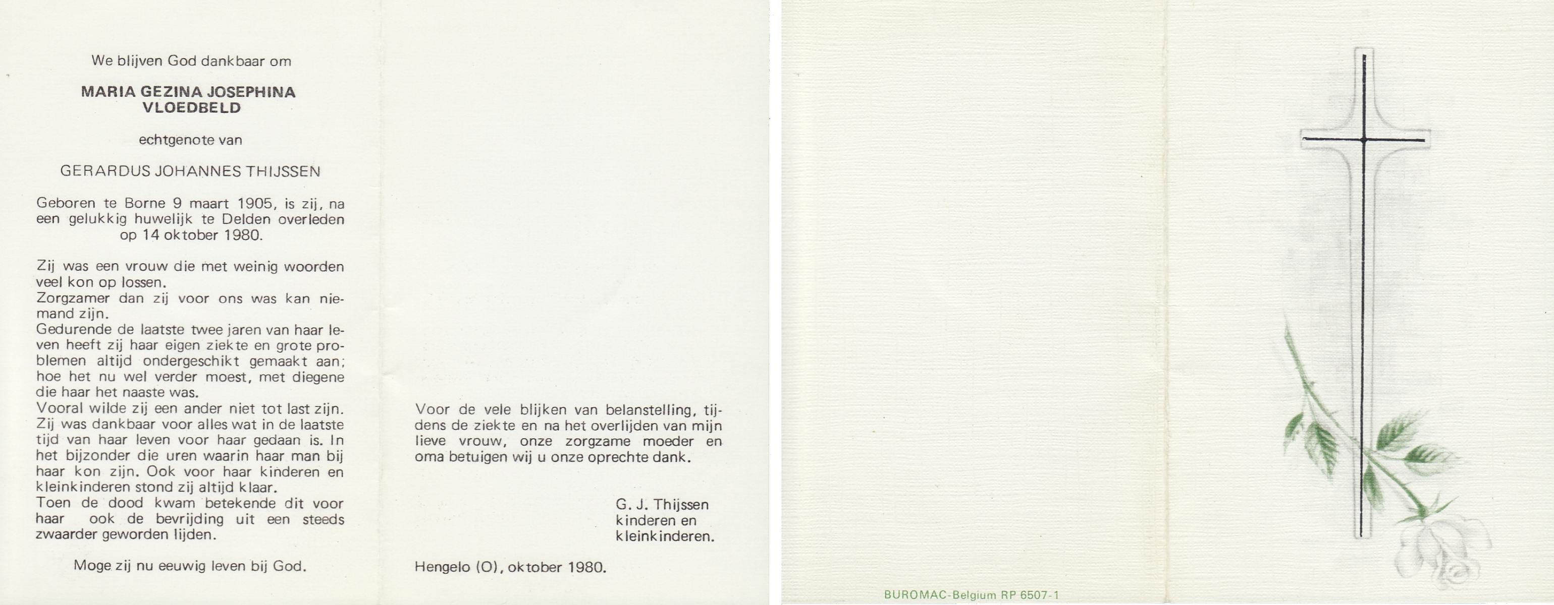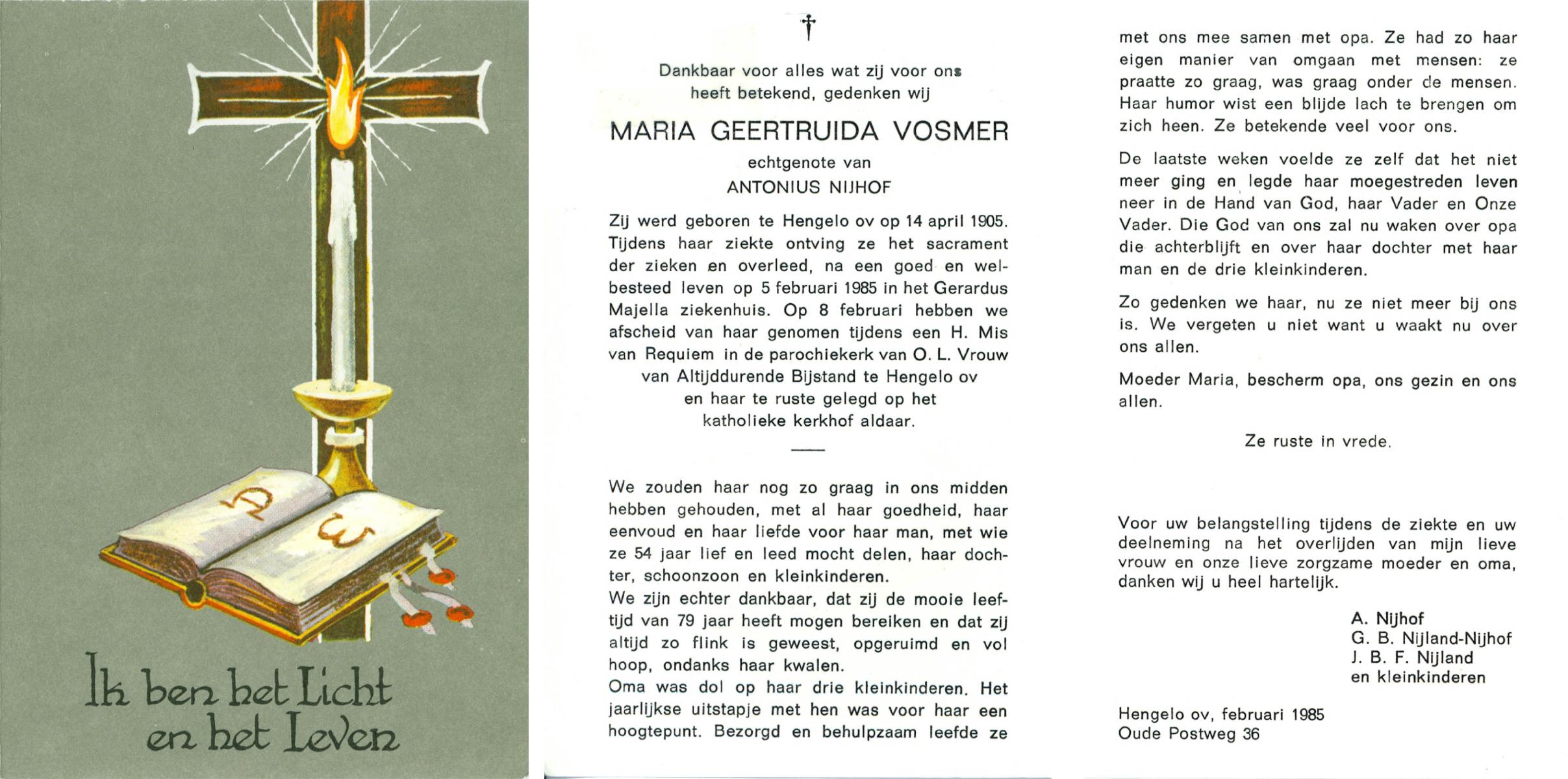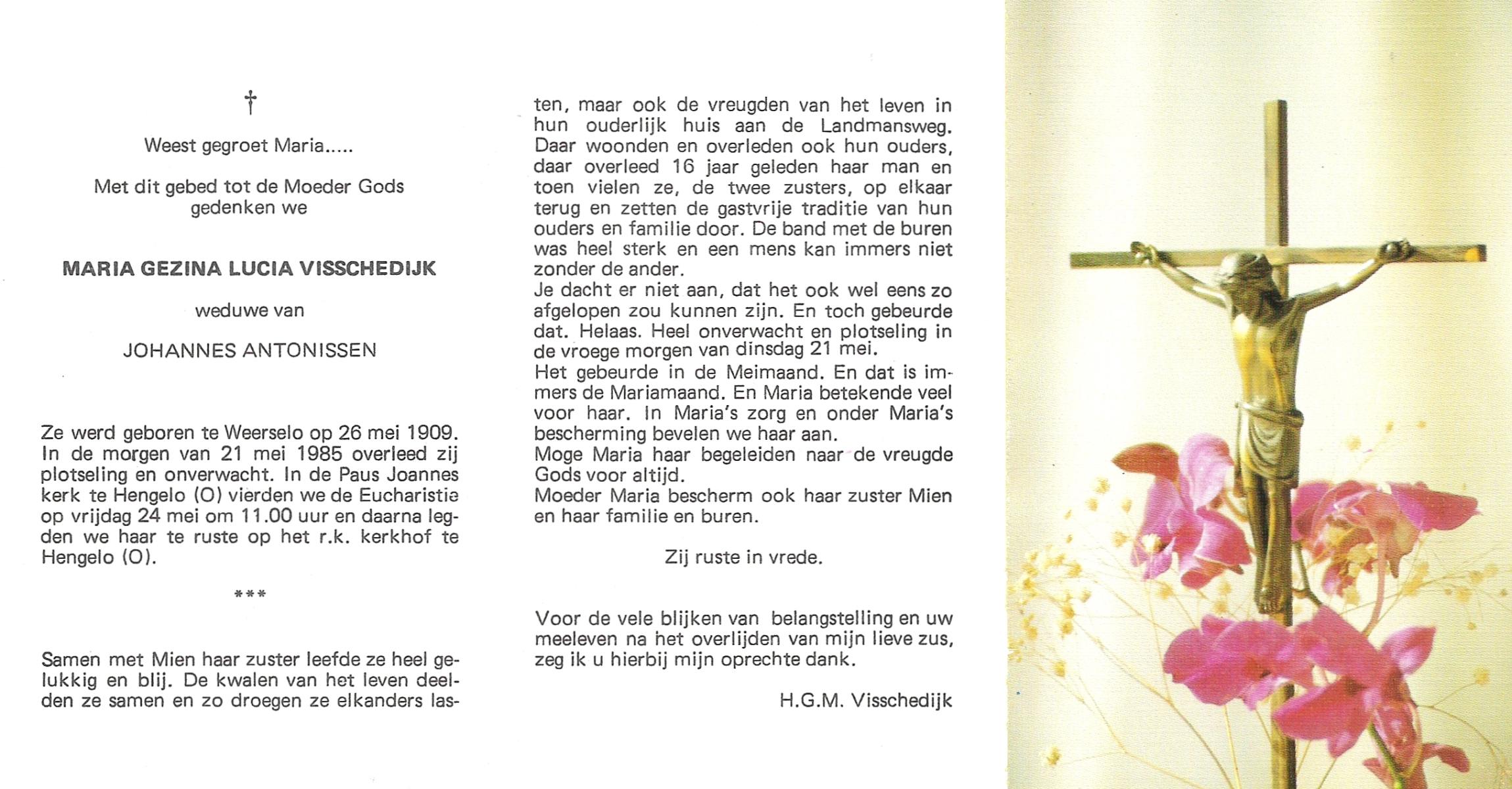 VISSCHEDIJK, Maria Gezina Lucia, geboren op 26-5-1909 te Weerselo, overleden op 21-5-1985 op 75-jarige leeftijd, begraven op 24-5-1985 te Hengelo (Ov.).
