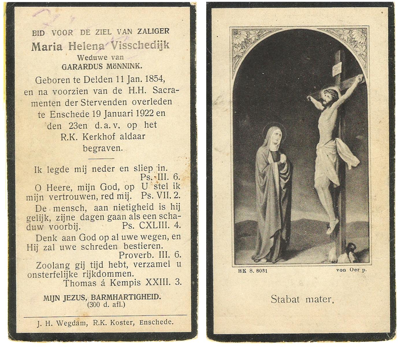 VISSCHEDIJK, Maria Helena, geboren op 11-01-1854 te Delden, overleden op 19-1-1922 te Enschede op 68-jarige leeftijd, begraven op 23-1-1922 te Enschede R.K.Kerhof.