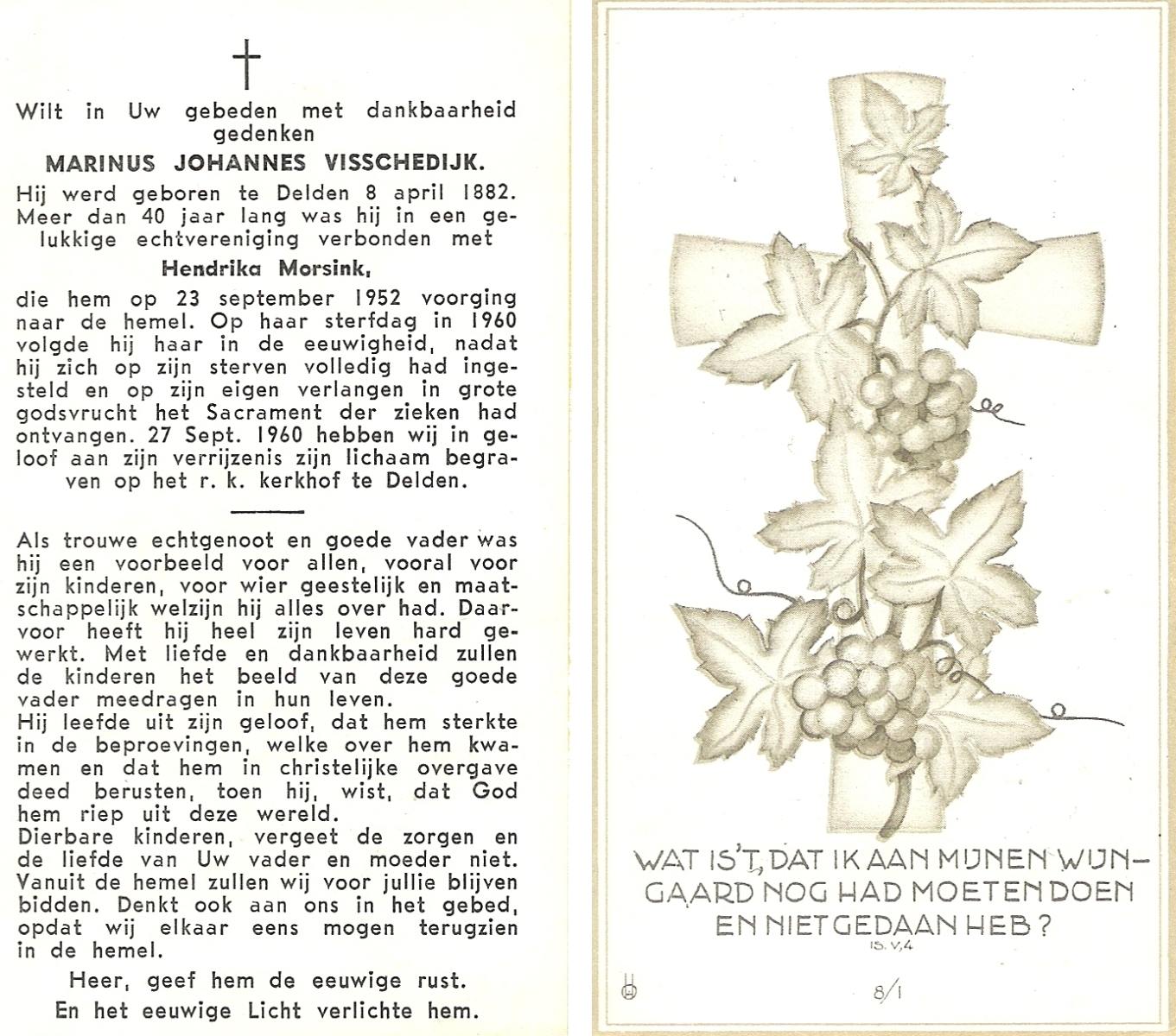 VISSCHEDIJK, Marinus Johannes, geboren op 08-04-1882 te Delden, overleden op 23-9-1960 op 70-jarige leeftijd, begraven op 27-9-1960 te Delden parochie-kerkhof H.Blasius.