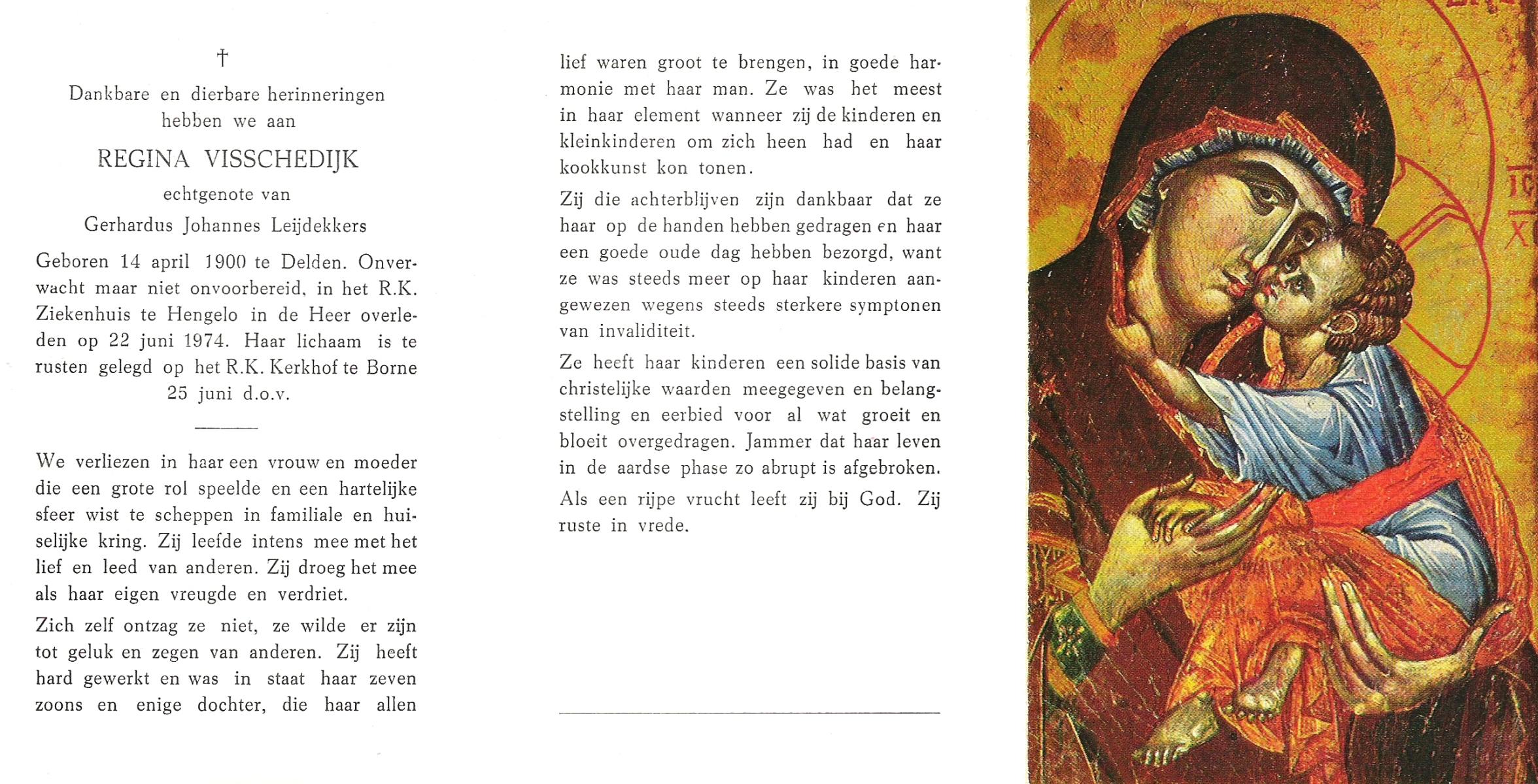 VISSCHEDIJK, Regina, geboren op 14-4-1900 te Delden, overleden op 22-6-1974 te Hengelo (Ov.) op 74-jarige leeftijd, begraven op 25-6-1974 te Borne.