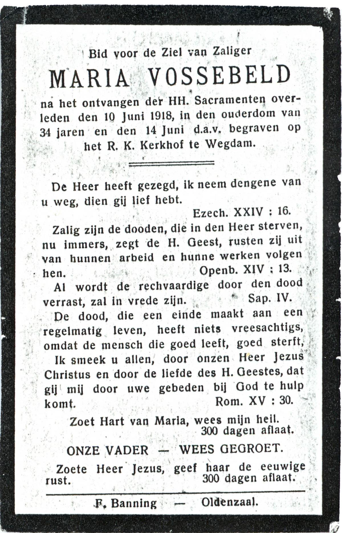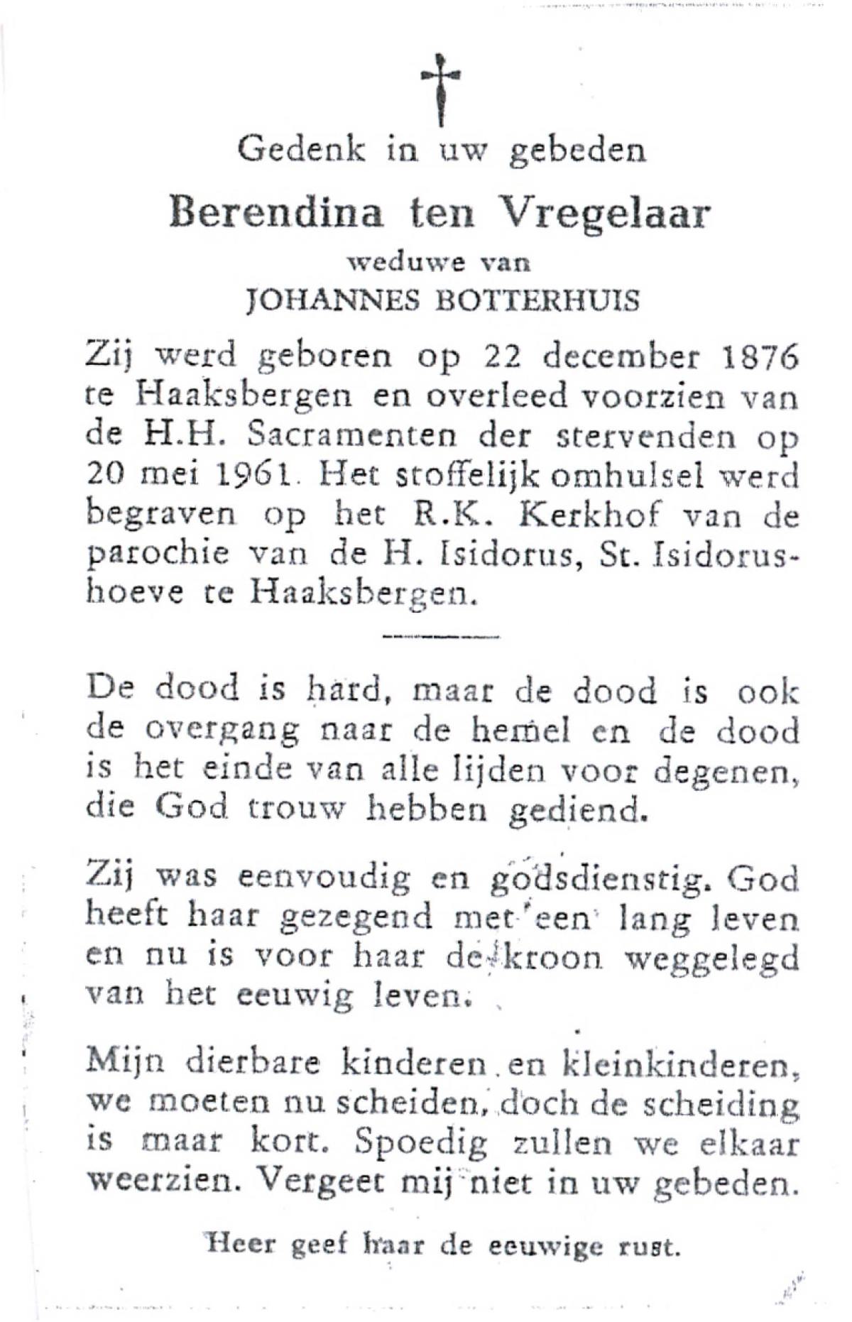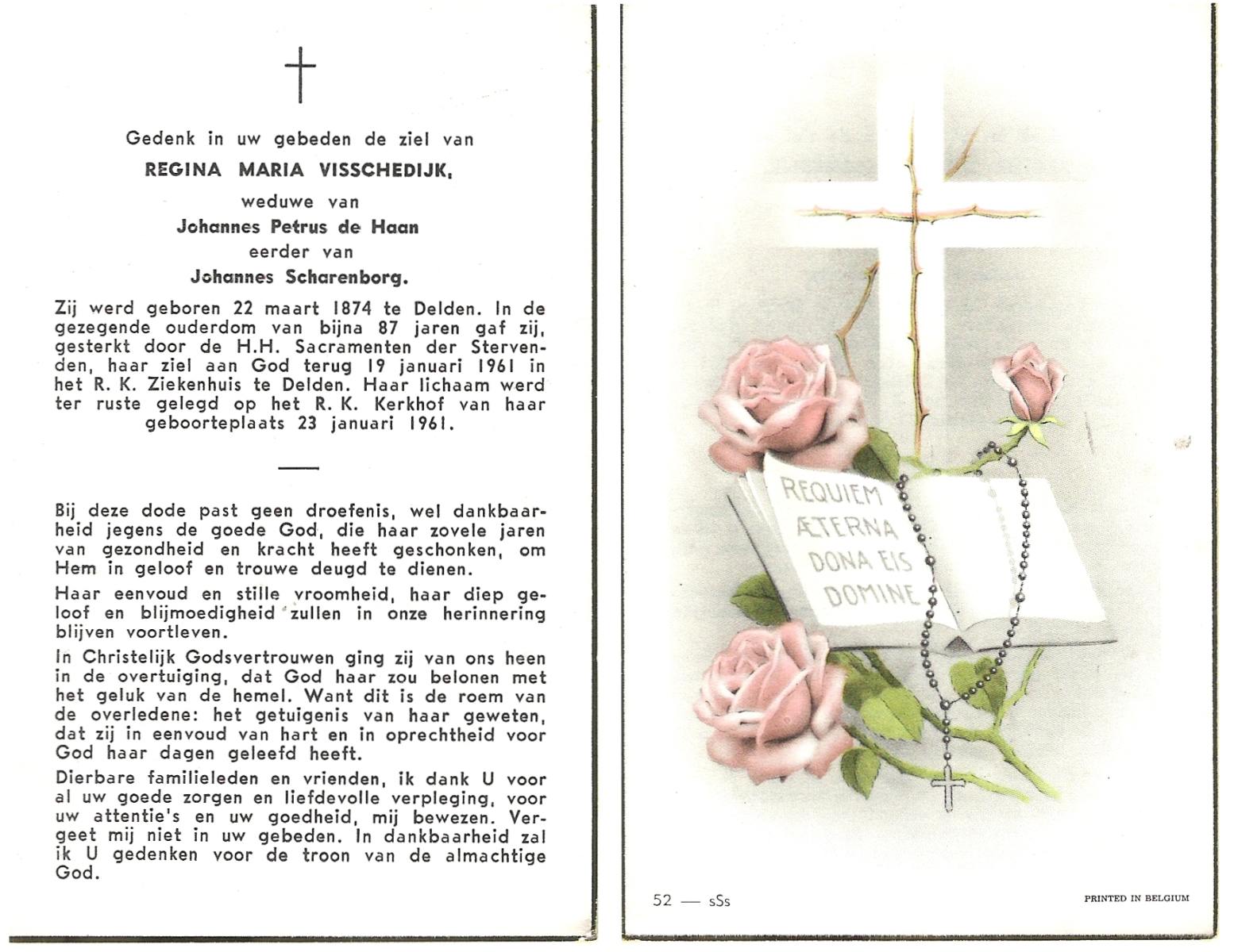 VISSCHEDIJK, Regina Maria, geboren op 22-03-1874 te Delden, overleden op 19-1-1961 te Delden op 86-jarige leeftijd, begraven op 23-1-1961 te Delden parochie-kerkhof H.Blasius.