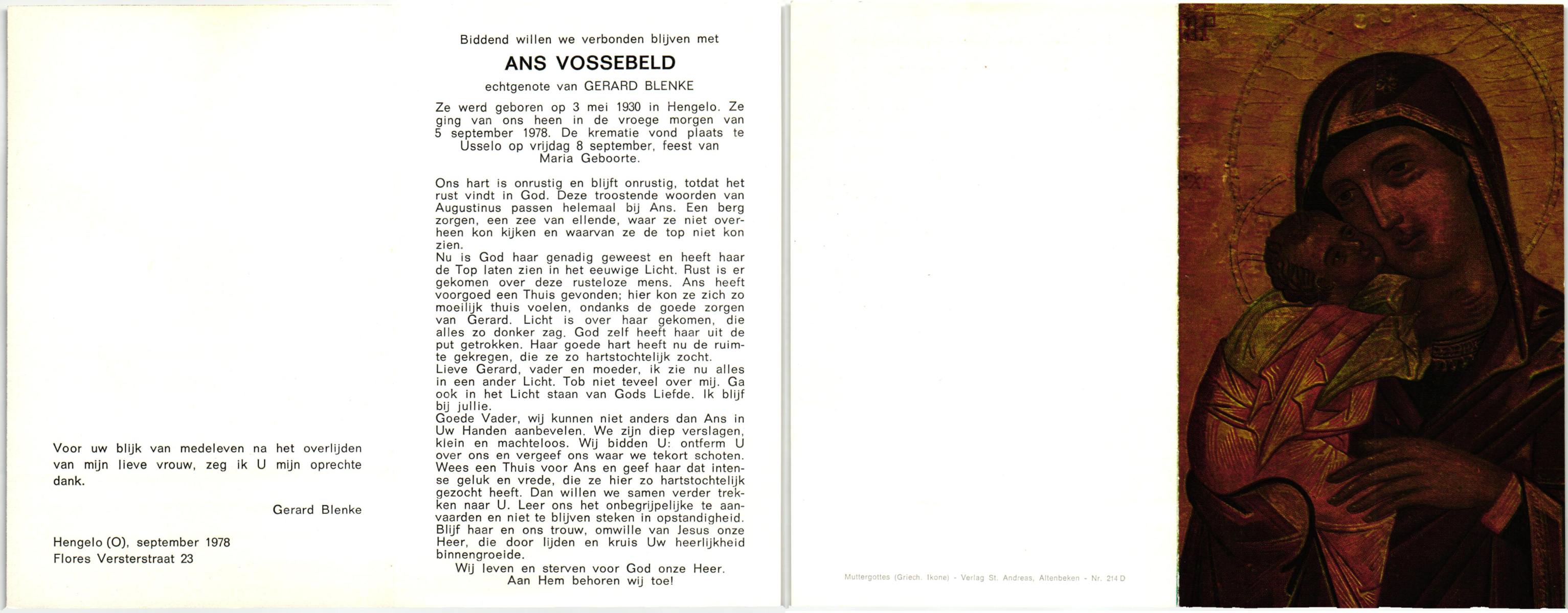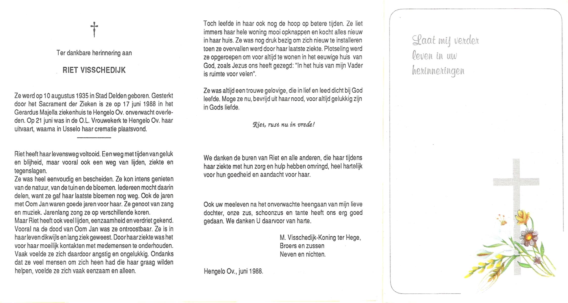 VISSCHEDIJK, Riet, geboren op 10-8-1935 te Delden, Stad, overleden op 17-6-1988 te Hengelo (Ov.) op 52-jarige leeftijd, gecremeerd op 21-6-1988 te Usselo.
