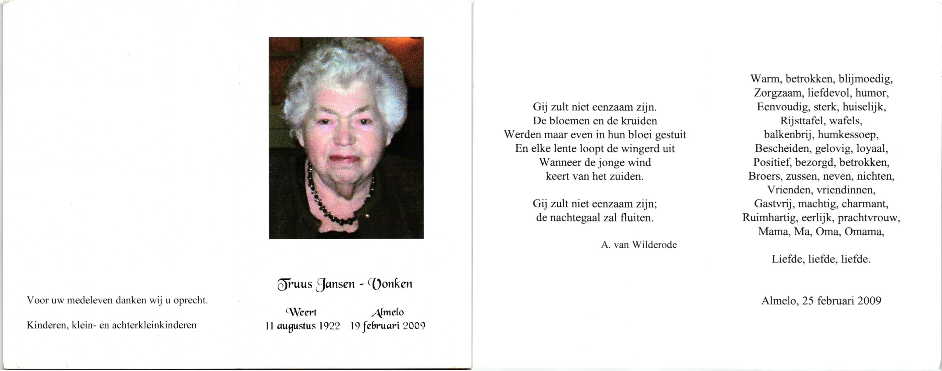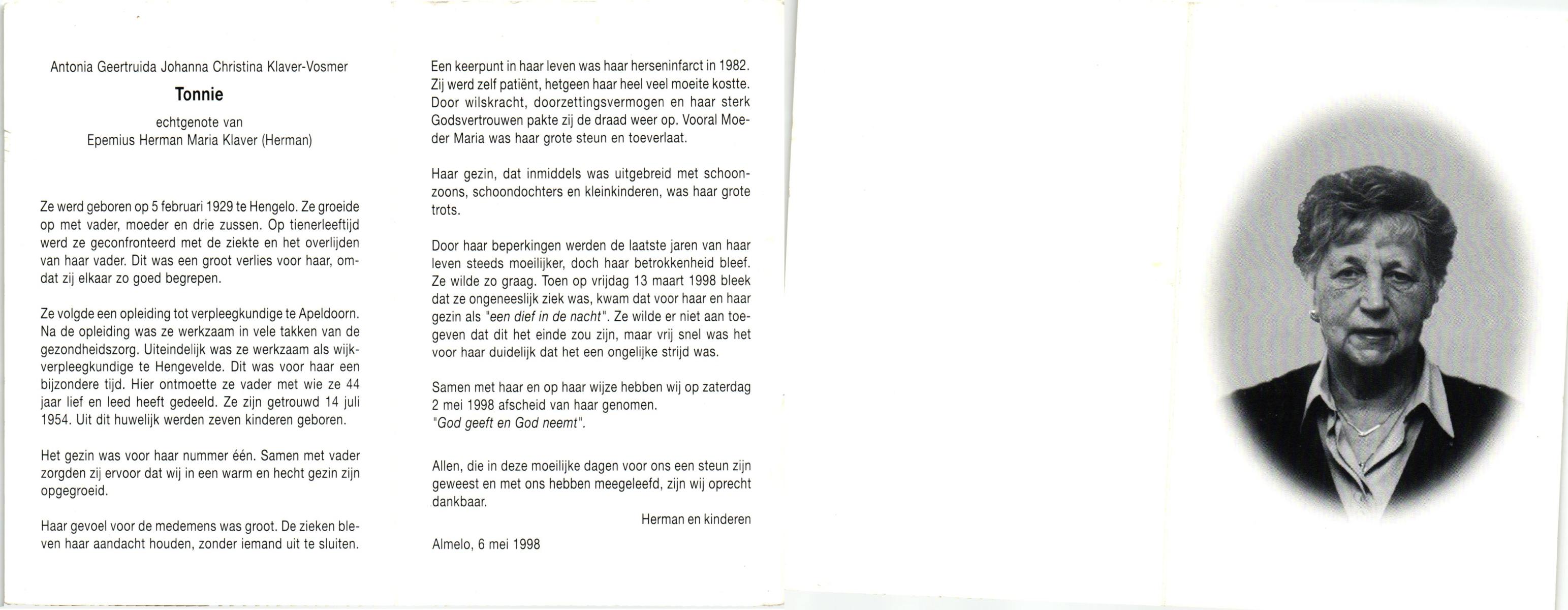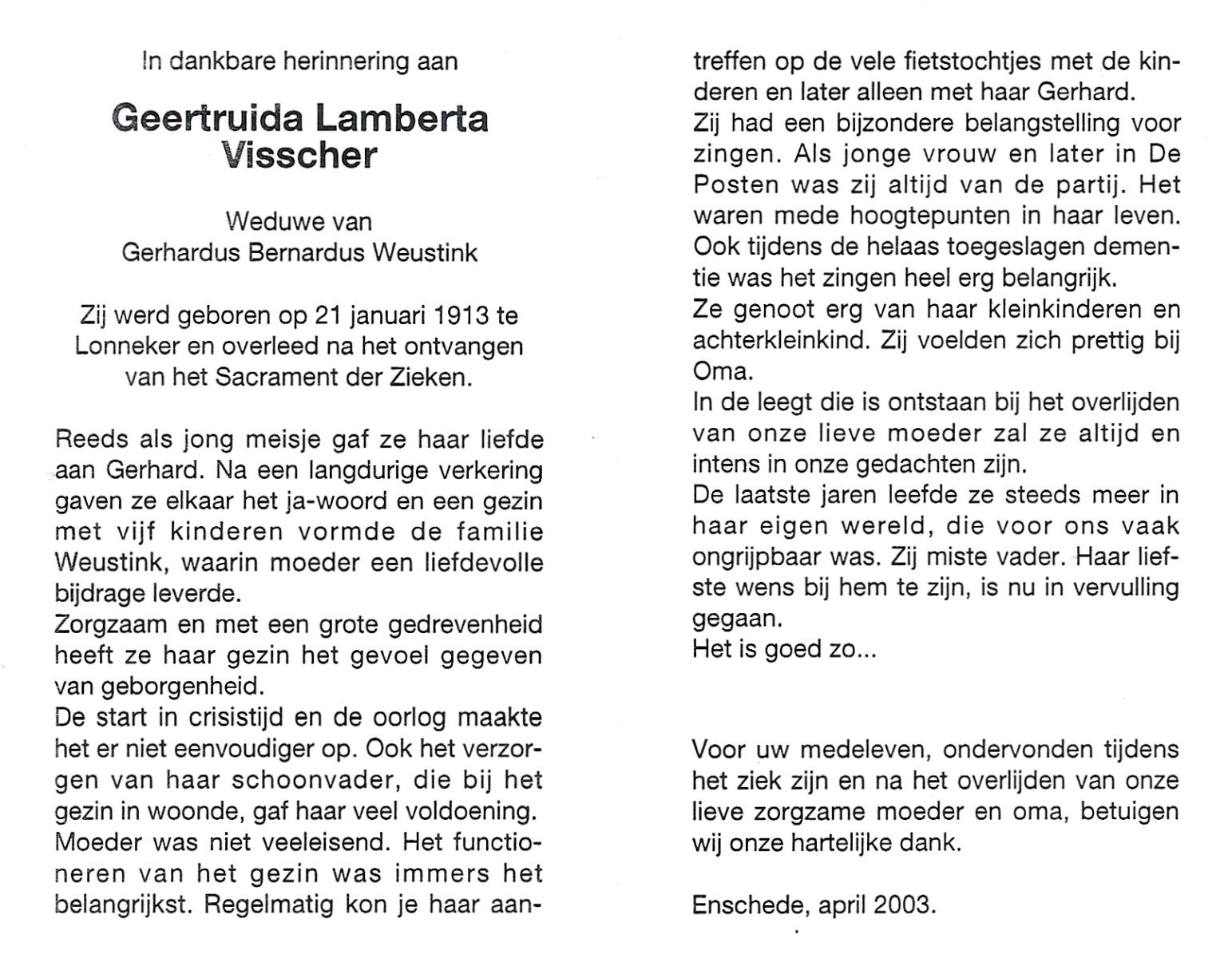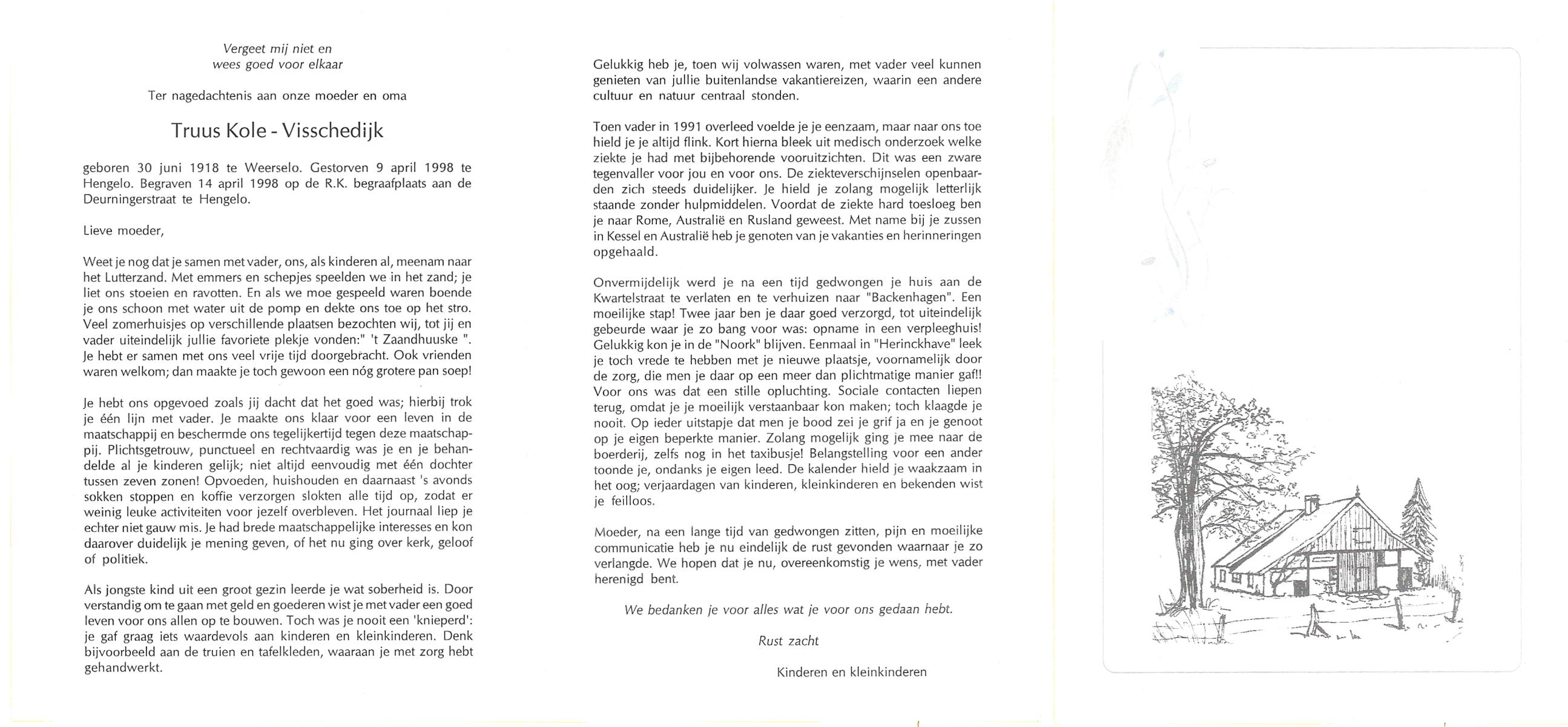 VISSCHEDIJK, Truus, geboren op 30-6-1918 te Weerselo, overleden op 9-4-1998 te Hengelo (Ov.) op 79-jarige leeftijd, begraven op 14-4-1998 te Hengelo (Ov.).