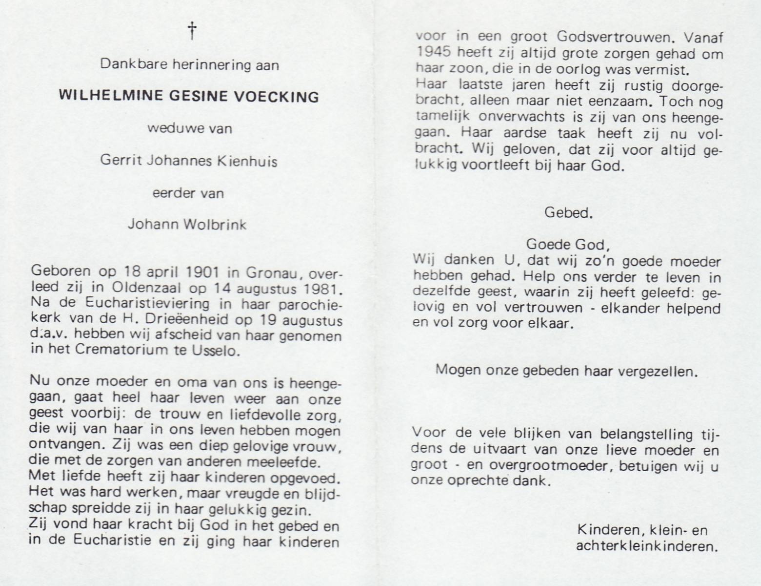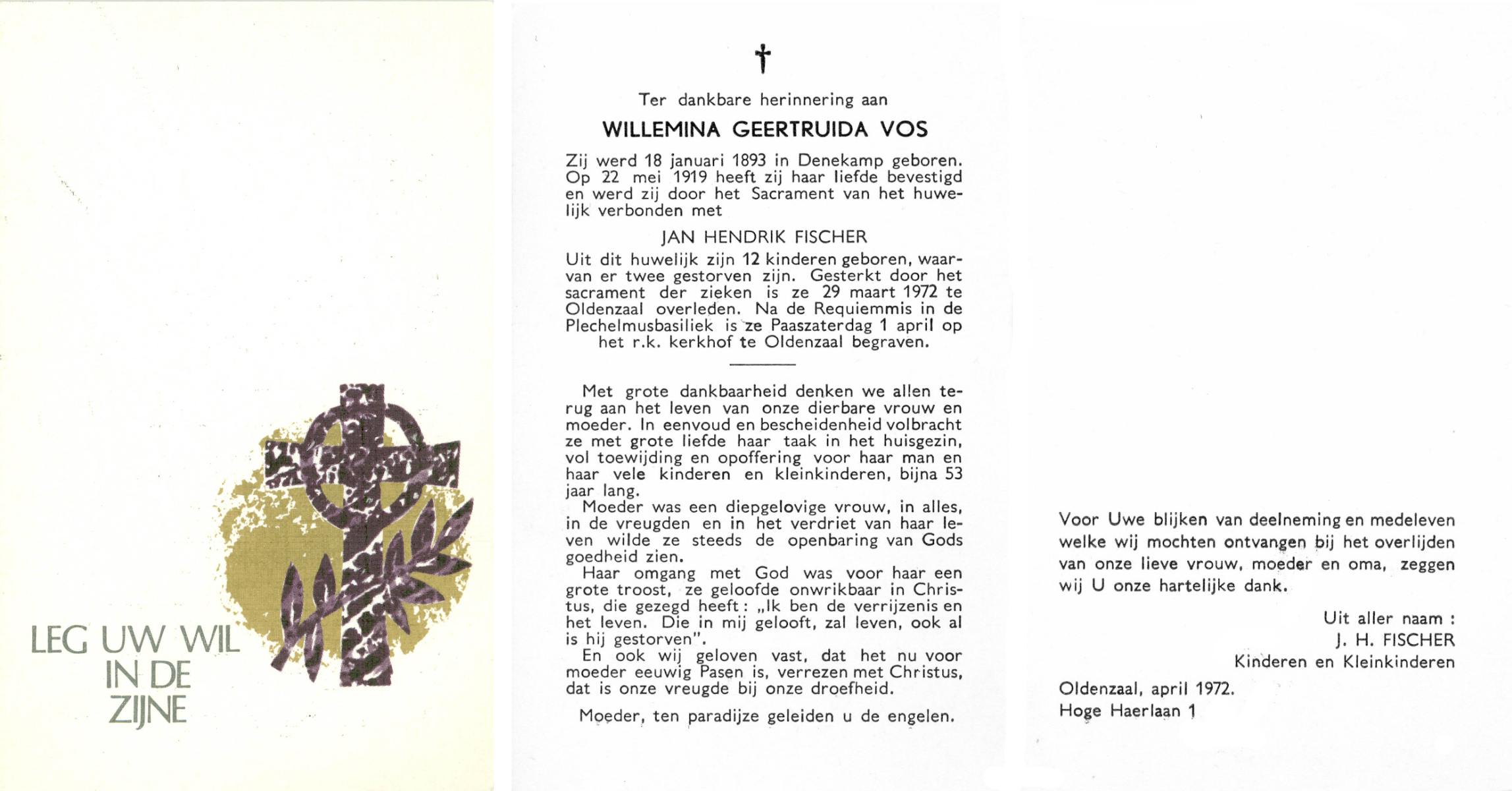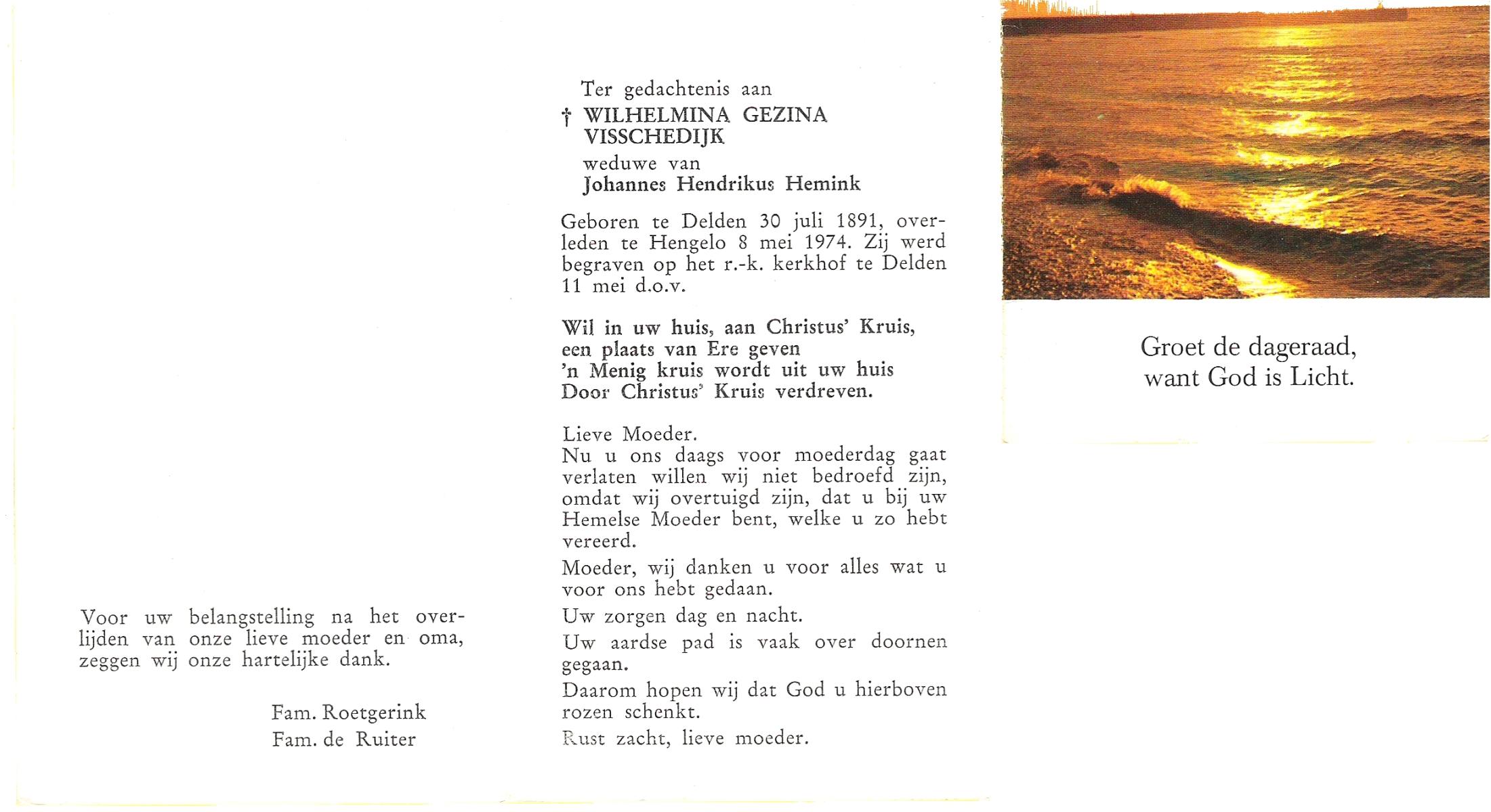 VISSCHEDIJK, Wilhelmina Gezina, geboren op 30-07-1891 te Delden, overleden op 8-5-1974 te Hengelo (Ov.) op 82-jarige leeftijd, begraven op 11-5-1974 te Delden.