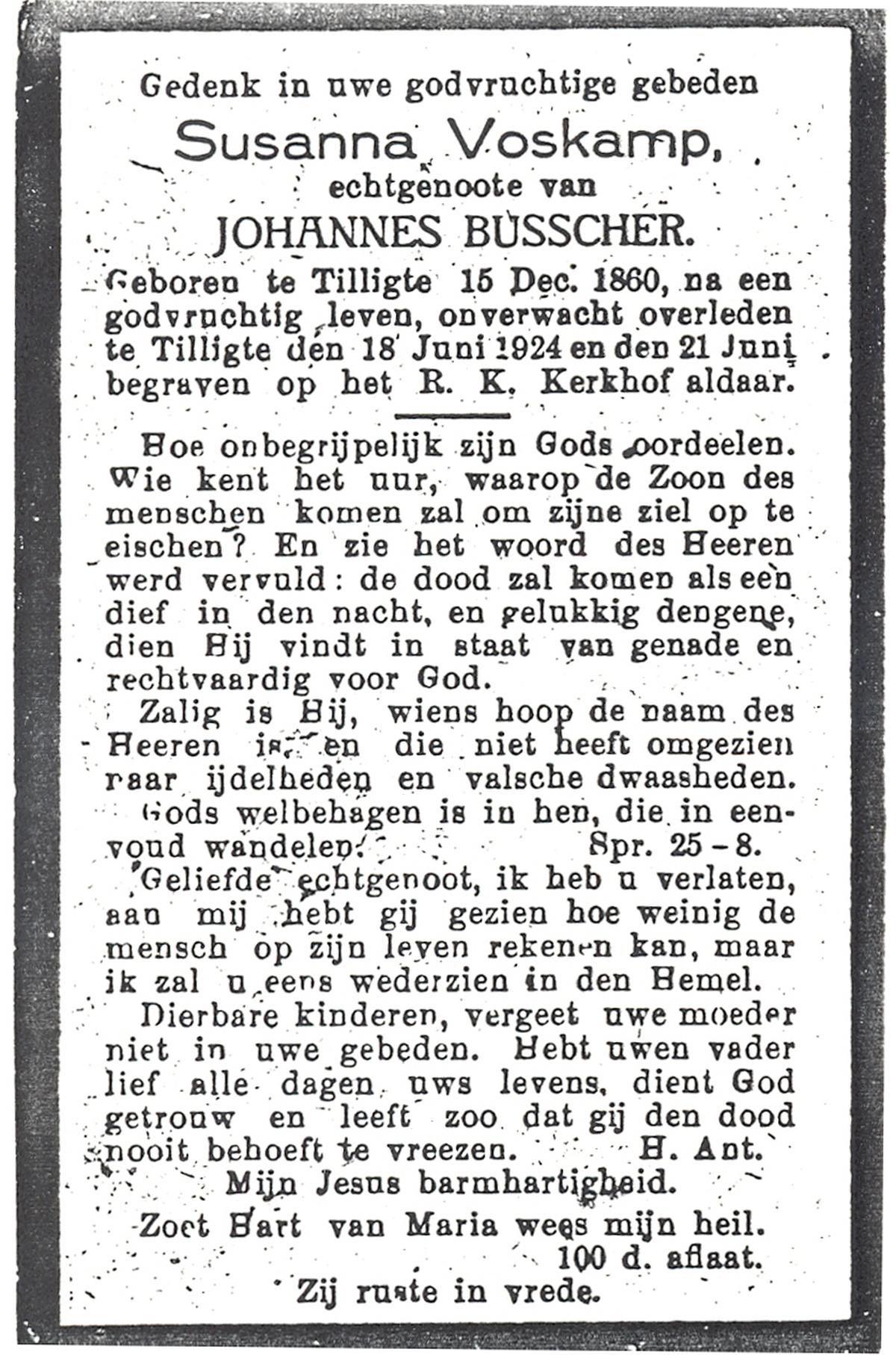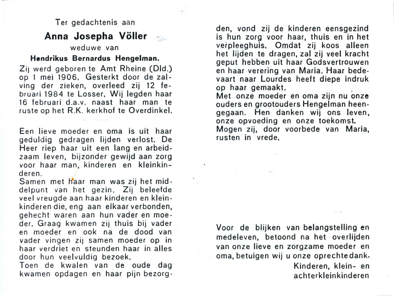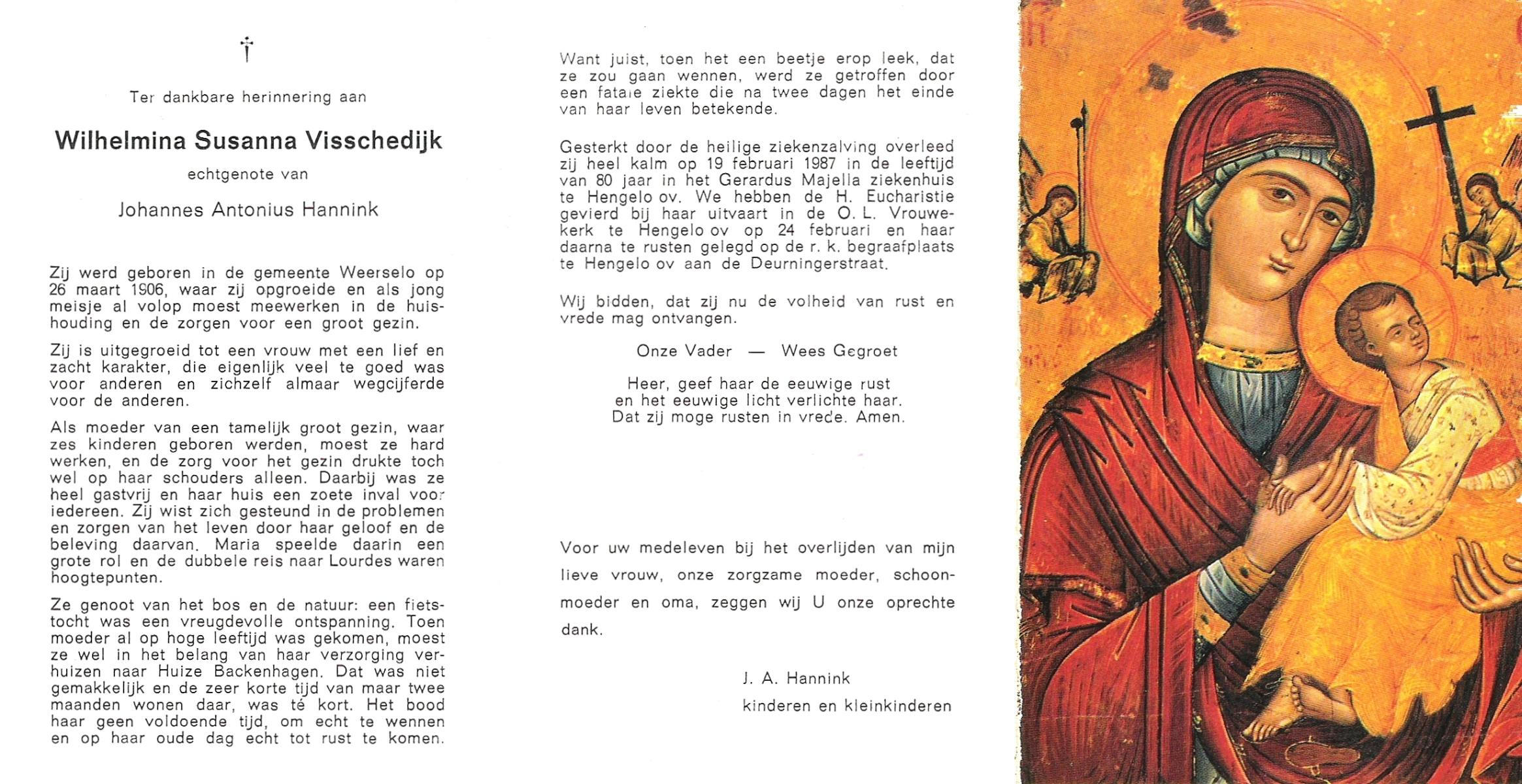 VISSCHEDIJK, Wilhelmina Susanna, geboren op 26-3-1906 te Weerselo, overleden op 19-2-1987 te Hengelo (Ov.) op 80-jarige leeftijd, begraven op 24-2-1987 te Hengelo (Ov.).