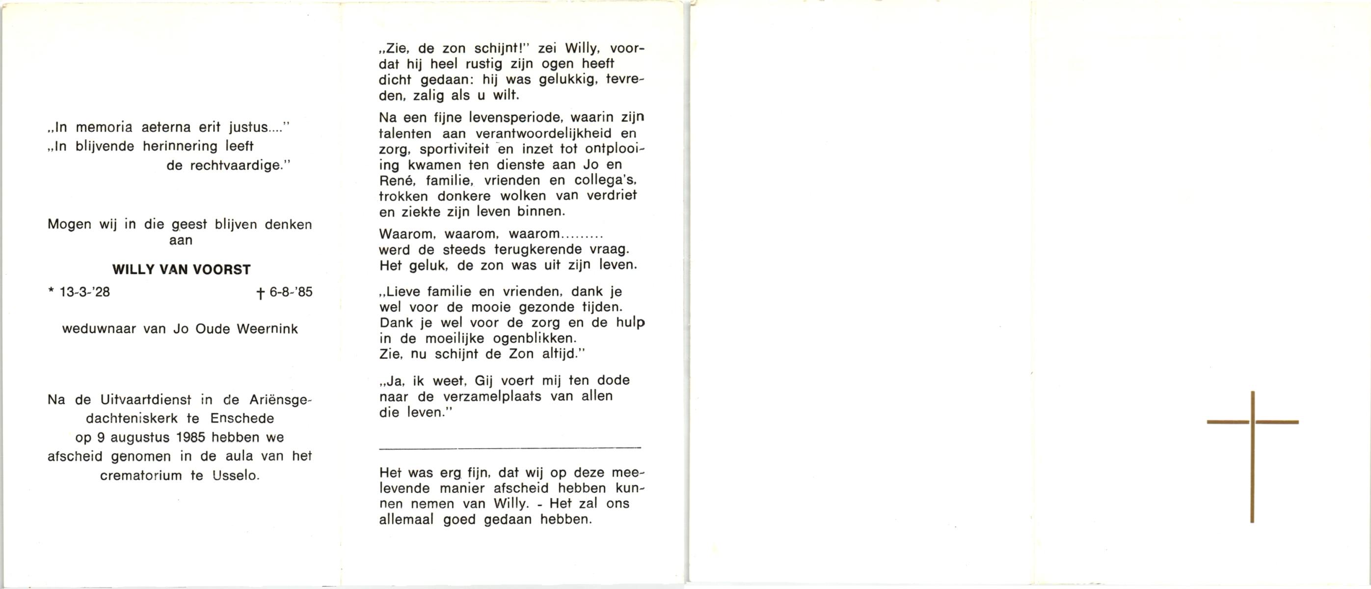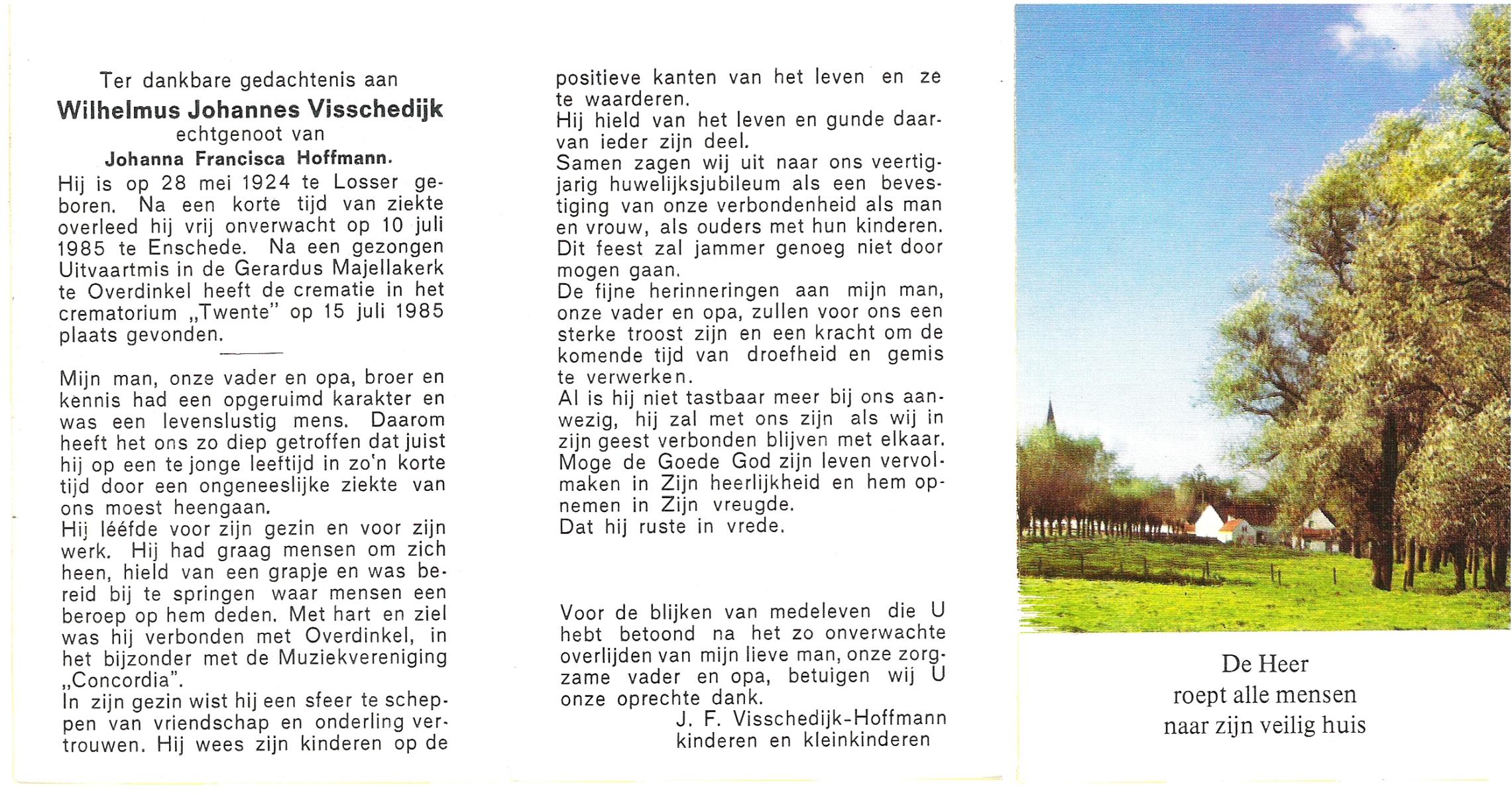VISSCHEDIJK, Wilhelmus Johannes, geboren op 28-5-1924 te Losser, overleden op 10-7-1985 te Enschede op 61-jarige leeftijd, gecremeerd op 15-7-1985 te Usselo.