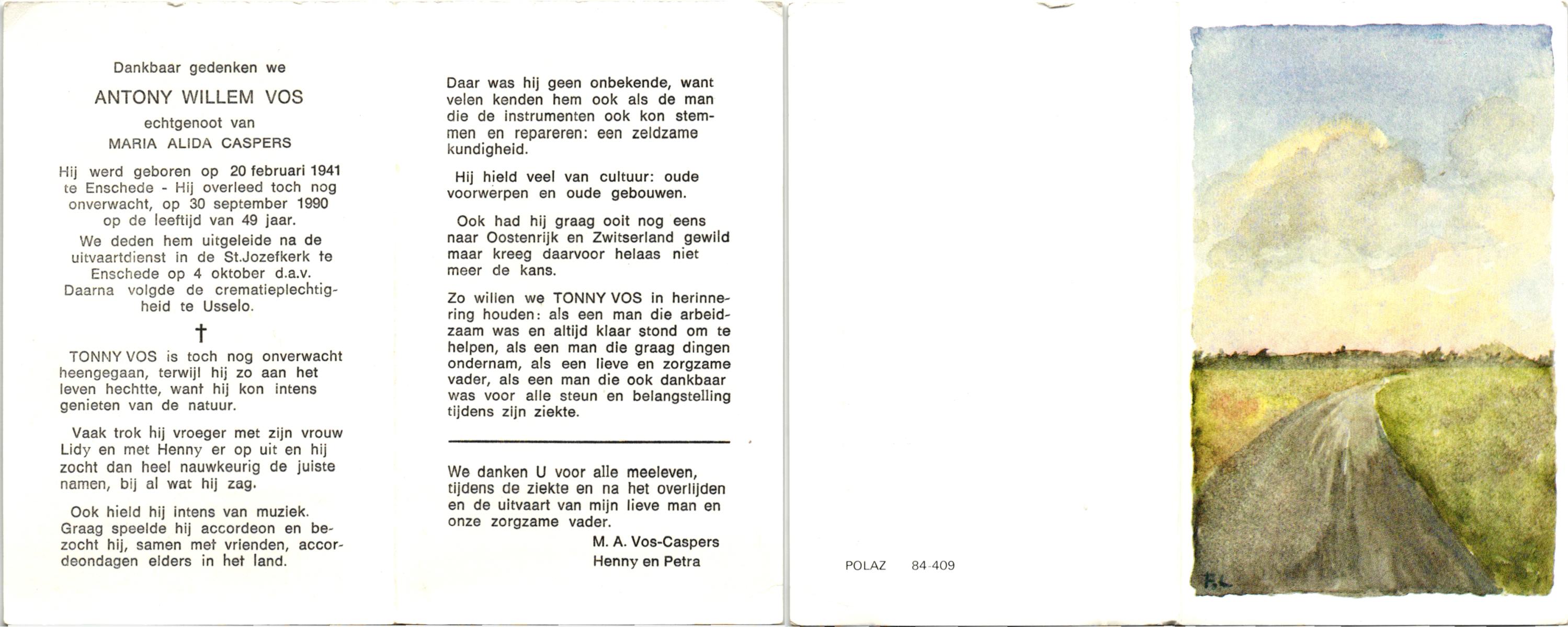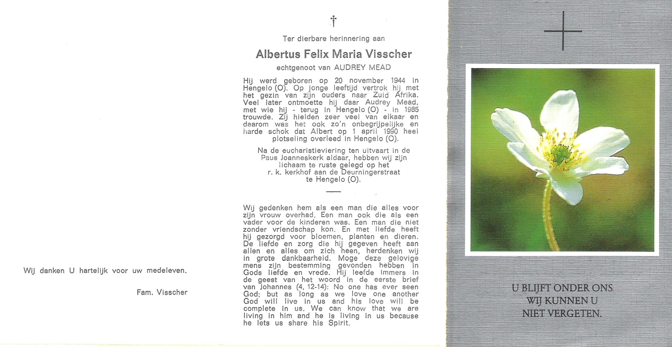 VISSCHER, Albertus Felix Maria, geboren op 20-11-1944 te Hengelo (O), overleden op 1-4-1990 te Hengelo (Ov.) op 45-jarige leeftijd, begraven te Hengelo (Ov.).