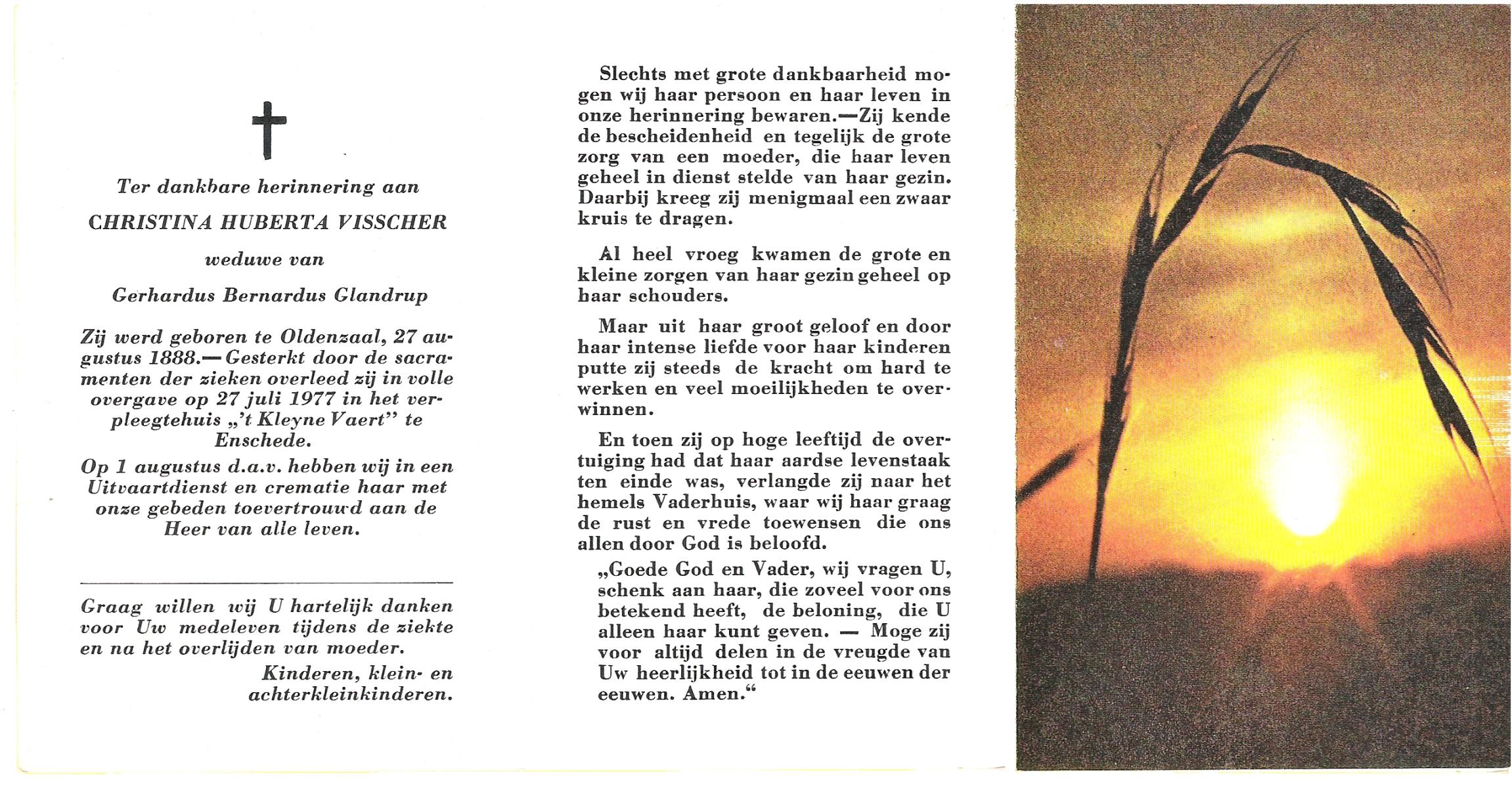 VISSCHER, Christina Huberta, geboren op 27-08-1888 te Oldenzaal, overleden op 27-7-1977 te Enschede op 88-jarige leeftijd, gecremeerd op 1-8-1977 te Usselo ?