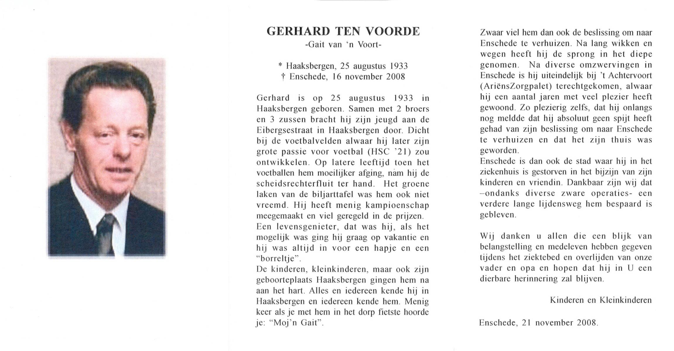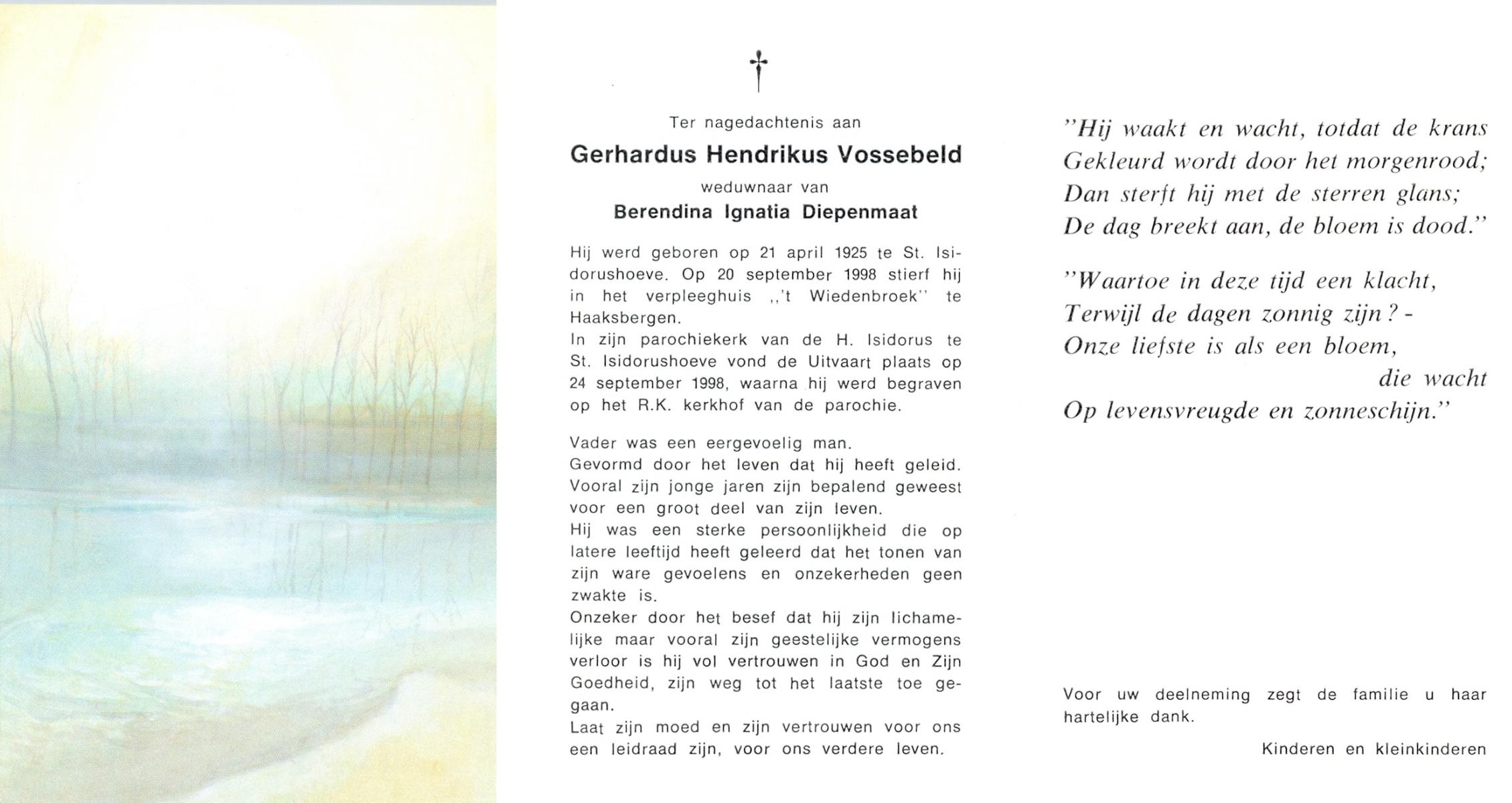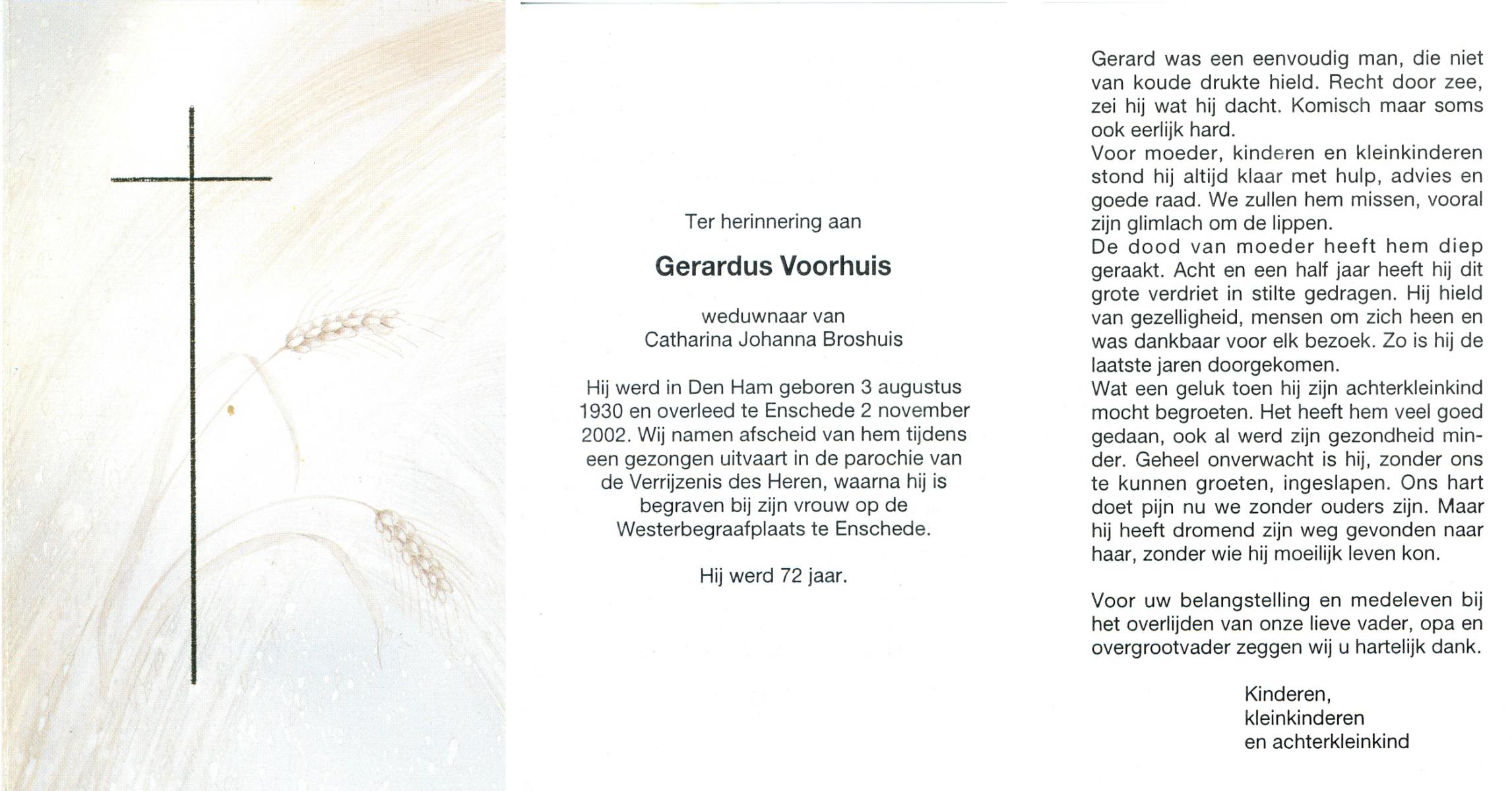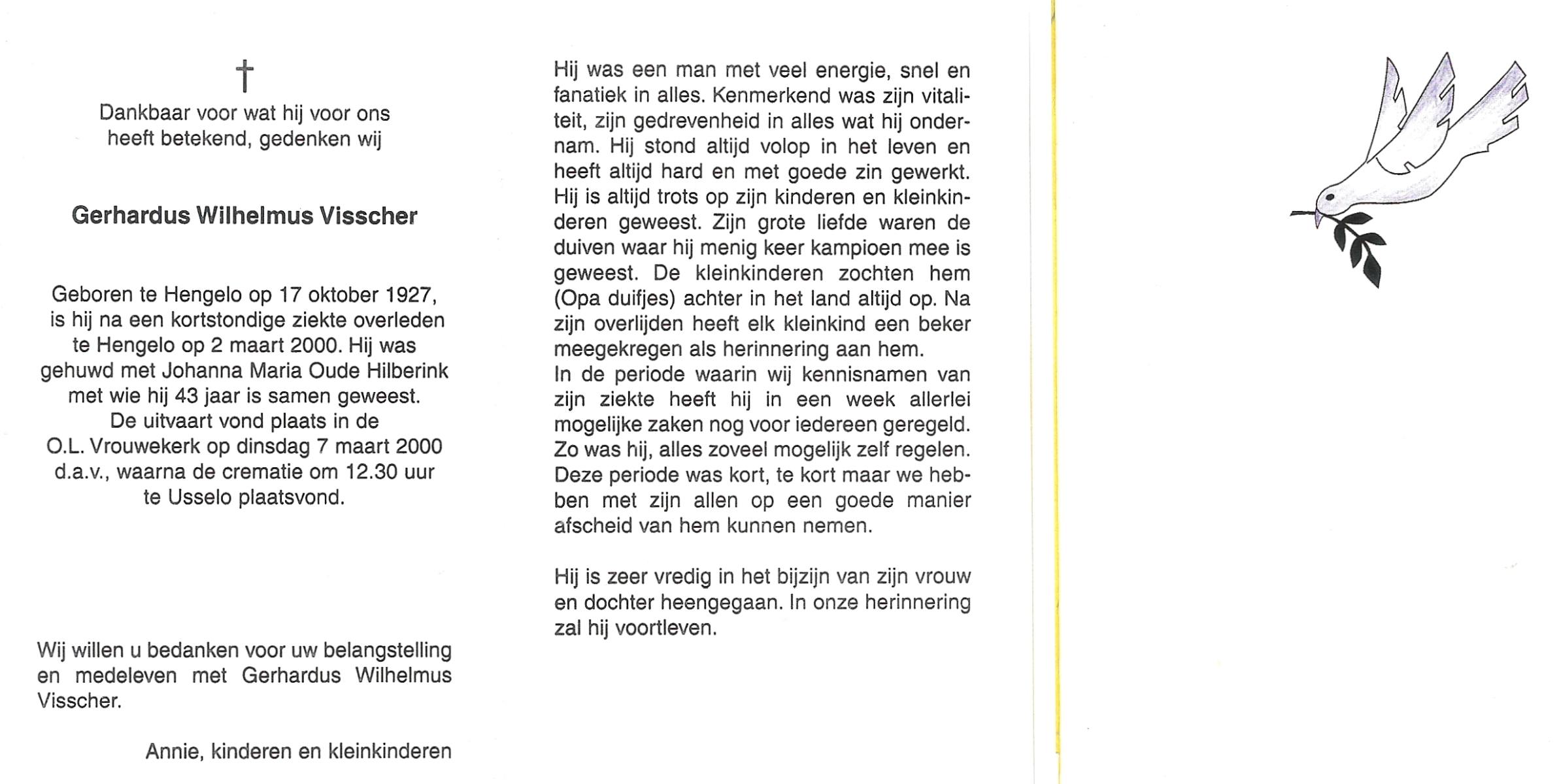 VISSCHER, Gerhardus Wilhelmus, geboren op 17-10-1927 te Hengelo (O), overleden op 2-3-2000 te Hengelo (Ov.) op 72-jarige leeftijd, gecremeerd op 7-3-2000 te Usselo.