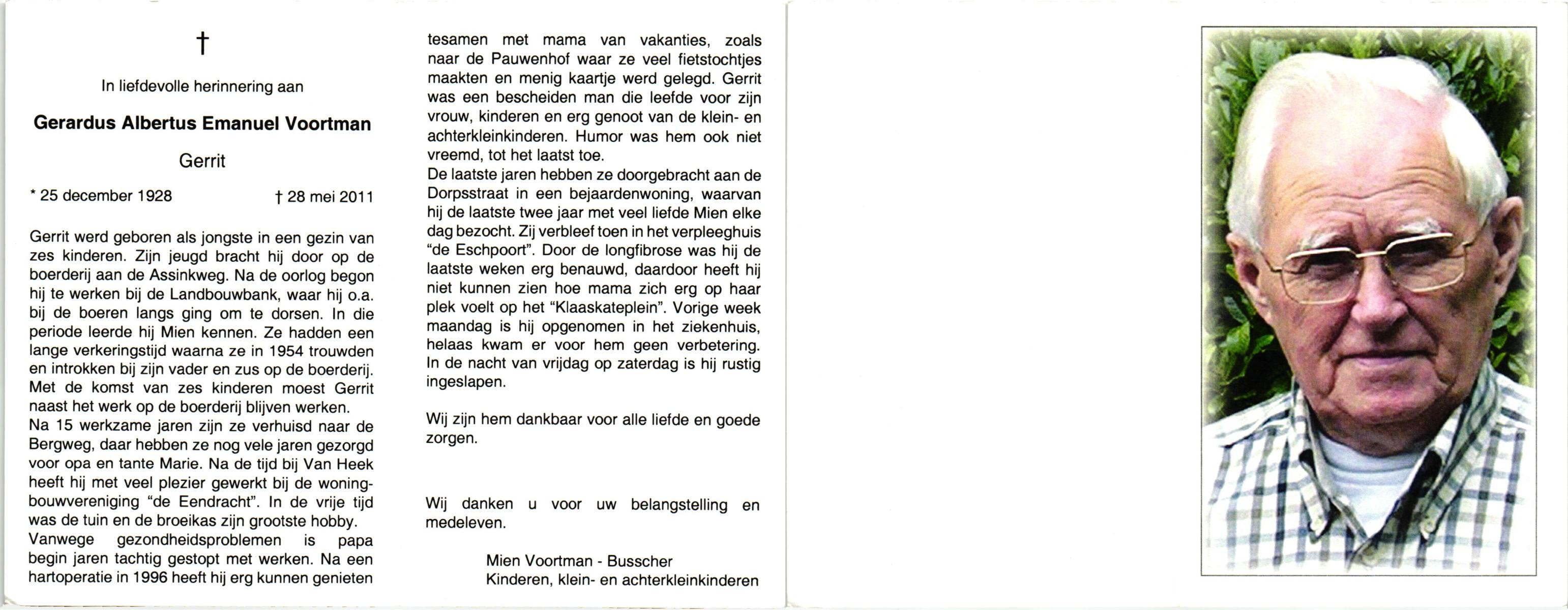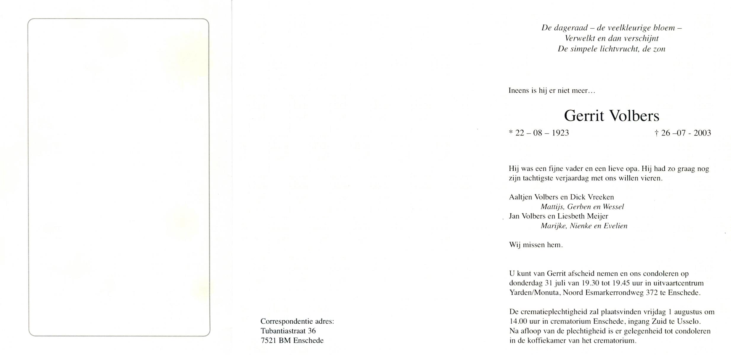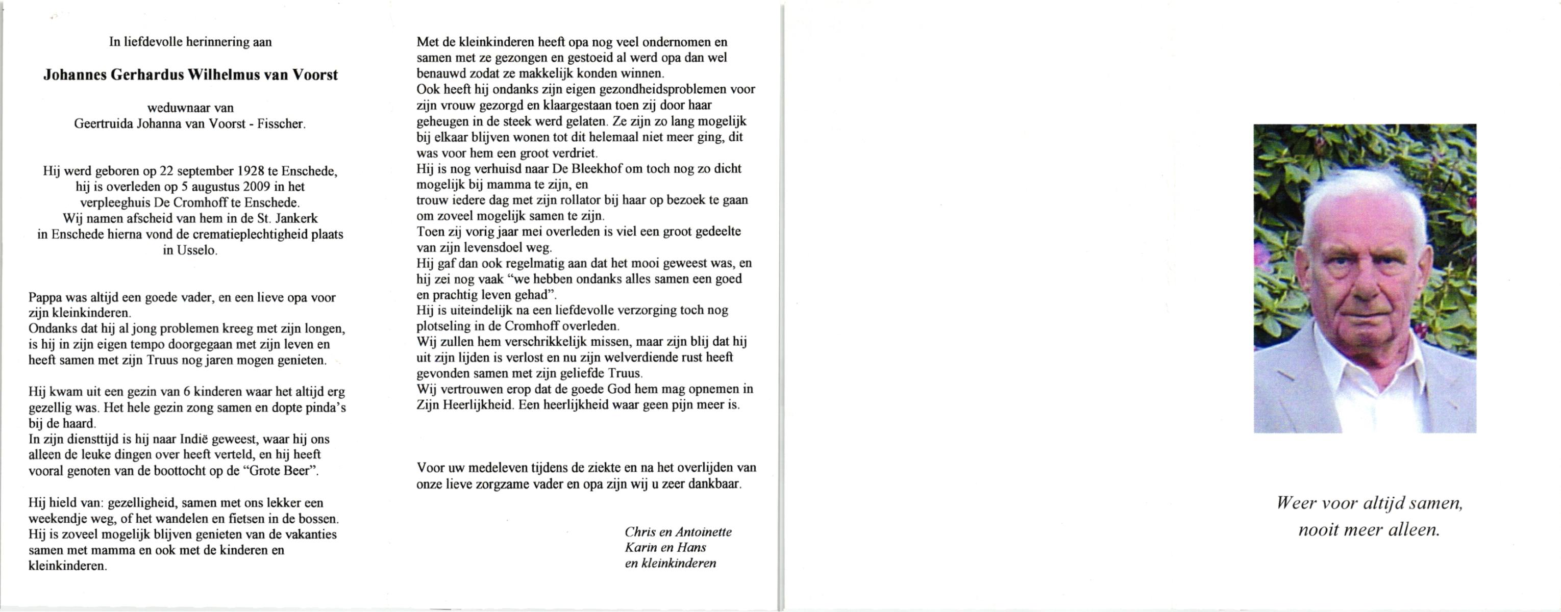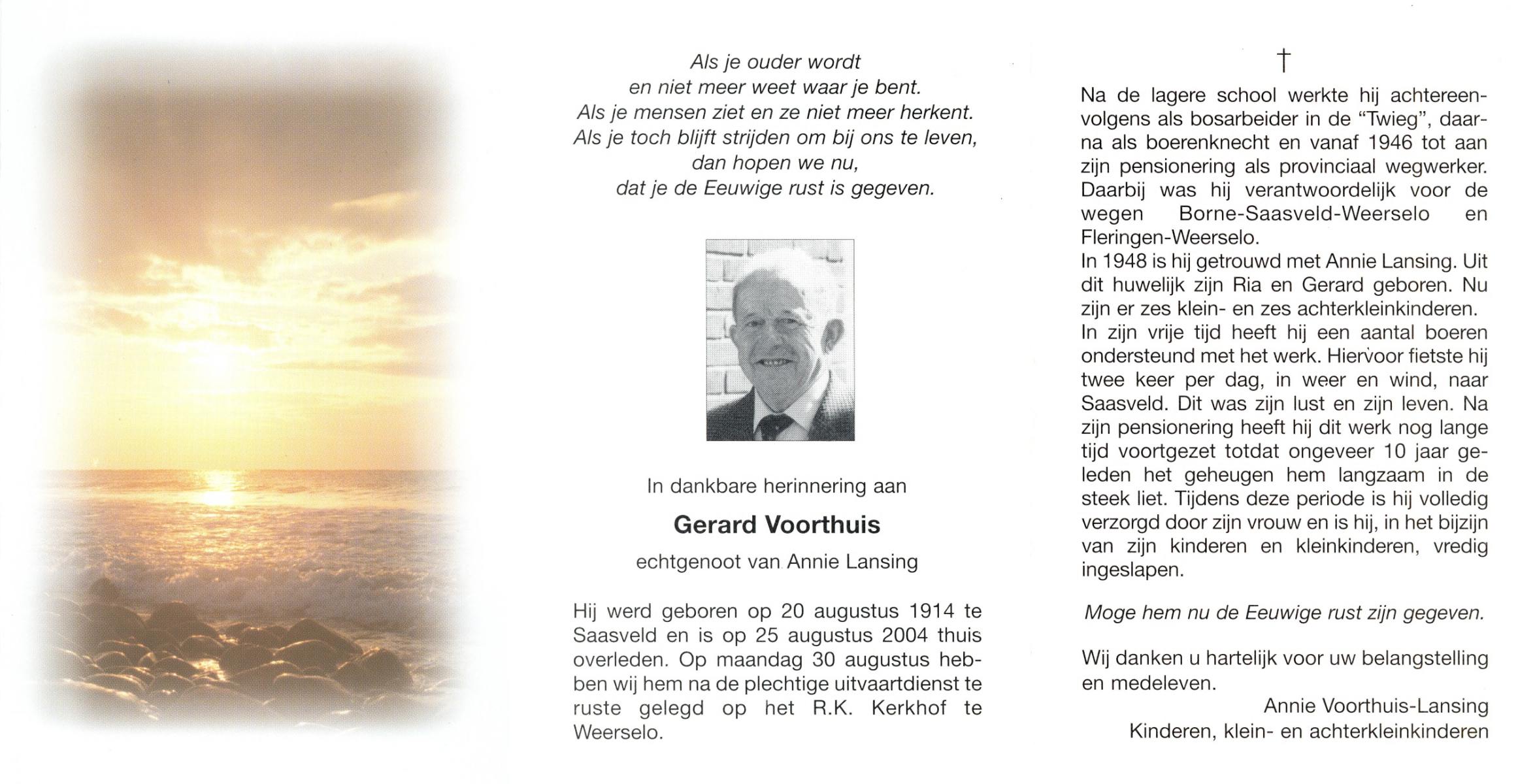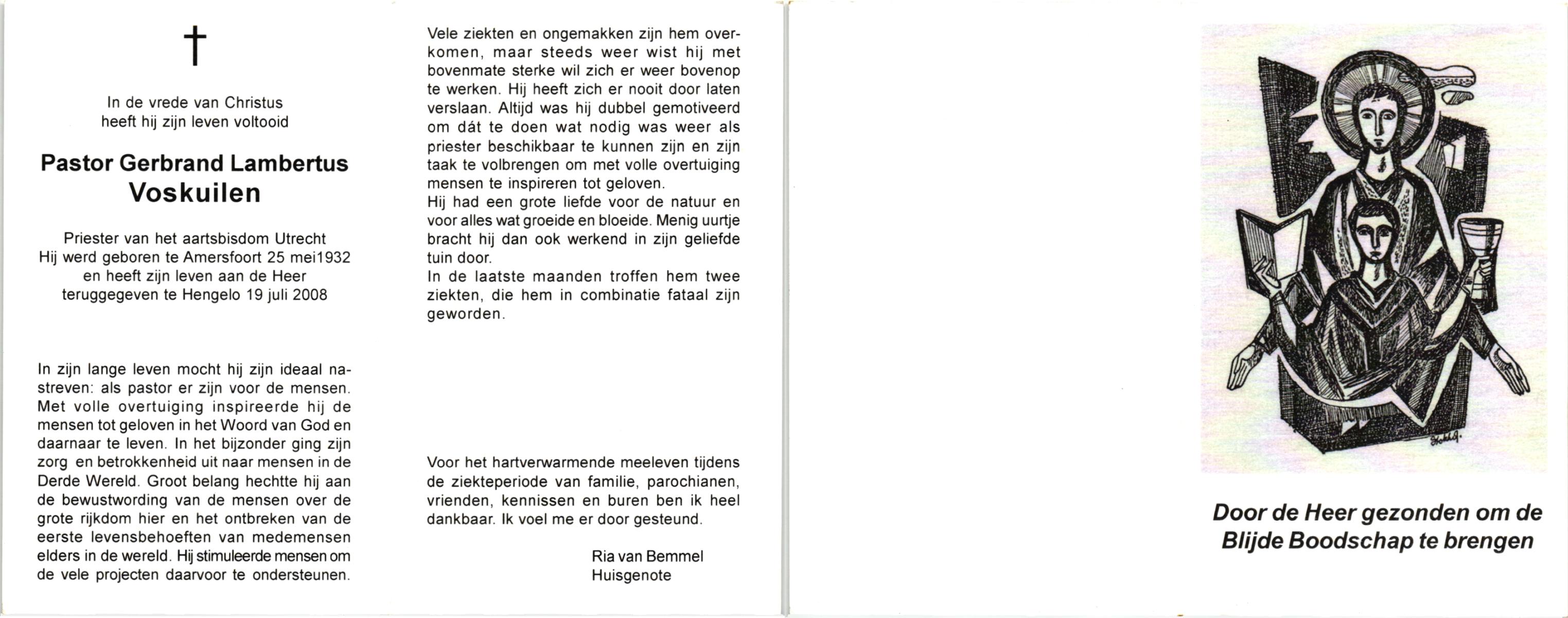 VISSCHER, Gerhardus Wilhelmus, geboren op 17-10-1927 te Hengelo (O), overleden op 2-3-2000 te Hengelo (Ov.) op 72-jarige leeftijd, gecremeerd op 7-3-2000 te Usselo.