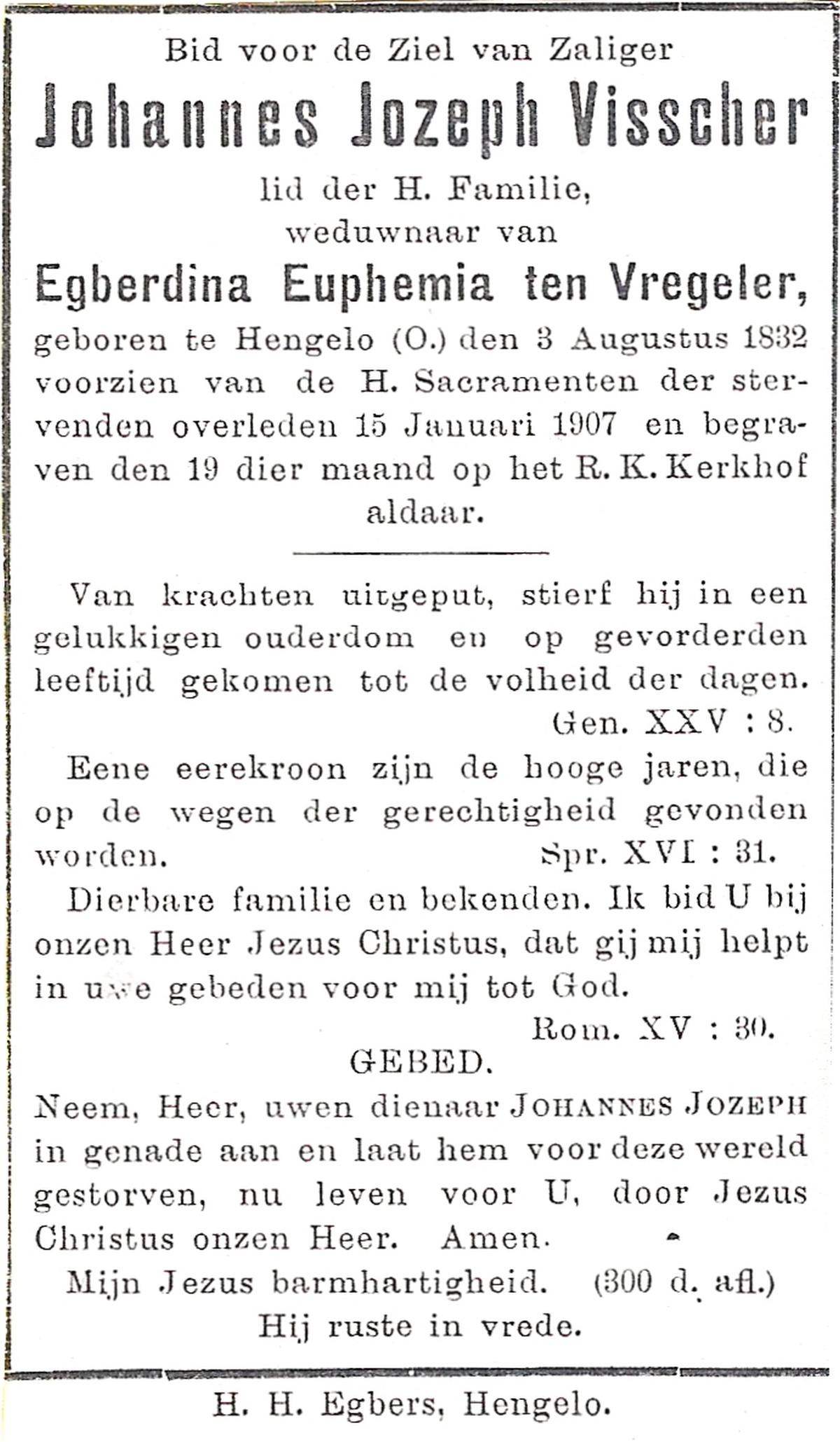 VISSCHER, Johannes Jozeph, geboren op 03-08-1832 te Hengelo (O), overleden op 15-1-1907 op 74-jarige leeftijd, begraven op 19-1-1907.