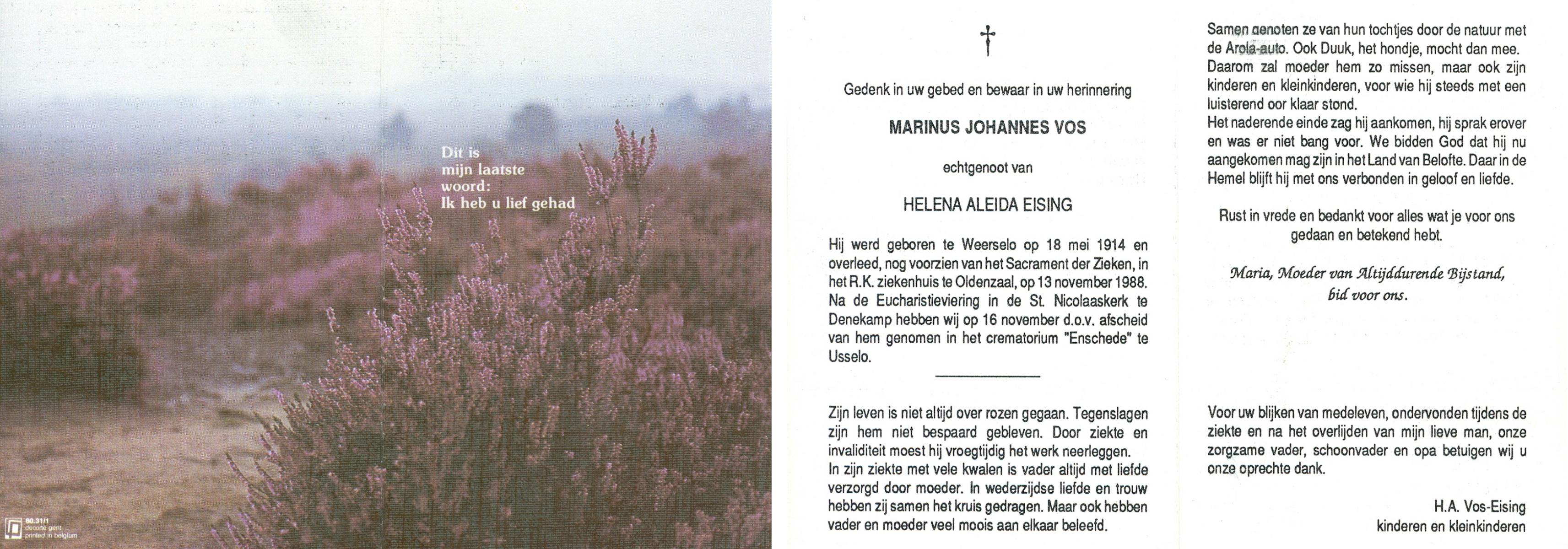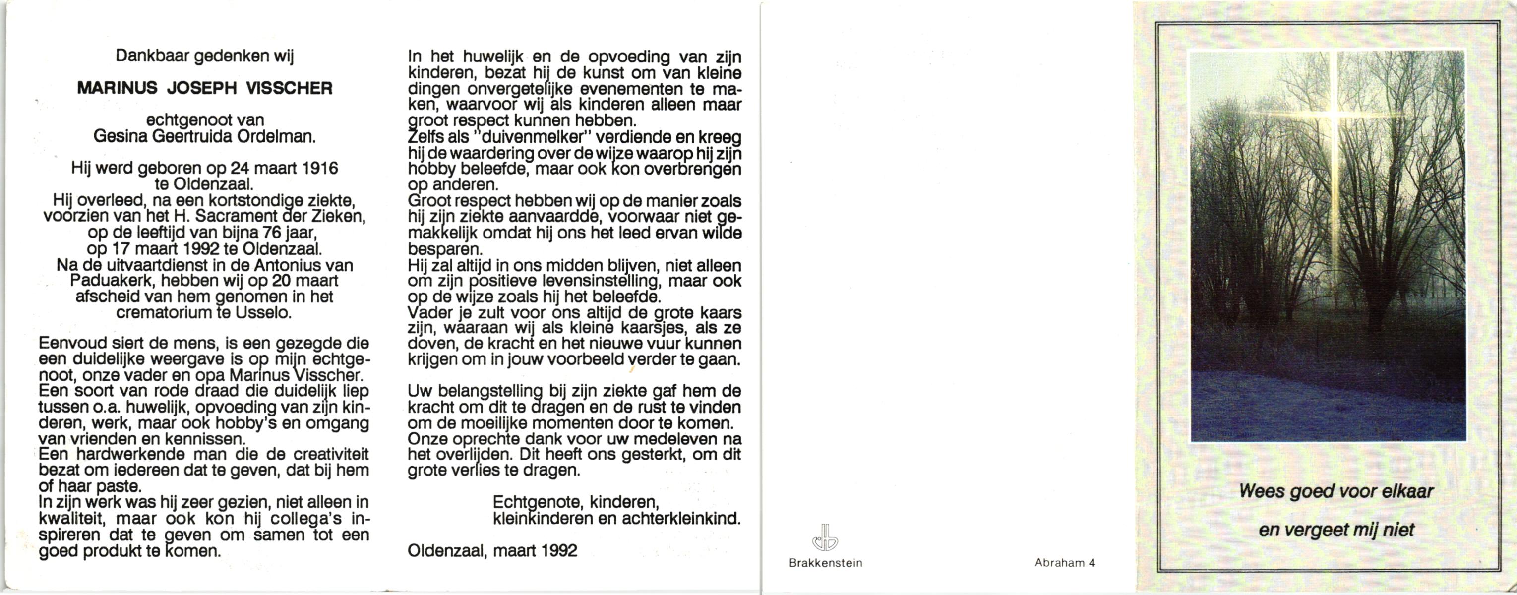 VISSCHER, Marinus Joseph, geboren op 24-3-1916 te Oldenzaal, overleden op 17-3-1992 te Oldenzaal op 75-jarige leeftijd, gecremeerd op 20-3-1992 te Usselo.