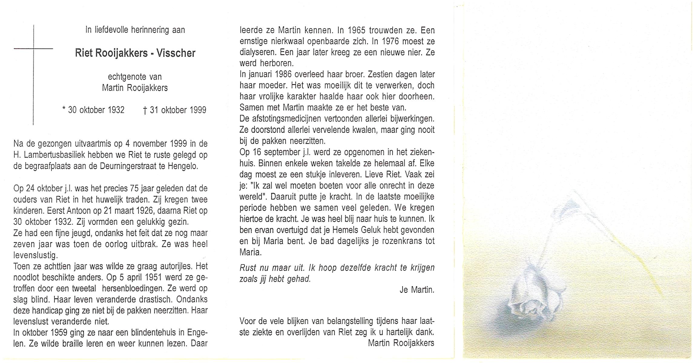 VISSCHER, Riet, geboren op 30-10-1932, overleden op 31-10-1999 op 67-jarige leeftijd.