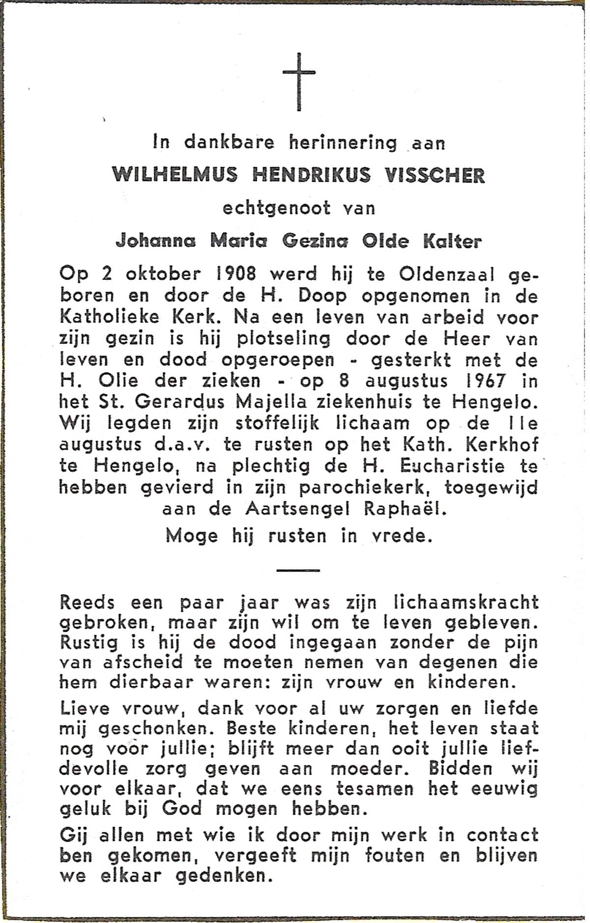 VISSCHER, Wilhelmus Hendrikus, geboren op 2-10-1908 te Oldenzaal, overleden op 8-8-1967 te Hengelo (Ov.) op 58-jarige leeftijd, begraven op 11-8-1967 te Hengelo (Ov.).