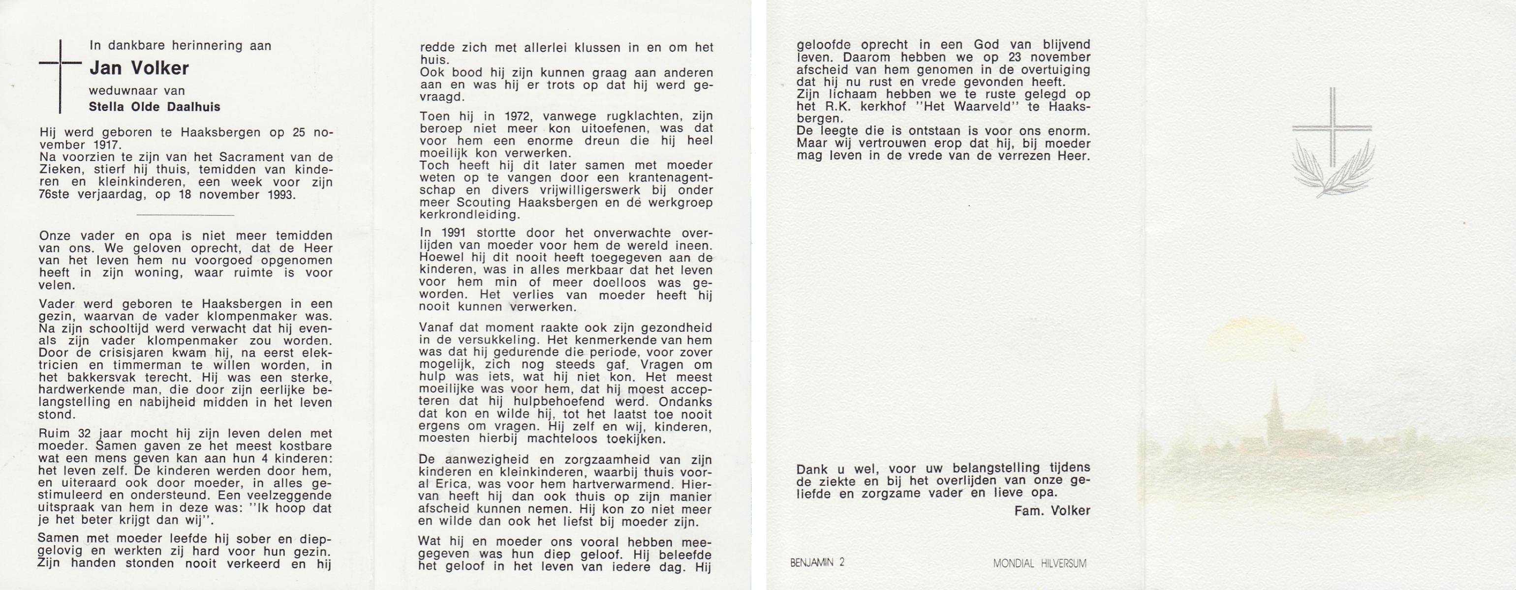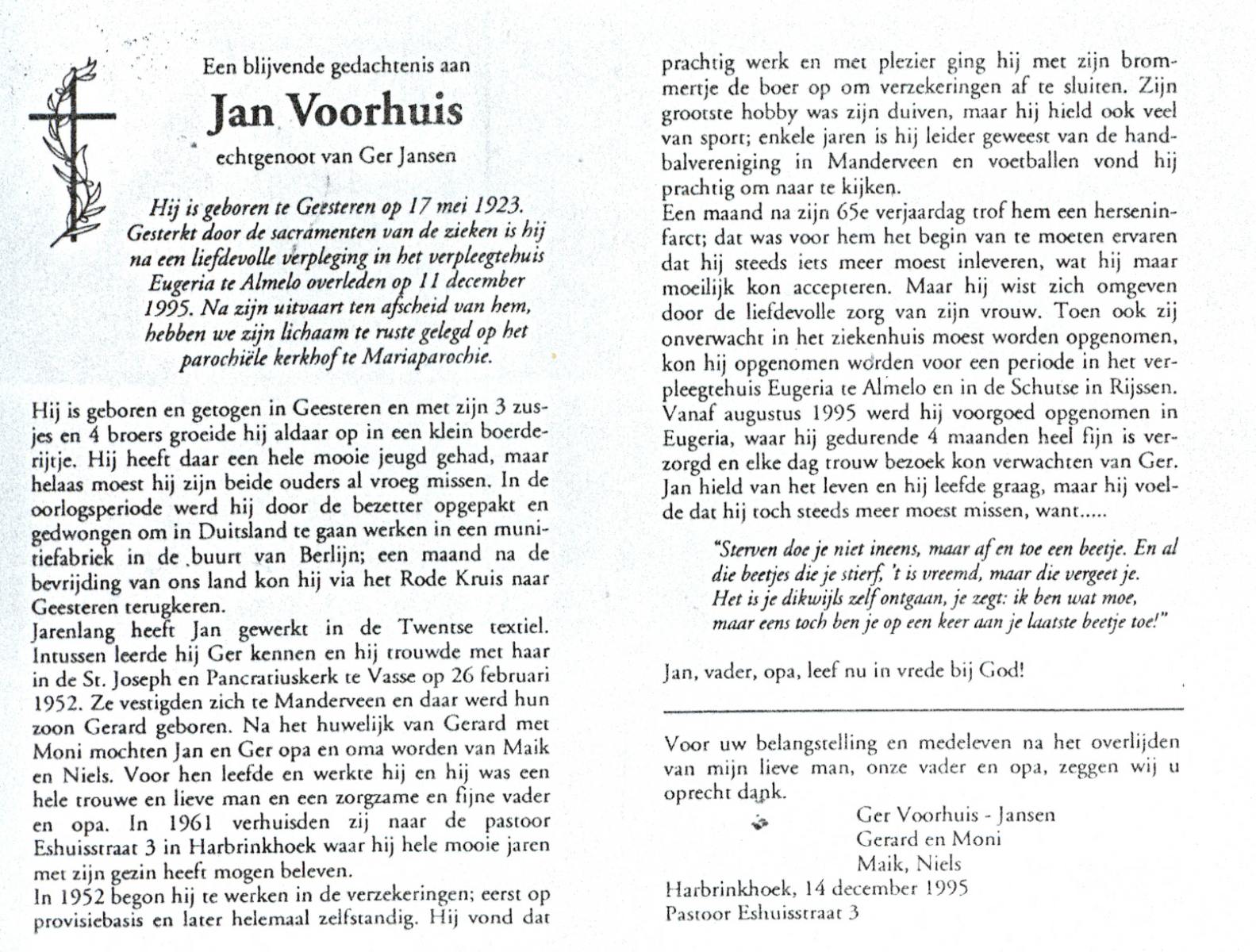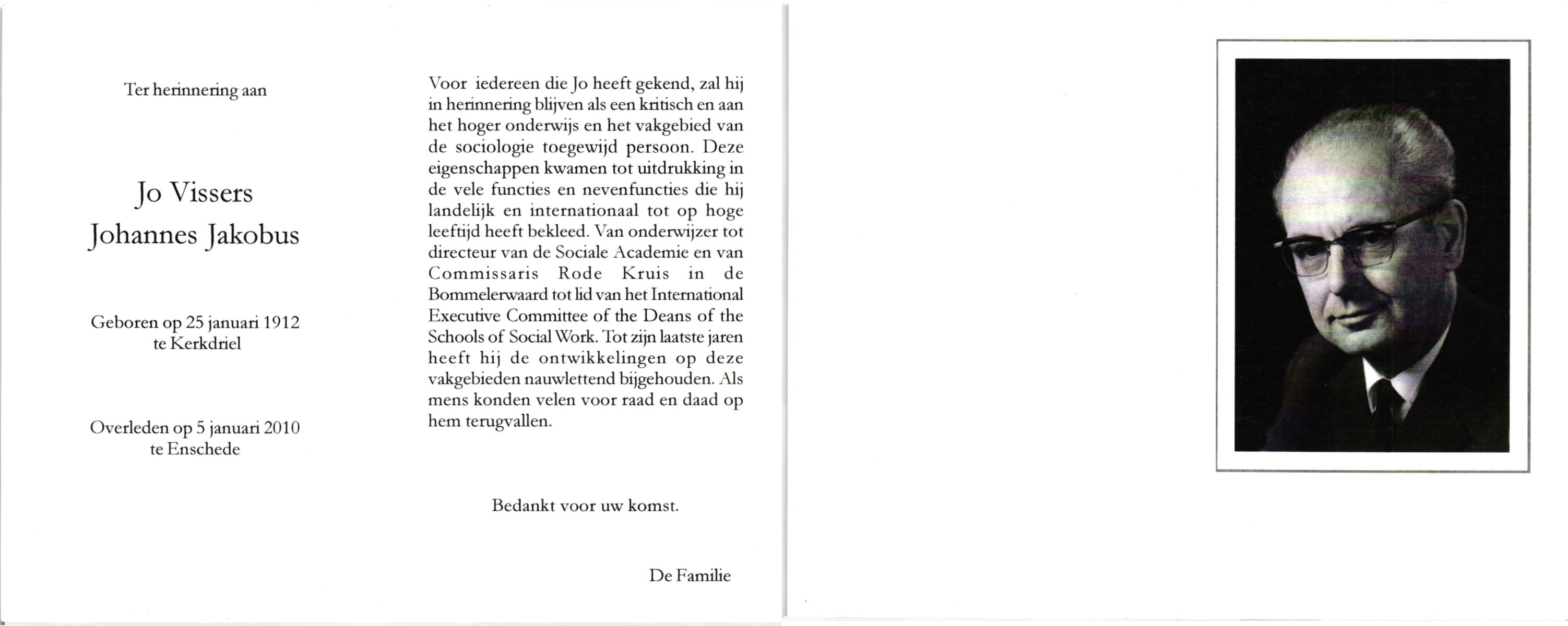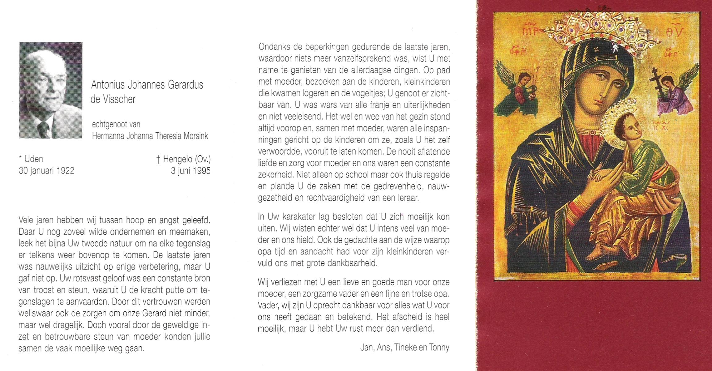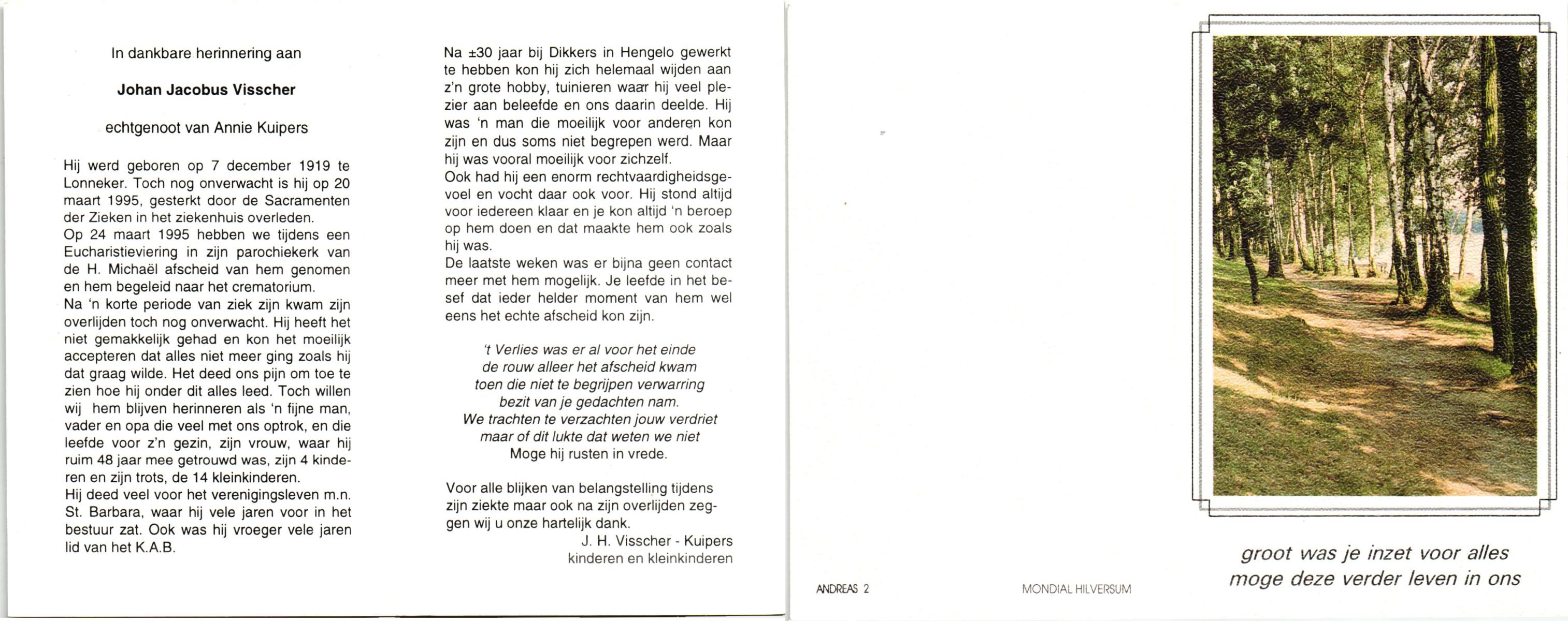 VISSCHER, Johan Jacobus, geboren op 7-12-1919 te Lonneker, overleden op 20-3-1995 te Enschede, ziekenhuis op 75-jarige leeftijd.
