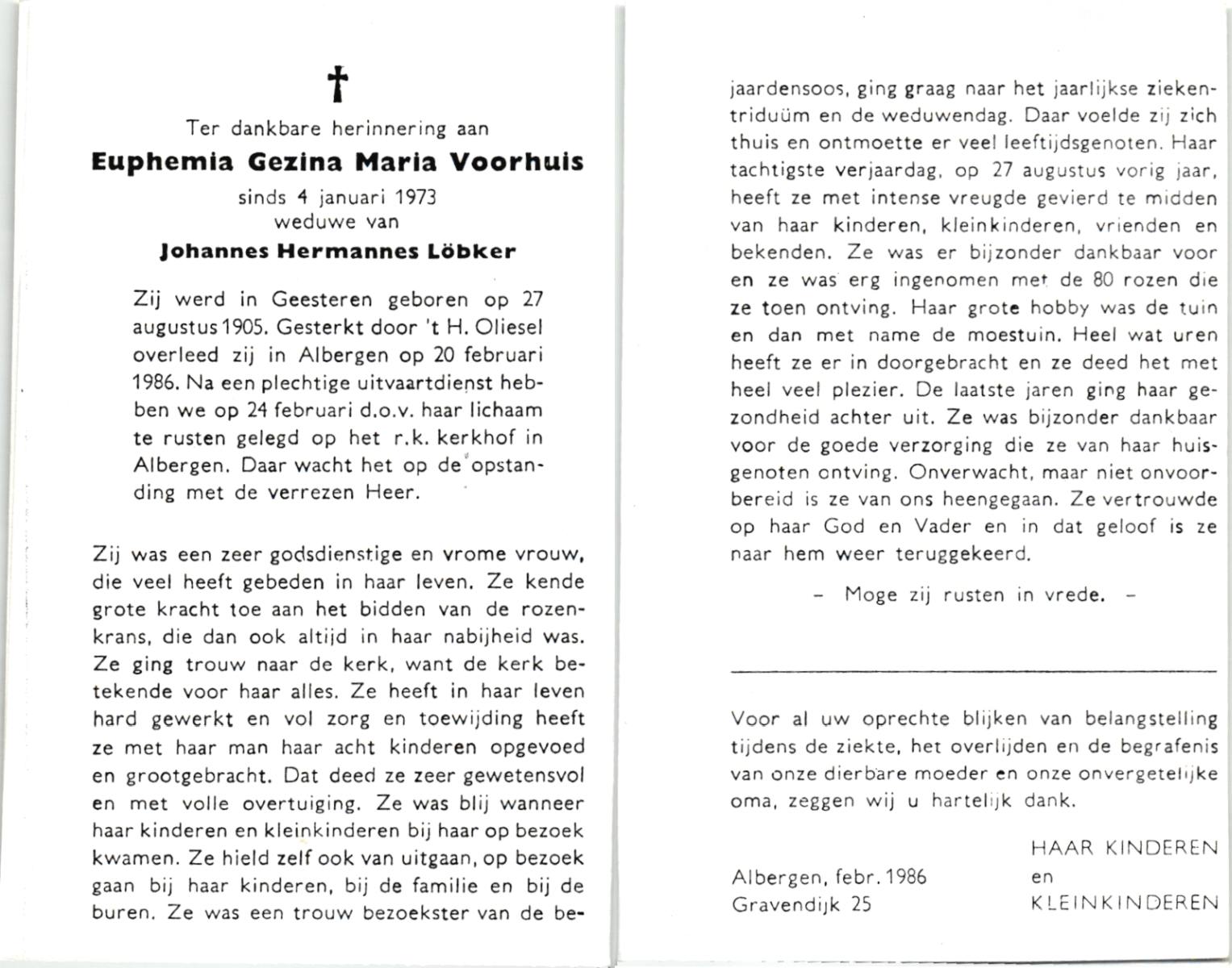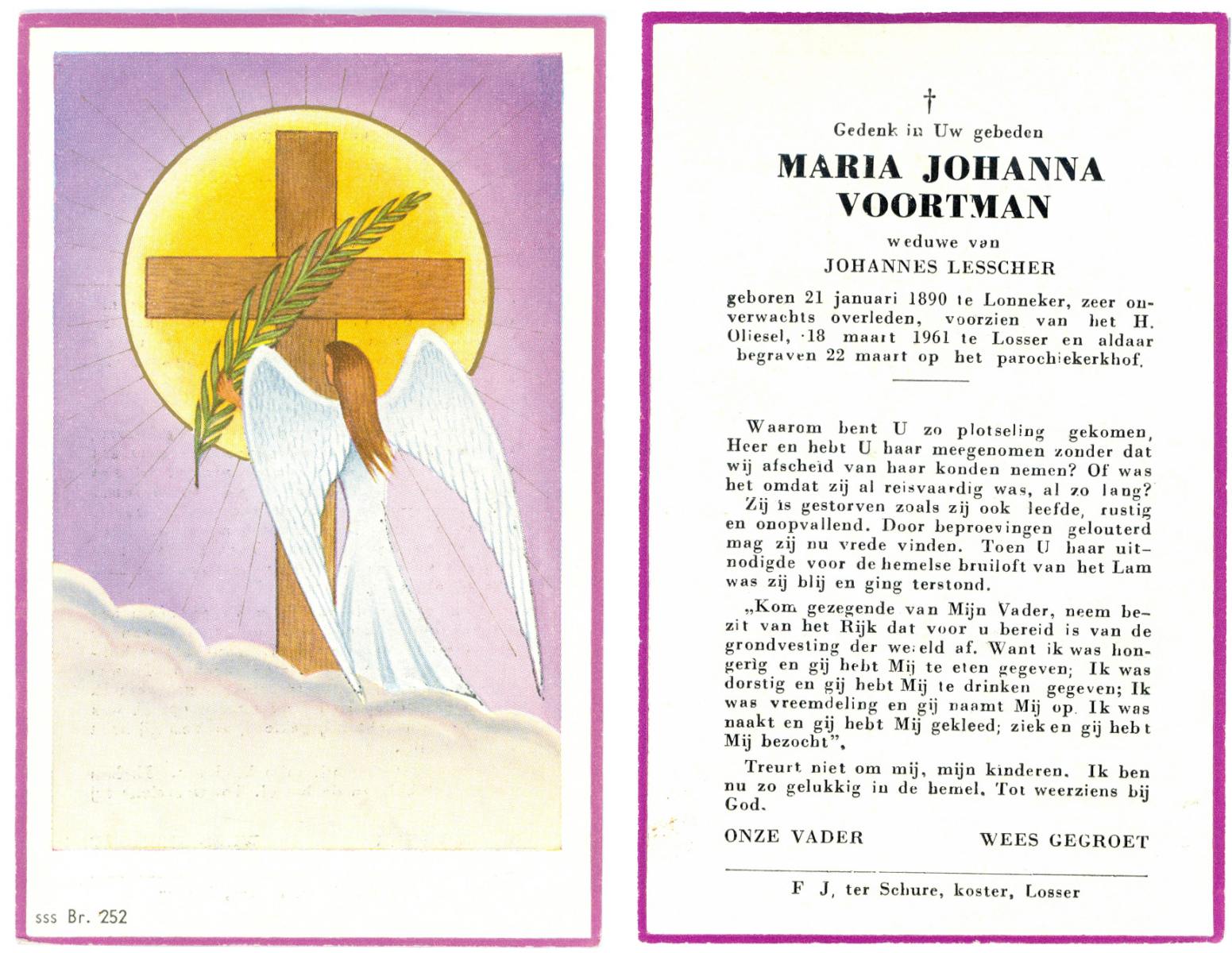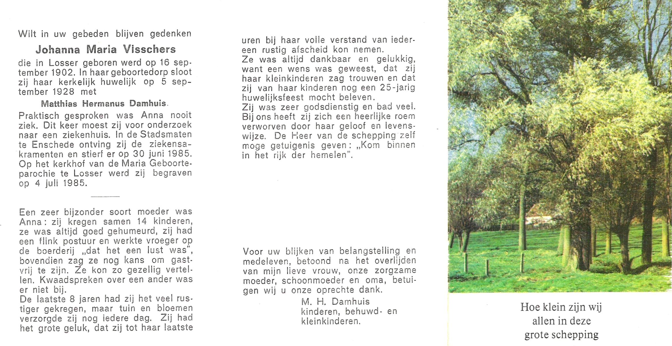 VISSCHERS, Johanna Maria, geboren op 16-9-1902 te Losser, overleden op 30-6-1985 te Enschede op 82-jarige leeftijd, begraven op 4-7-1985 te Losser.