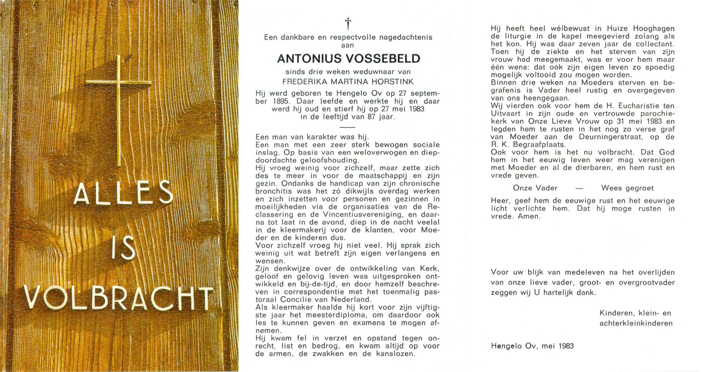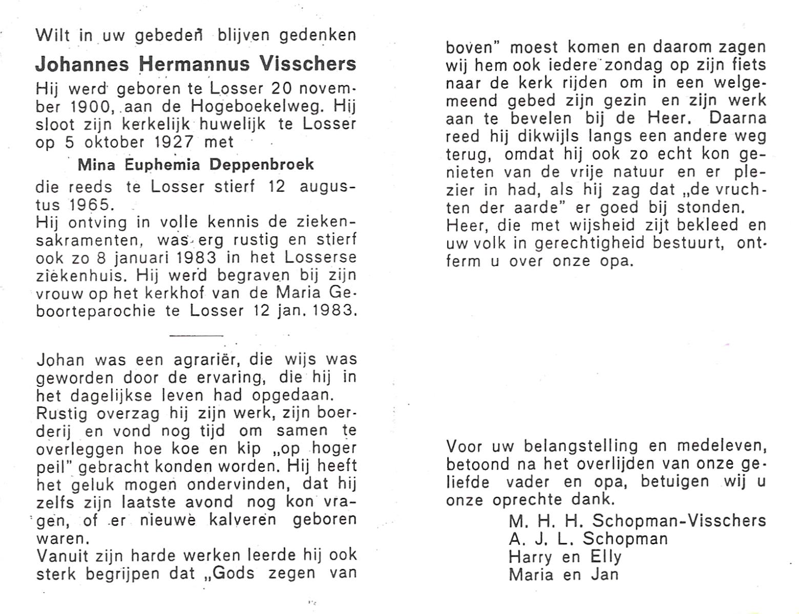 VISSCHERS, Johannes Hermannus, geboren op 20-11-1900 te Losser, overleden op 8-1-1983 te Losser op 82-jarige leeftijd, begraven op 12-1-1983 te Losser.