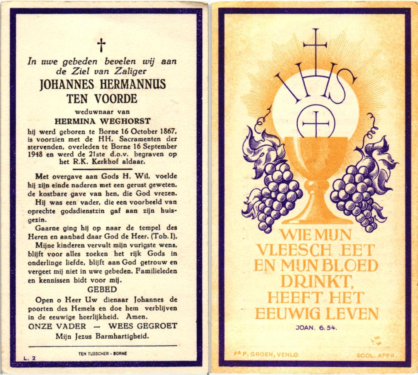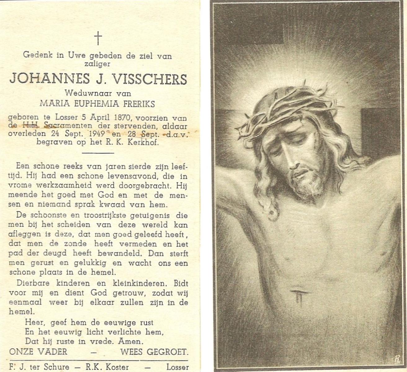 VISSCHERS, Johannes J., geboren op 05-04-1870 te Losser, overleden op 24-9-1949 te Losser op 79-jarige leeftijd, begraven op 28-9-1949 te Losser.