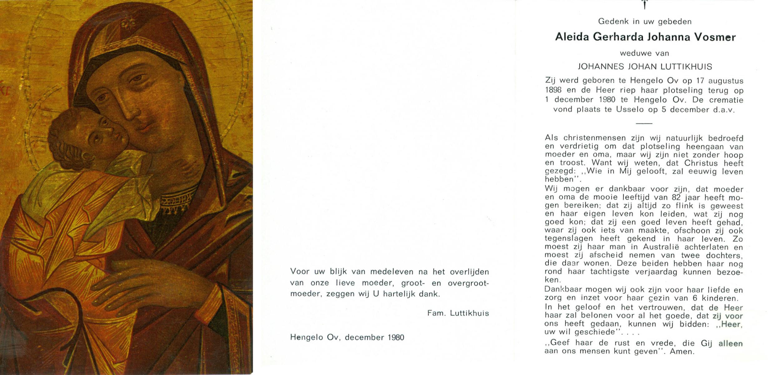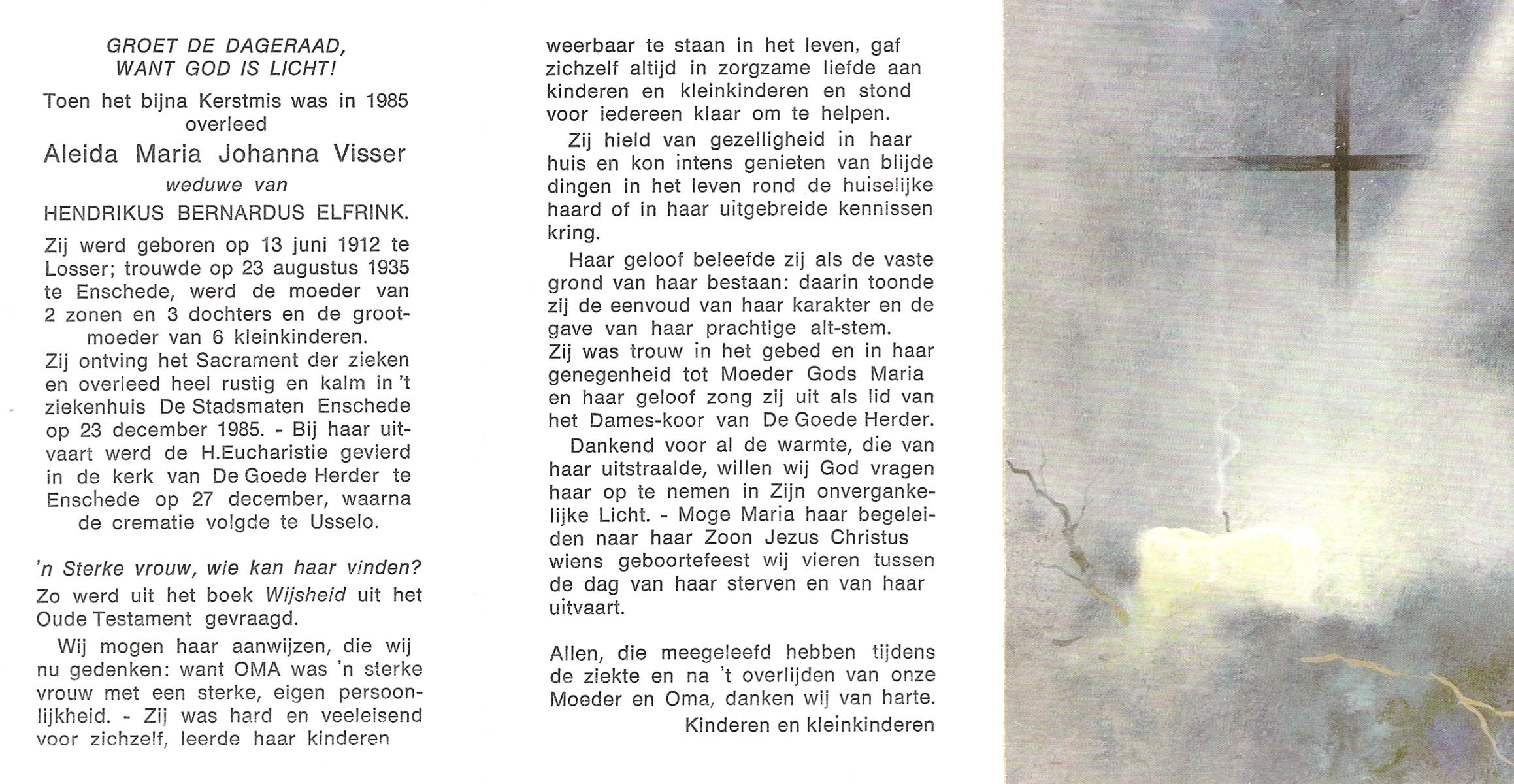 VISSER, Aleida Maria Johanna, geboren op 13-6-1912 te Losser, overleden op 23-12-1985 te Enschede op 73-jarige leeftijd, gecremeerd op 27-12-1985 te Usselo.