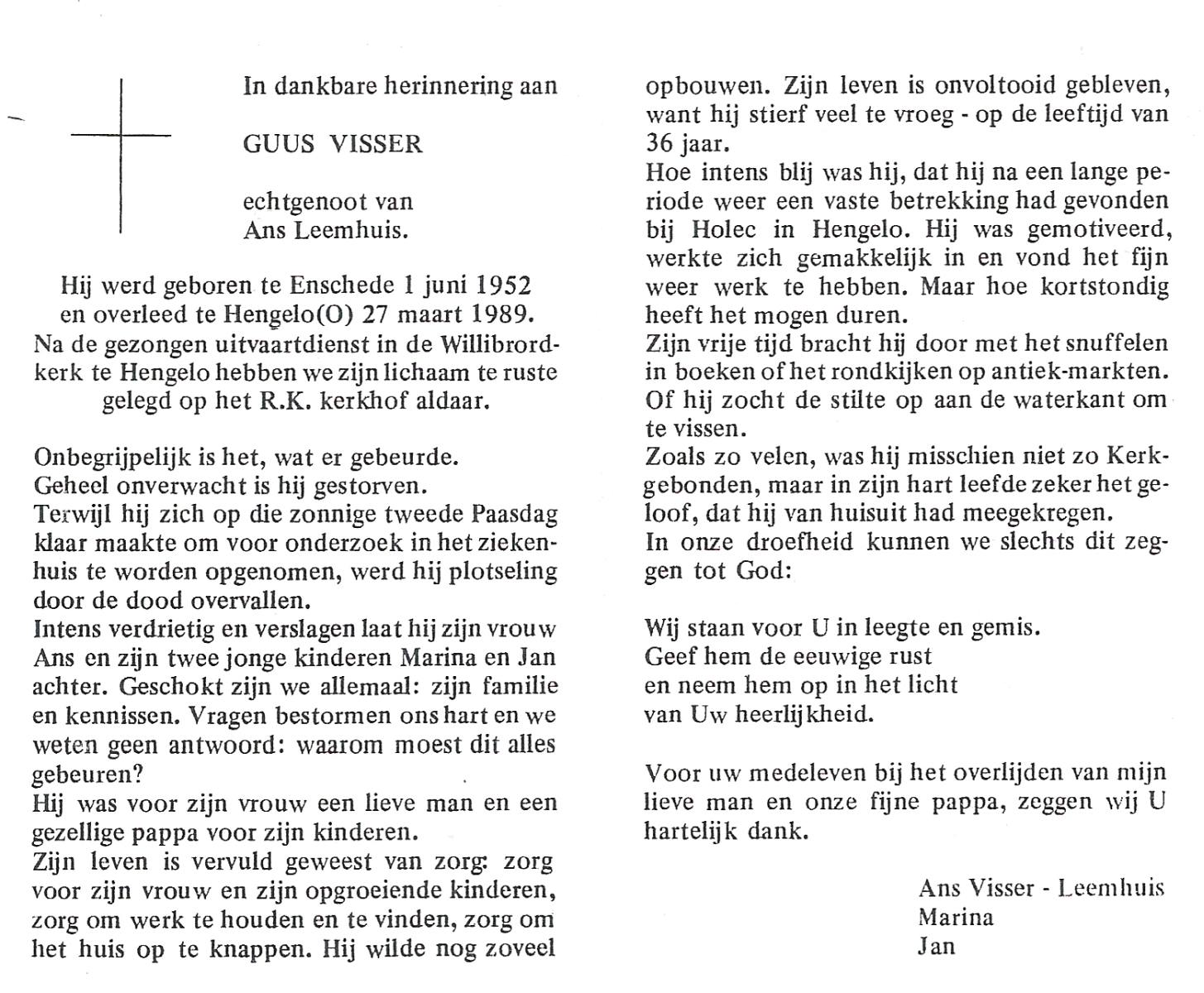 VISSER, Guus, geboren op 1-6-1952 te Enschede, overleden op 27-3-1989 te Hengelo (Ov.) op 36-jarige leeftijd, begraven te Hengelo (Ov.).