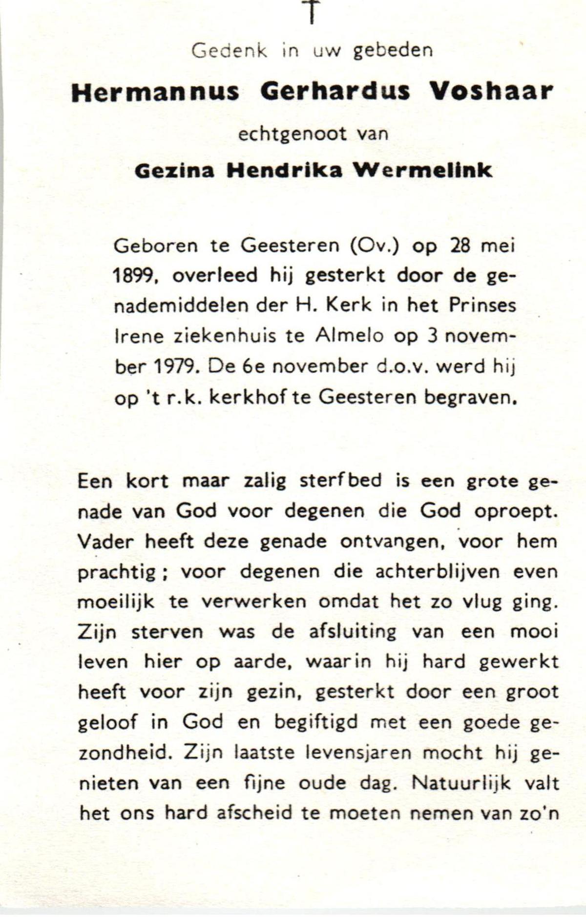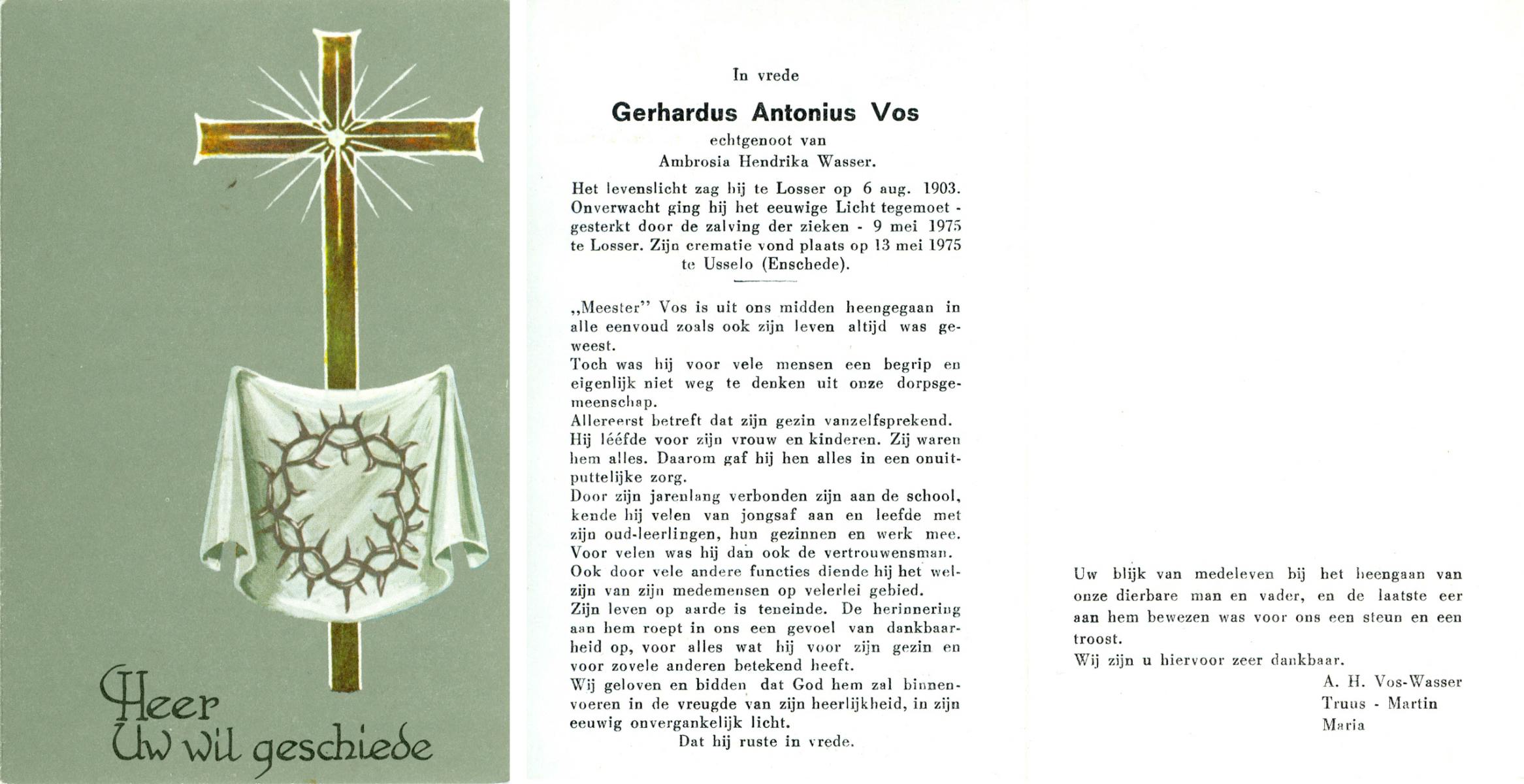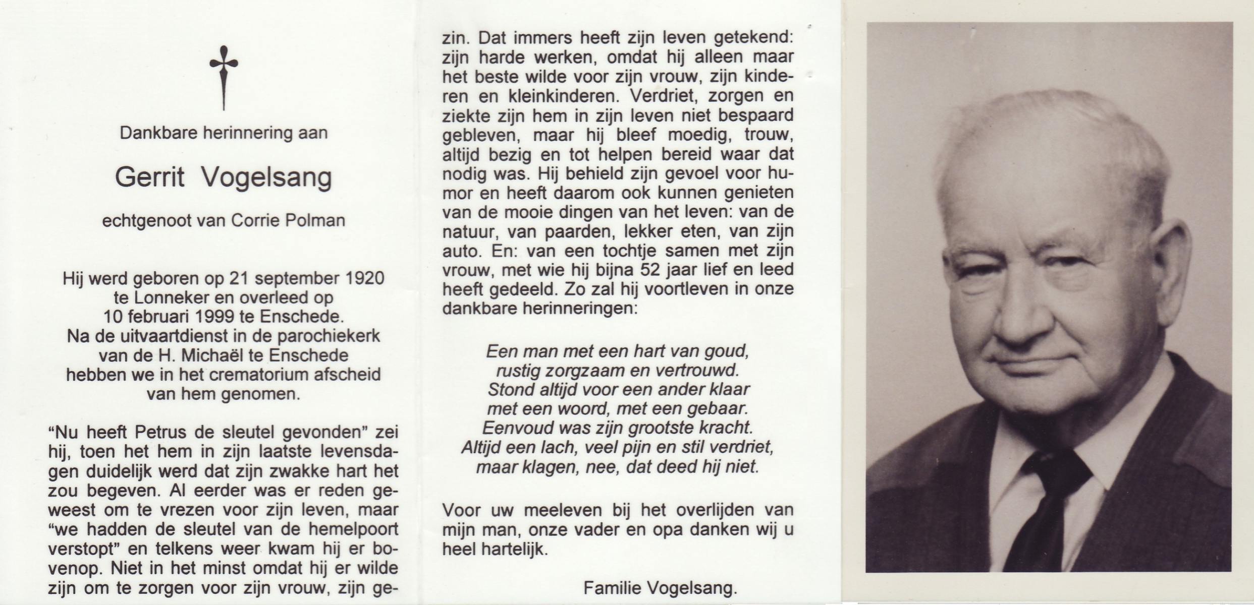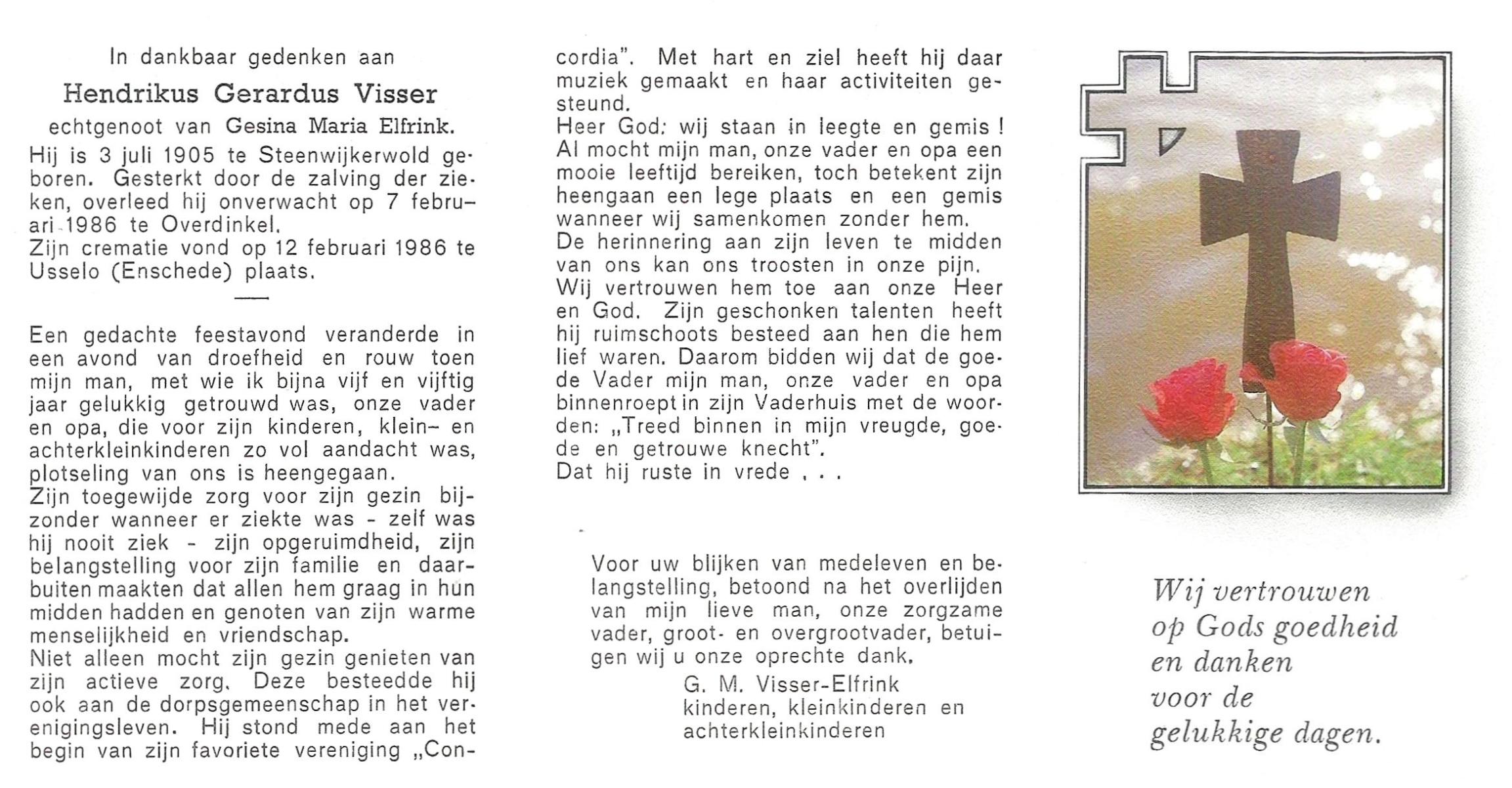 VISSER, Hendrikus Gerardus, geboren op 3-7-1905 te Steenwijkerwold, overleden op 7-2-1986 te Overdinkel op 80-jarige leeftijd, gecremeerd op 12-2-1986 te Usselo.