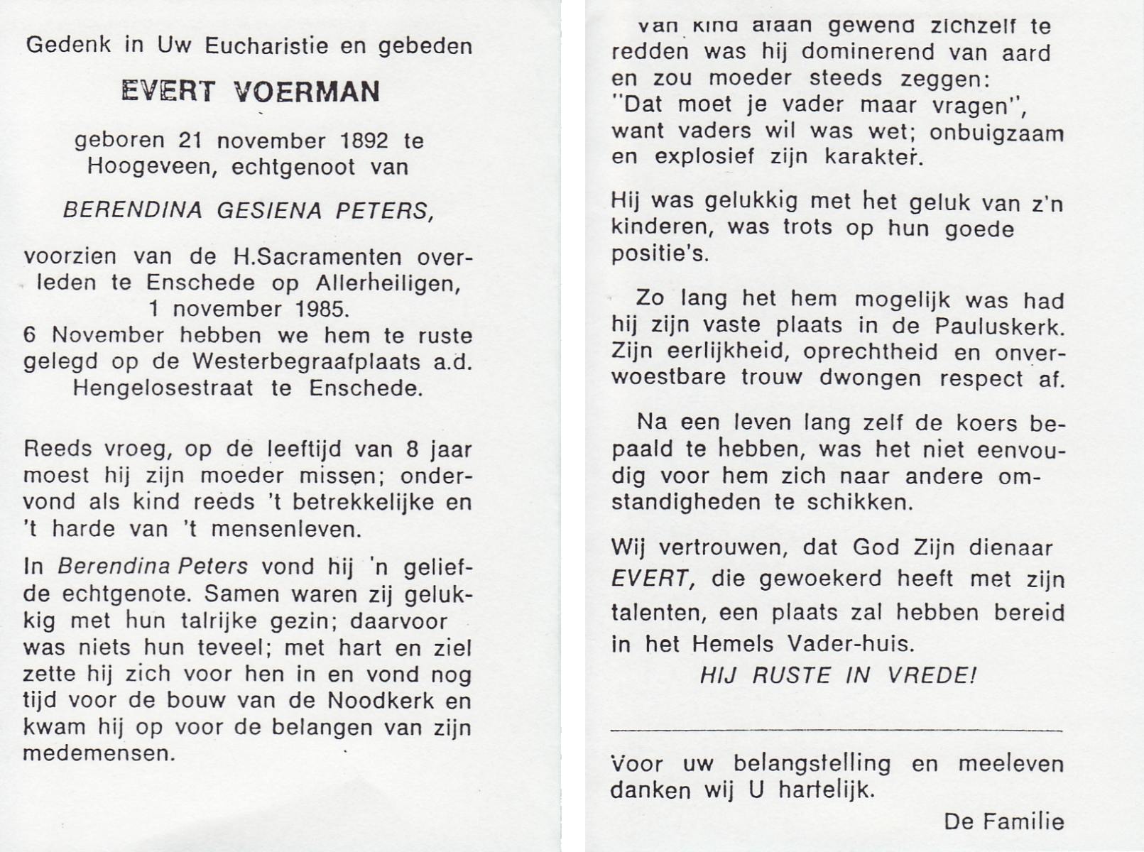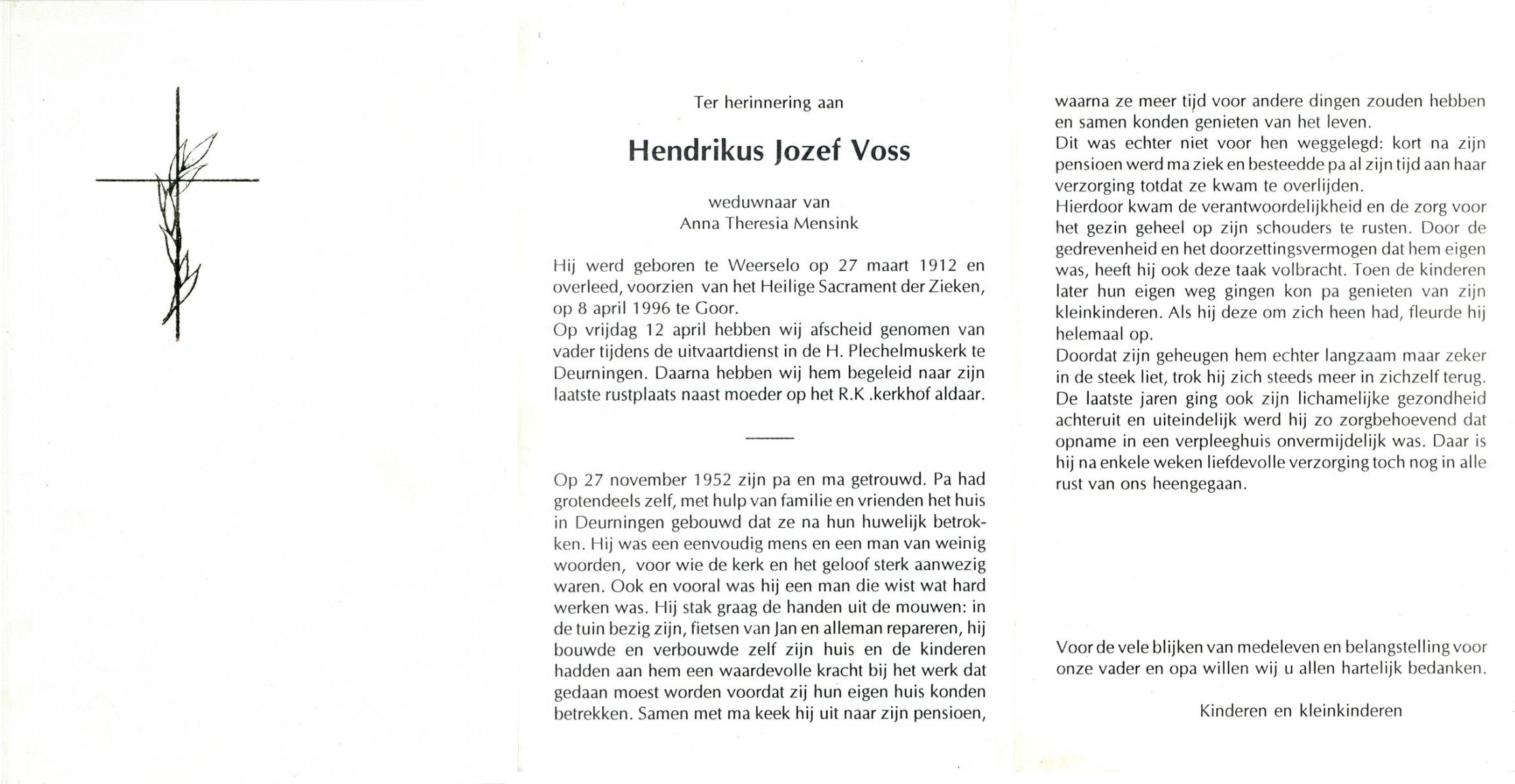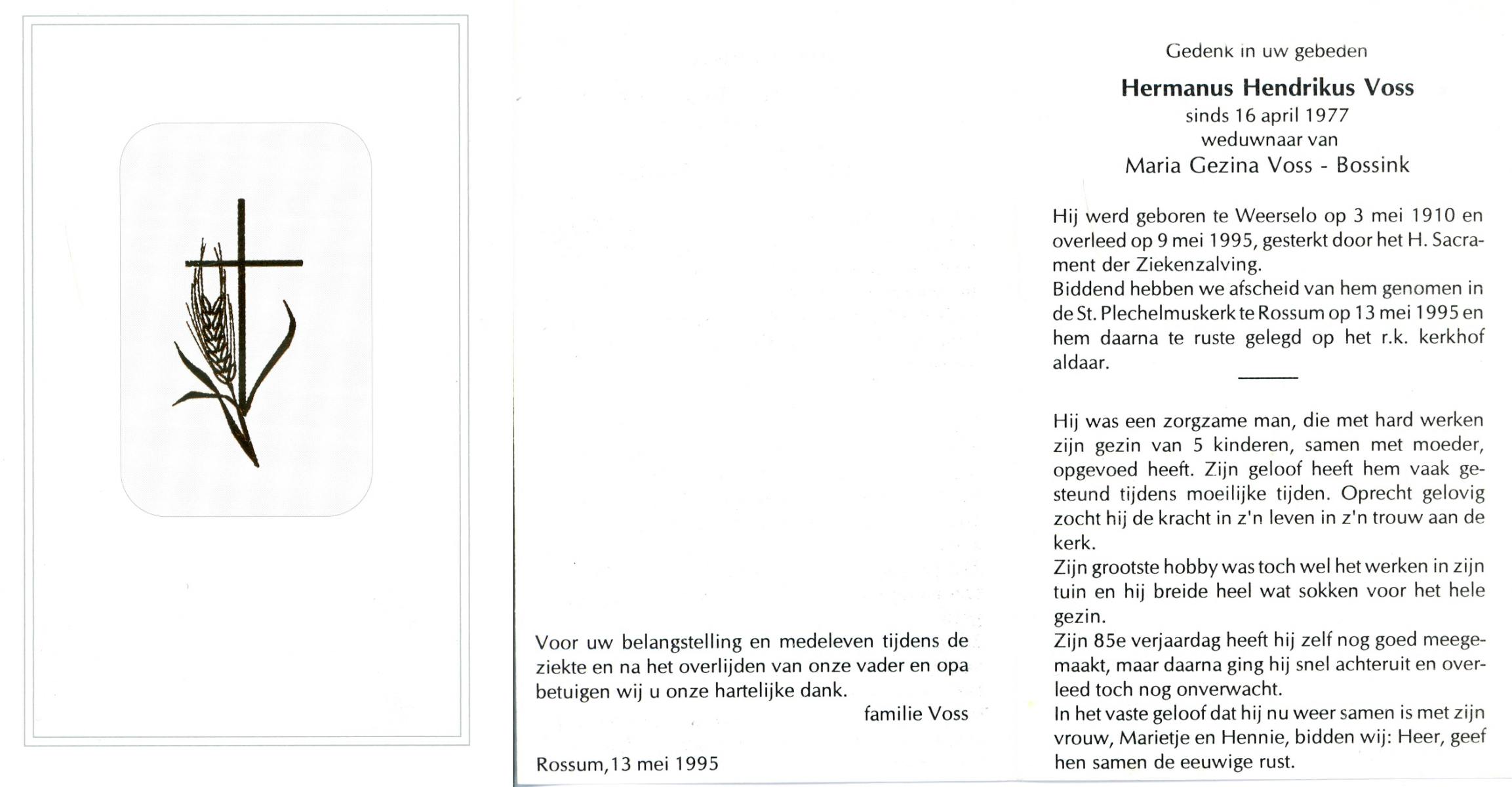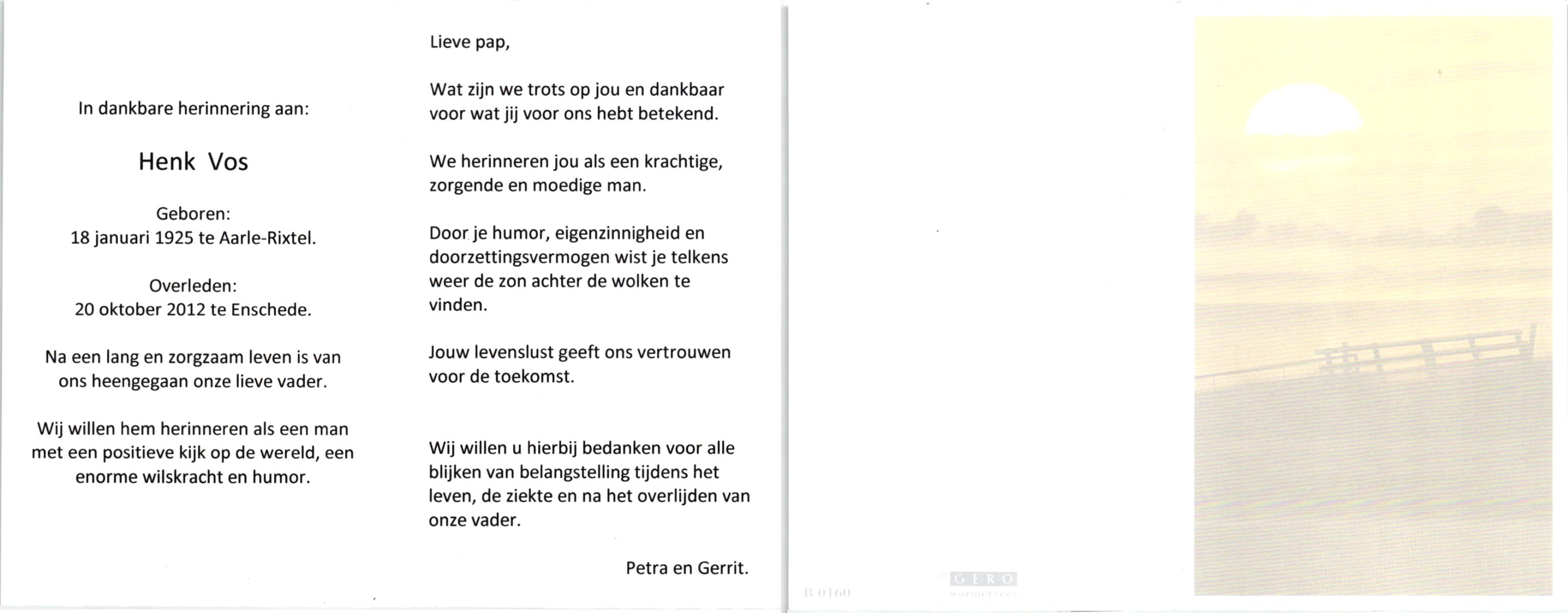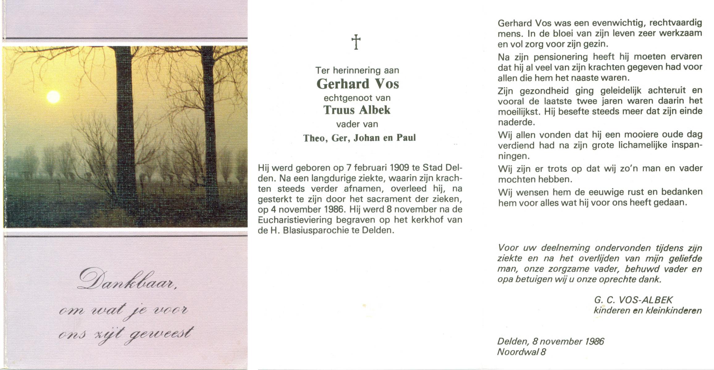 VISSER, Hendrikus Gerardus, geboren op 3-7-1905 te Steenwijkerwold, overleden op 7-2-1986 te Overdinkel op 80-jarige leeftijd, gecremeerd op 12-2-1986 te Usselo.