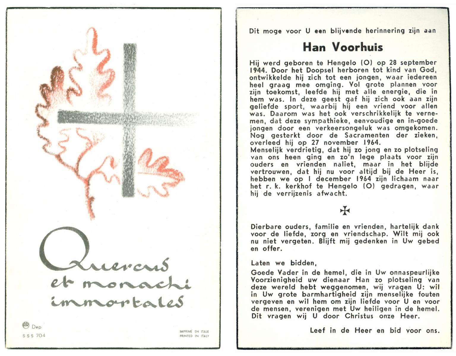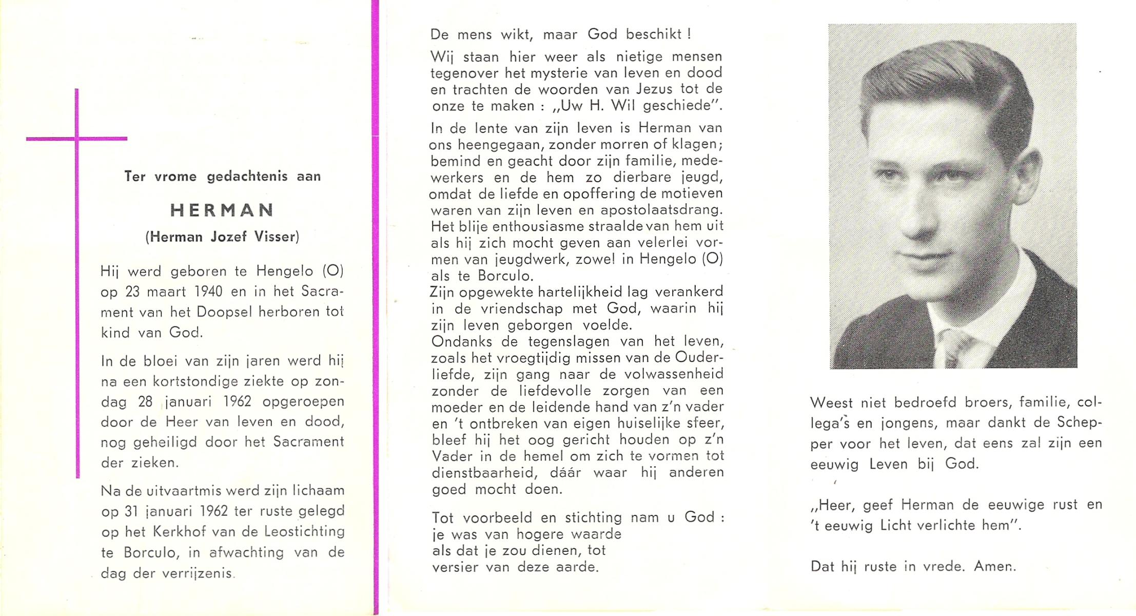 VISSER, Herman (Herman Jozef), geboren op 23-3-1940 te Hengelo (O), overleden op 28-1-1962 op 21-jarige leeftijd, begraven op 31-1-1962 te Borculo, Leostichting.