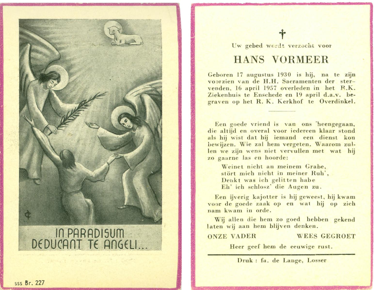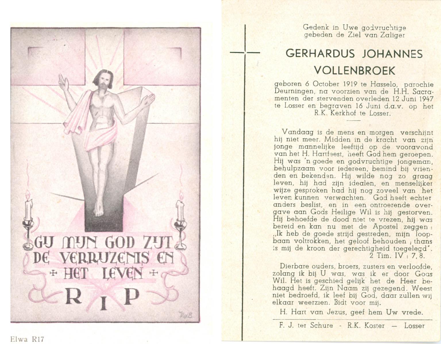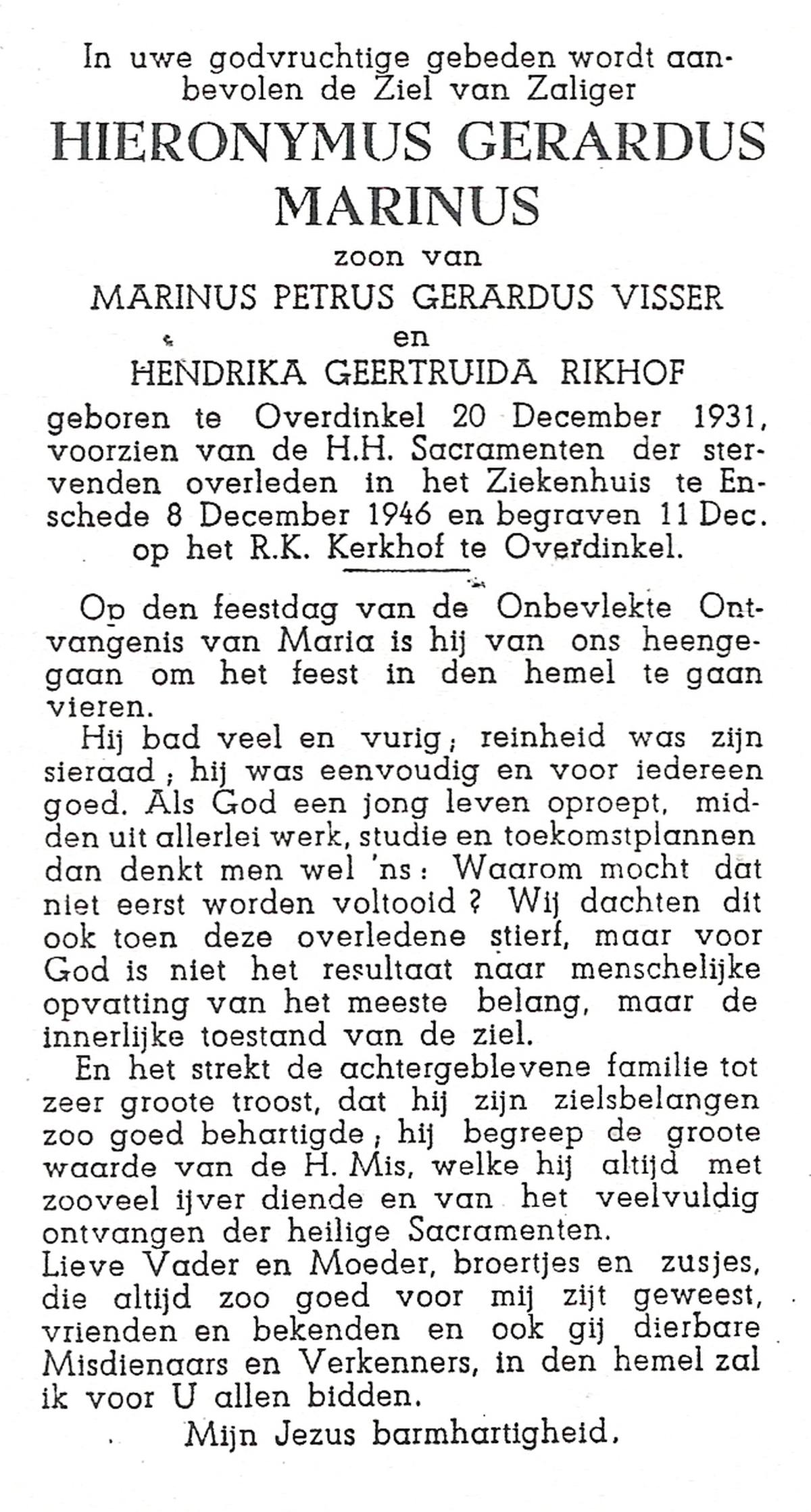 VISSER, Hieronymus Gerardus Marinus, geboren op 20-12-1931 te Overdinkel, overleden op 8-12-1946 te Enschede op 14-jarige leeftijd, begraven op 11-12-1946 te Overdinkel.