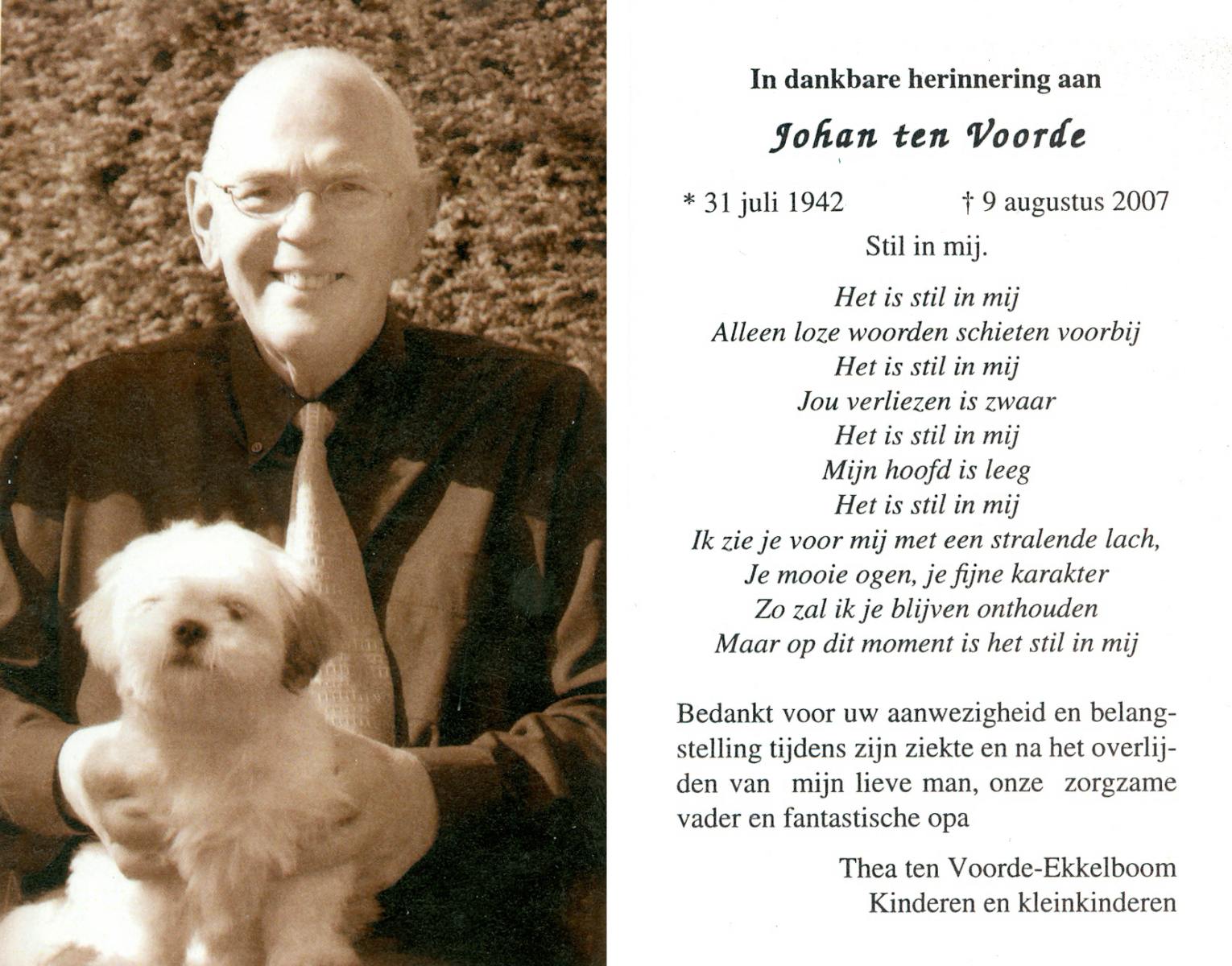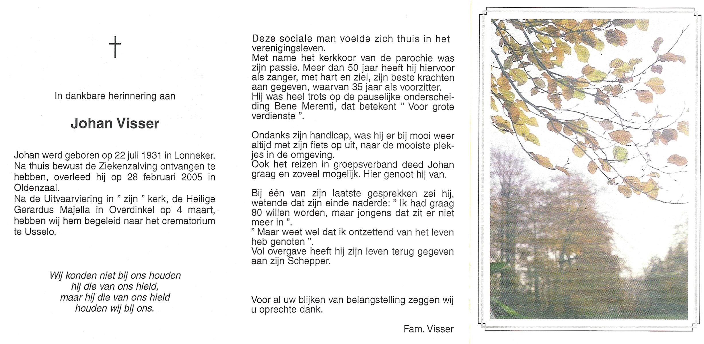 VISSER, Johan, geboren op 22-7-1931 te Lonneker, overleden op 28-2-2005 te Oldenzaal op 73-jarige leeftijd, gecremeerd op 4-3-2005 te Usselo.
