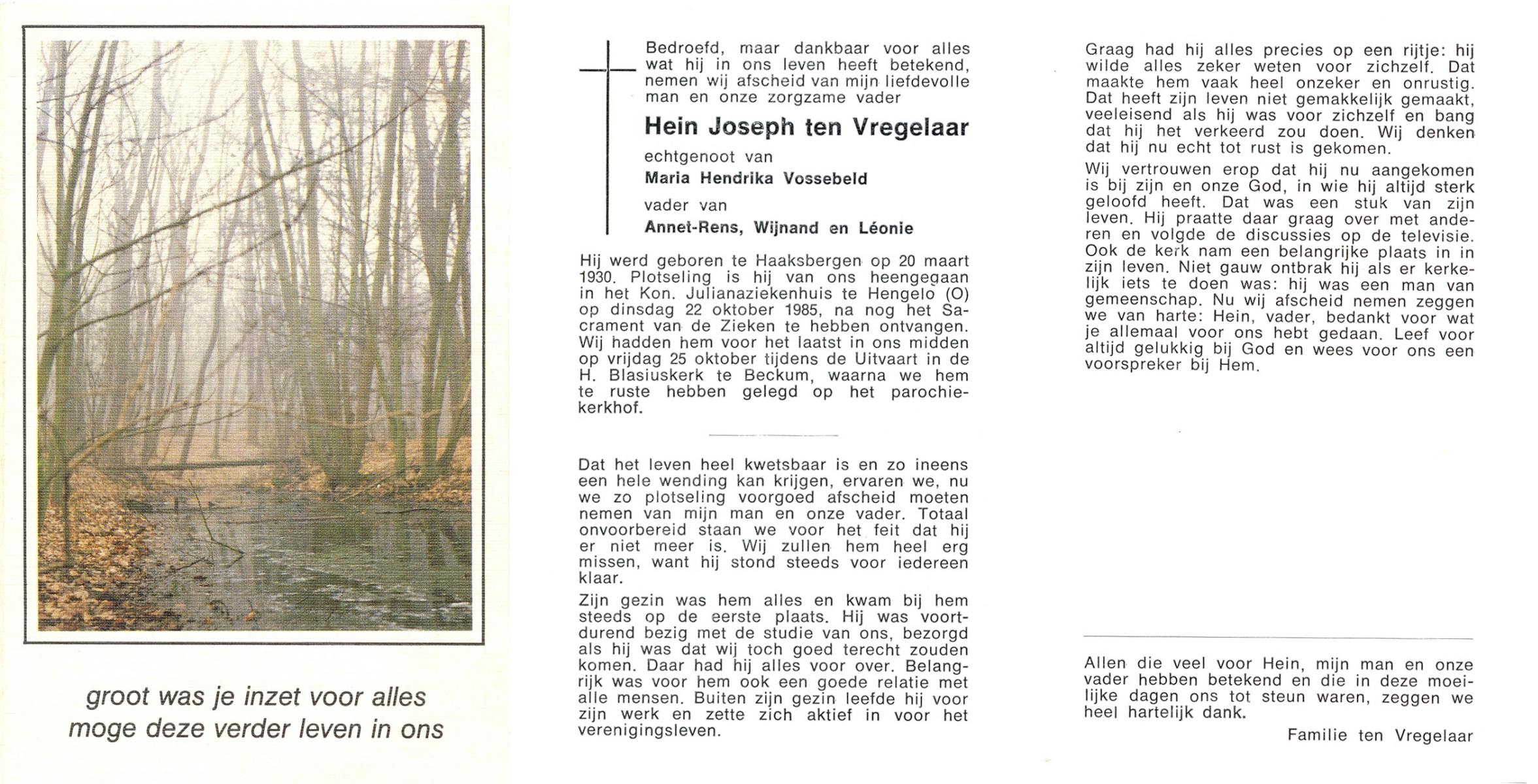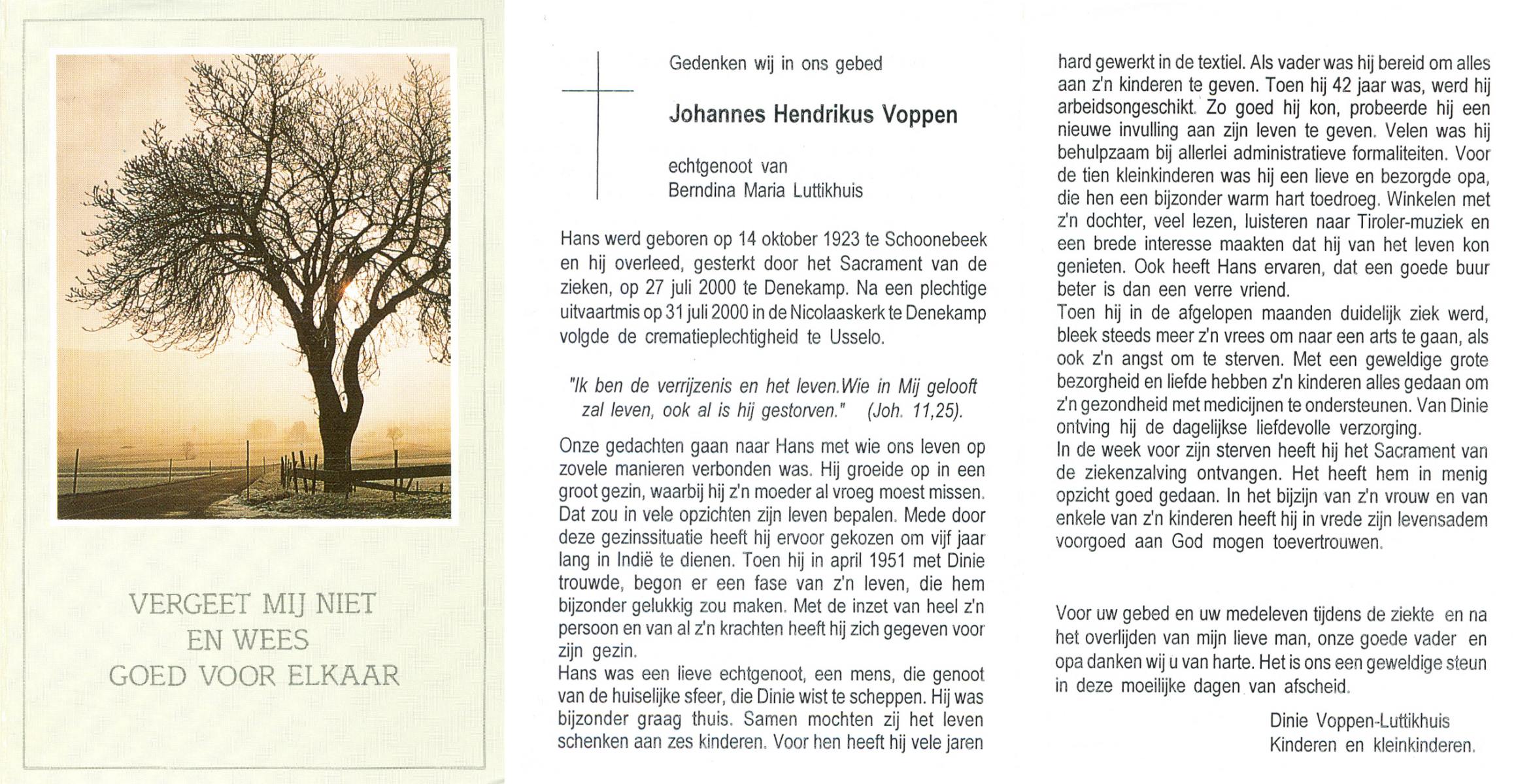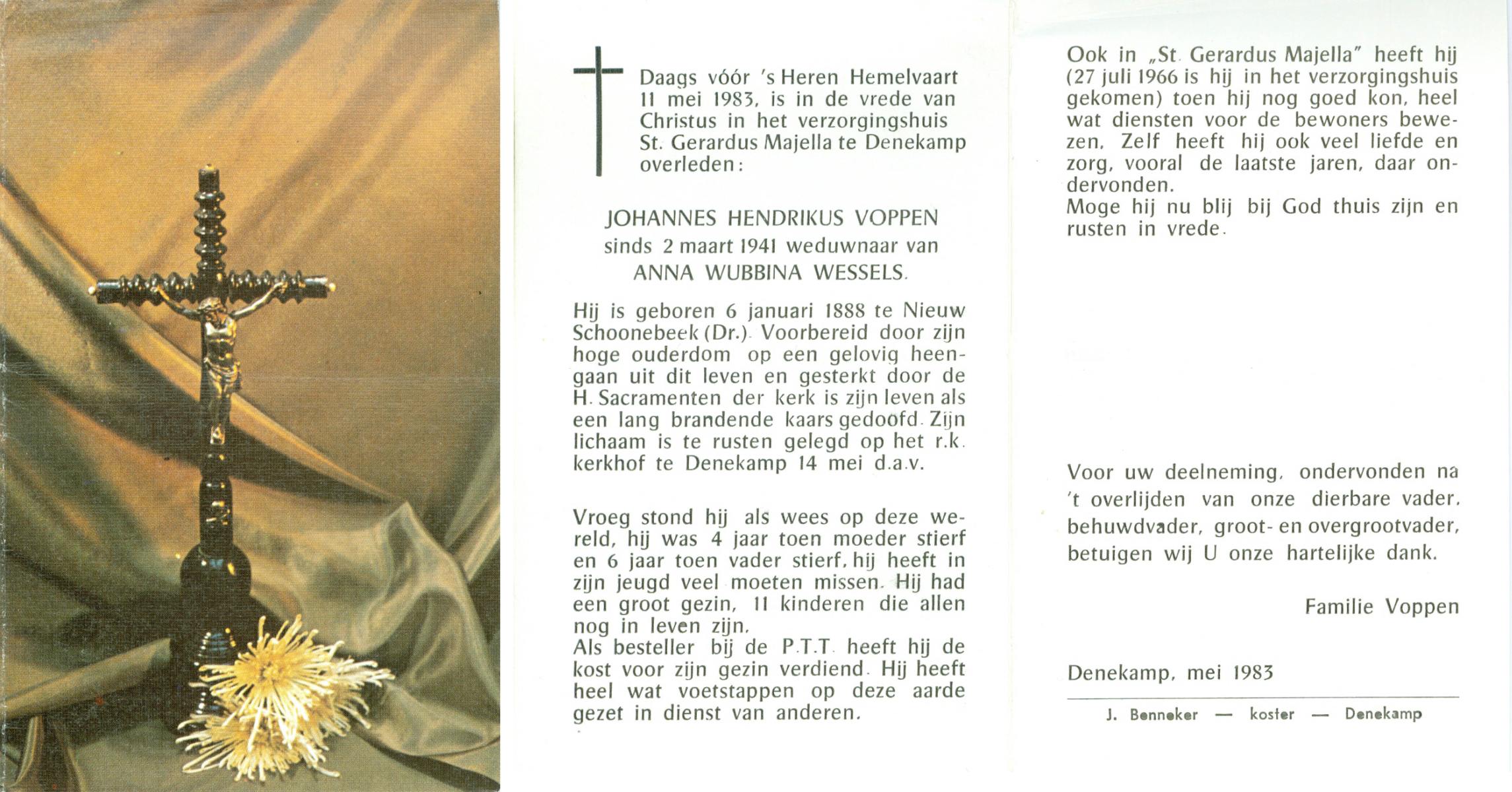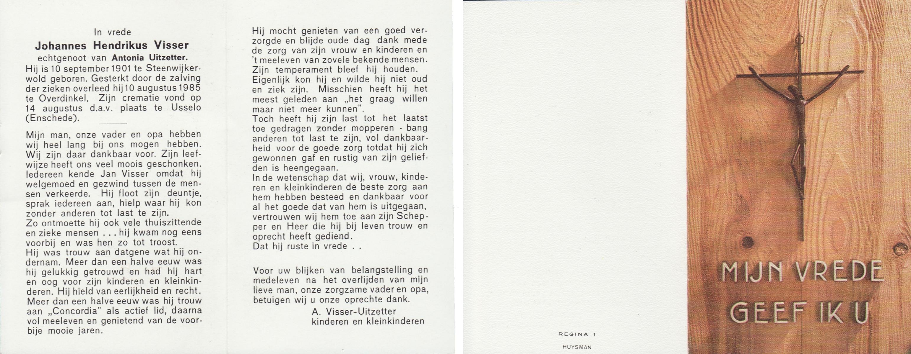 VISSER, Johannes Hendrikus, geboren op 10-9-1901 te Steenwijkerwold, overleden op 10-8-1985 te Overdinkel op 83-jarige leeftijd, gecremeerd op 14-8-1985 te Usselo.