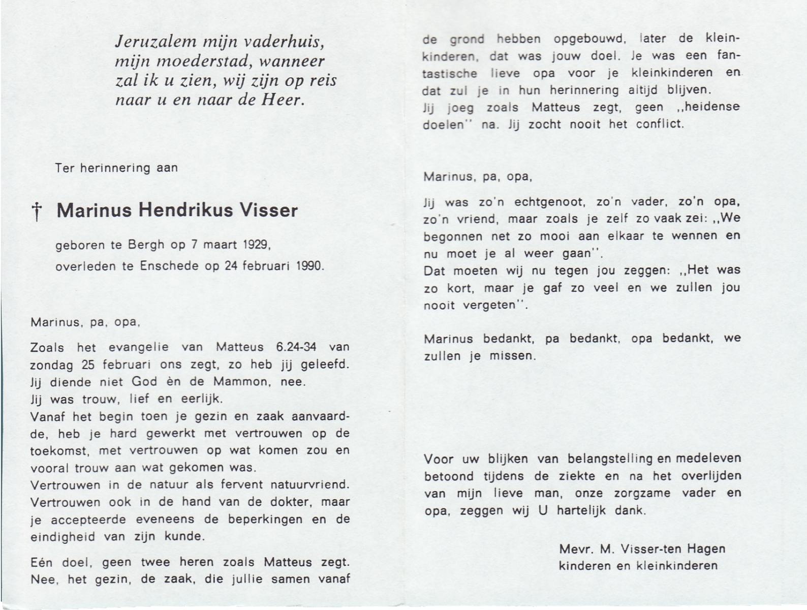 VISSER, Marinus Hendrikus, geboren op 7-3-1929 te Bergh, overleden op 24-2-1990 te Enschede op 60-jarige leeftijd.