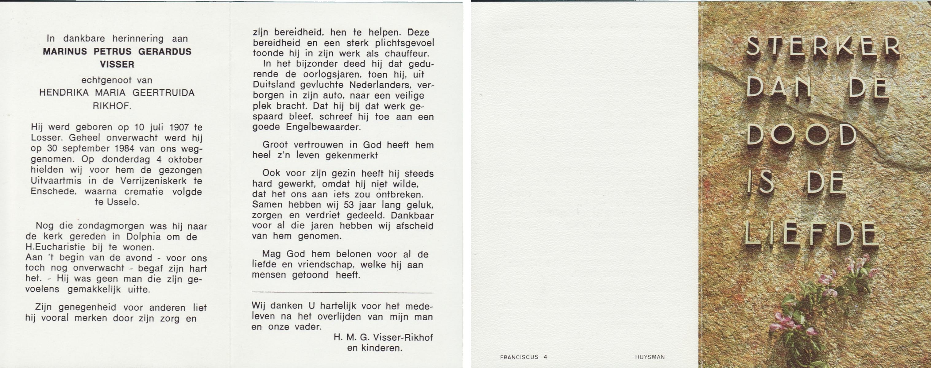 VISSER, Marinus Petrus Gerardus, geboren op 10-7-1907 te Losser, overleden op 30-9-1984 op 77-jarige leeftijd, gecremeerd op 4-10-1984 te Usselo.