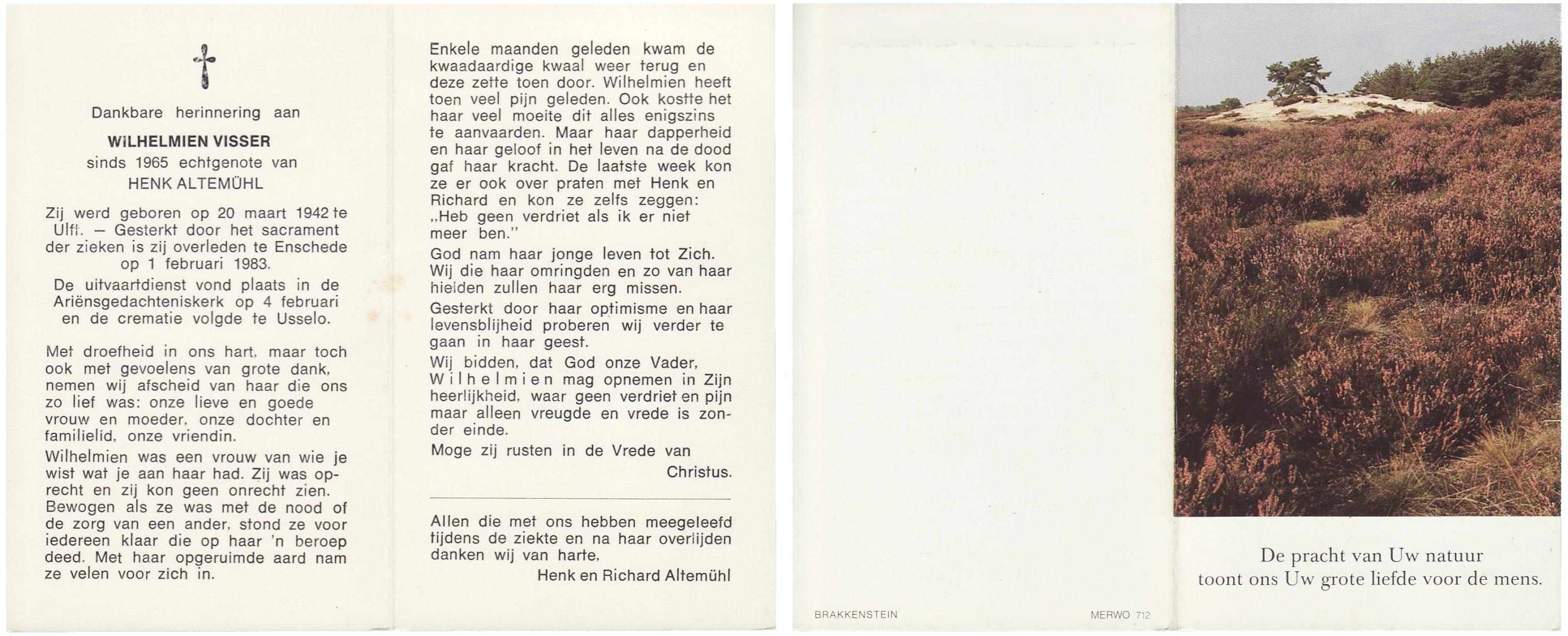 VISSER, Wilhelmien, geboren op 20-3-1942 te Ulft, overleden op 1-2-1983 te Enschede op 40-jarige leeftijd, gecremeerd op 4-2-1983 te Usselo.