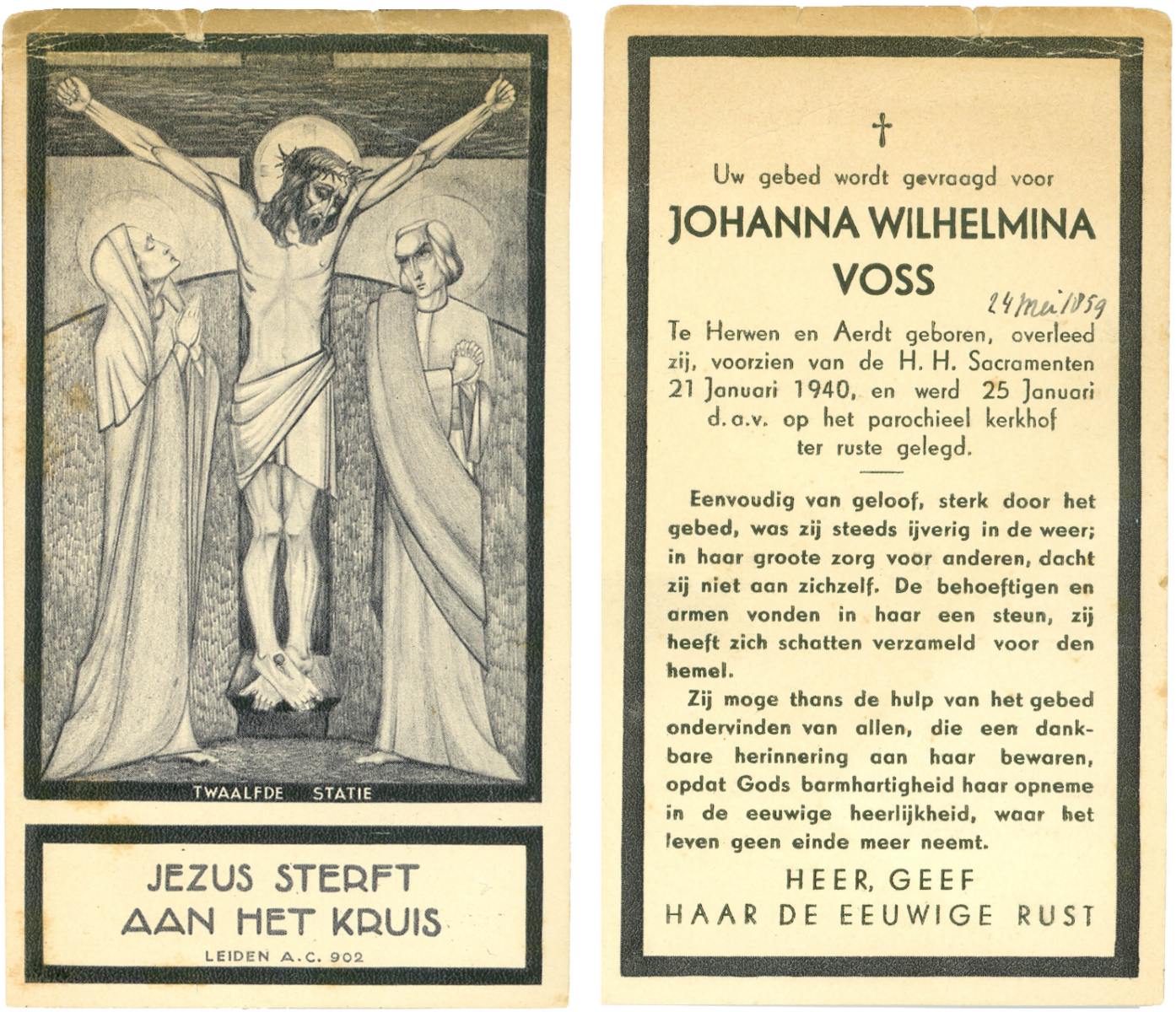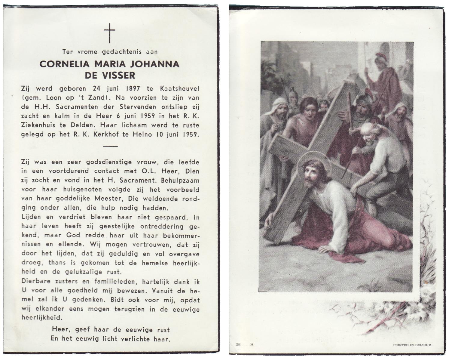 VISSER, de, Cornelia Maria Johanna, geboren op 24-06-1897 te Kaatsheuvel (gem.Loon op 't Zand), overleden op 6-6-1959 te Delden op 62-jarige leeftijd, begraven op 10-6-1959 te Heino r.k.kerkhof.