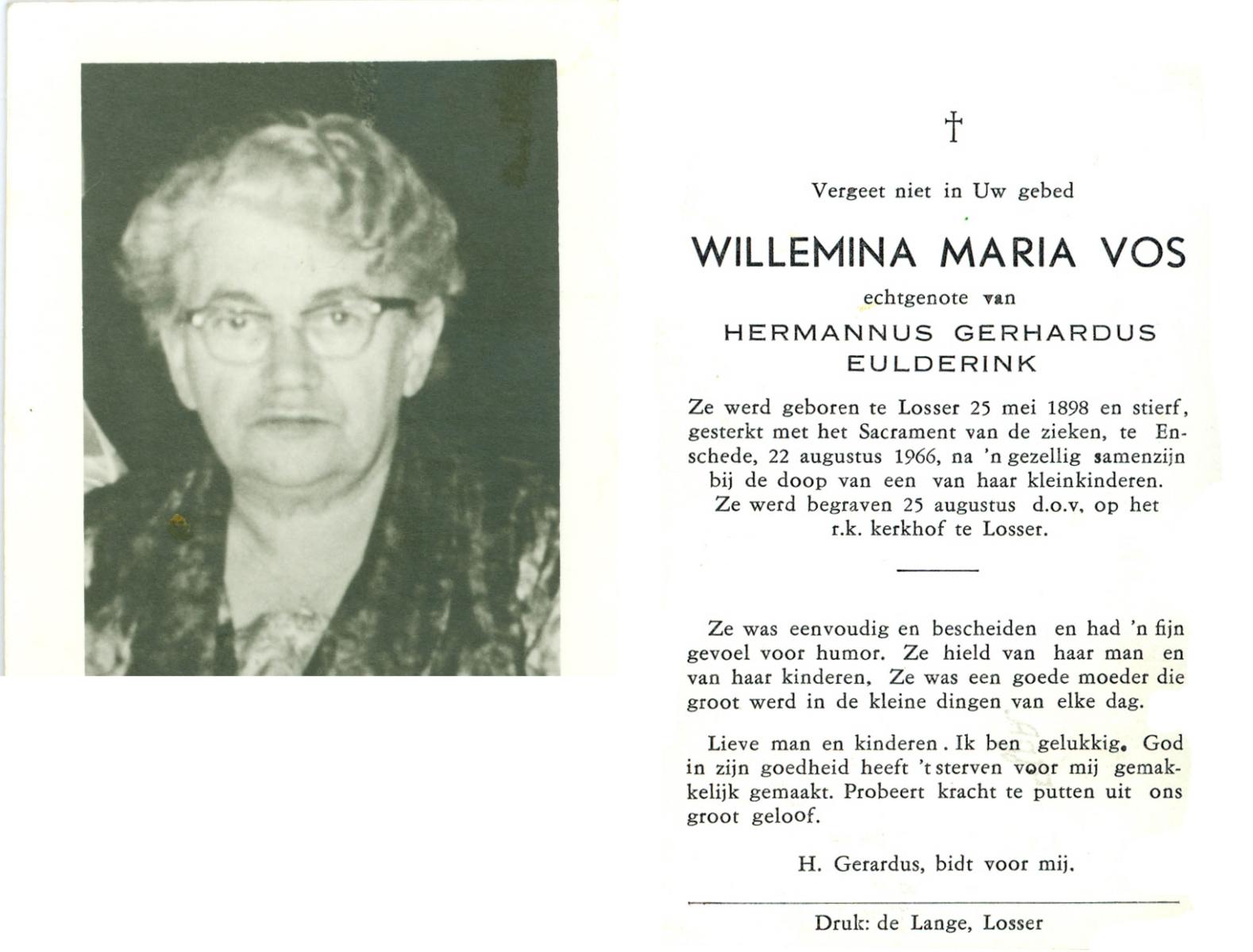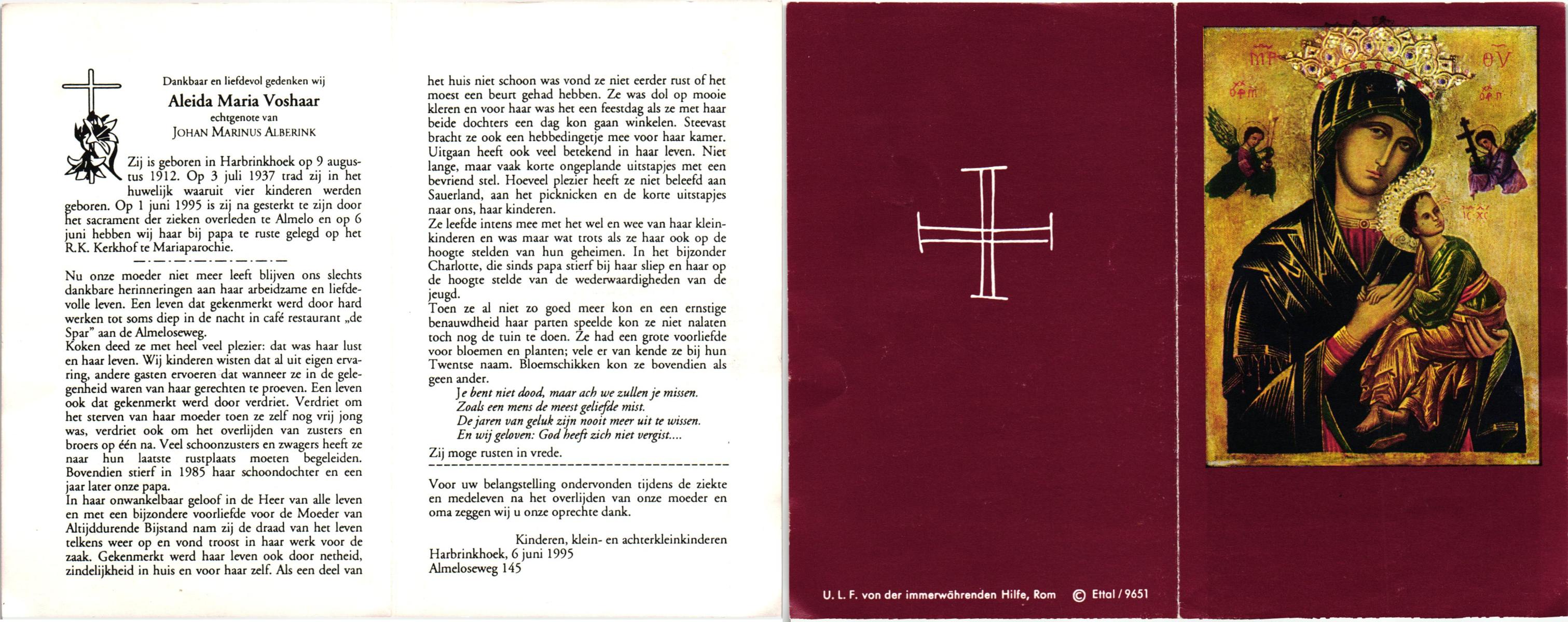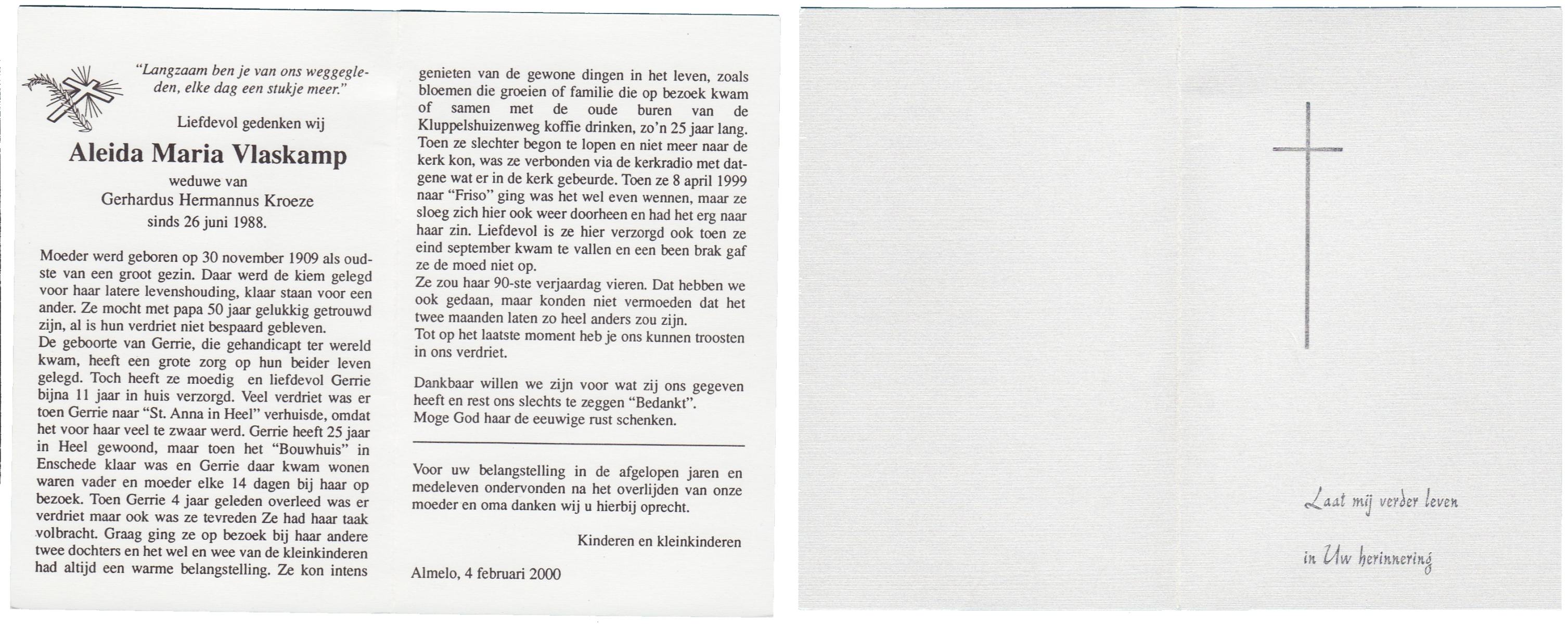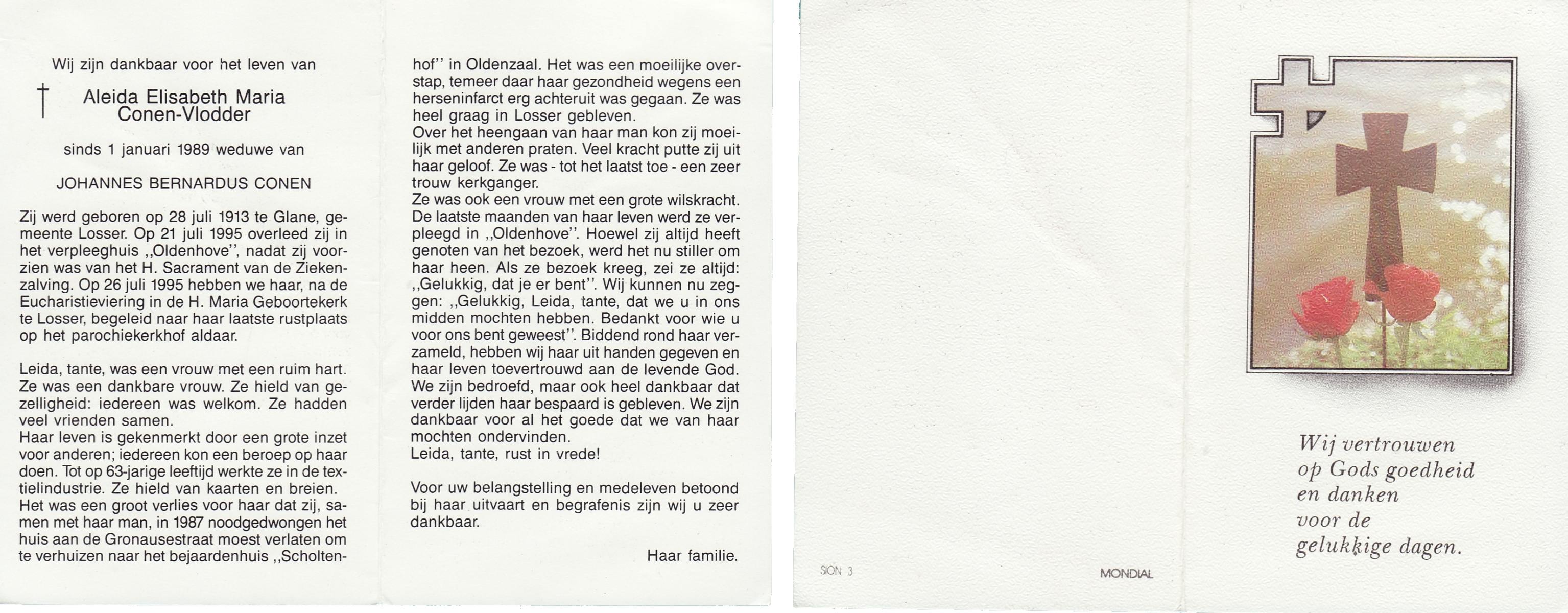 VLODDER, Aleida Elisabeth Maria, geboren op 28-7-1913 te Glane, overleden op 21-7-1995 te Losser op 81-jarige leeftijd, begraven op 26-7-1995 te Losser.