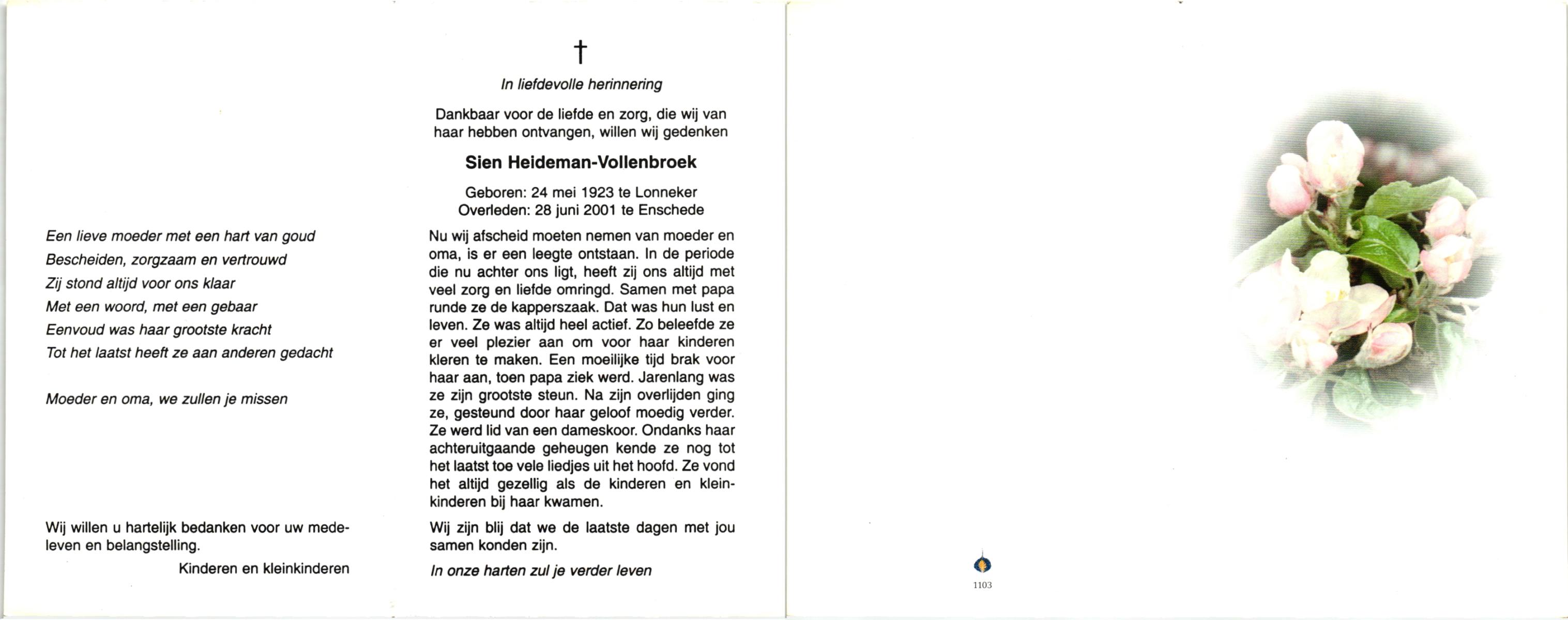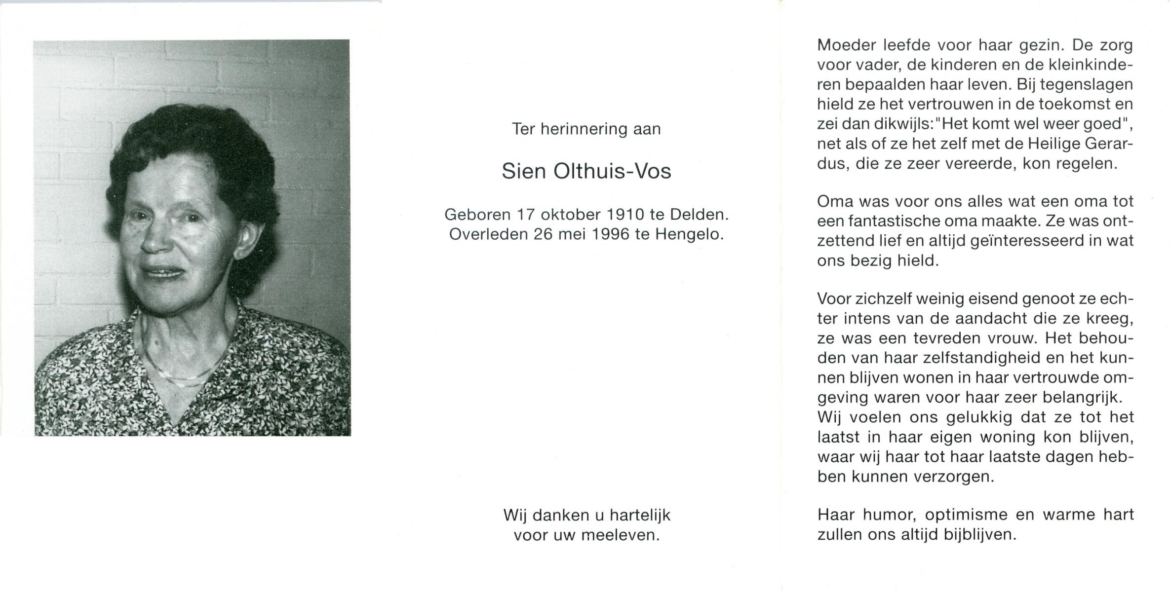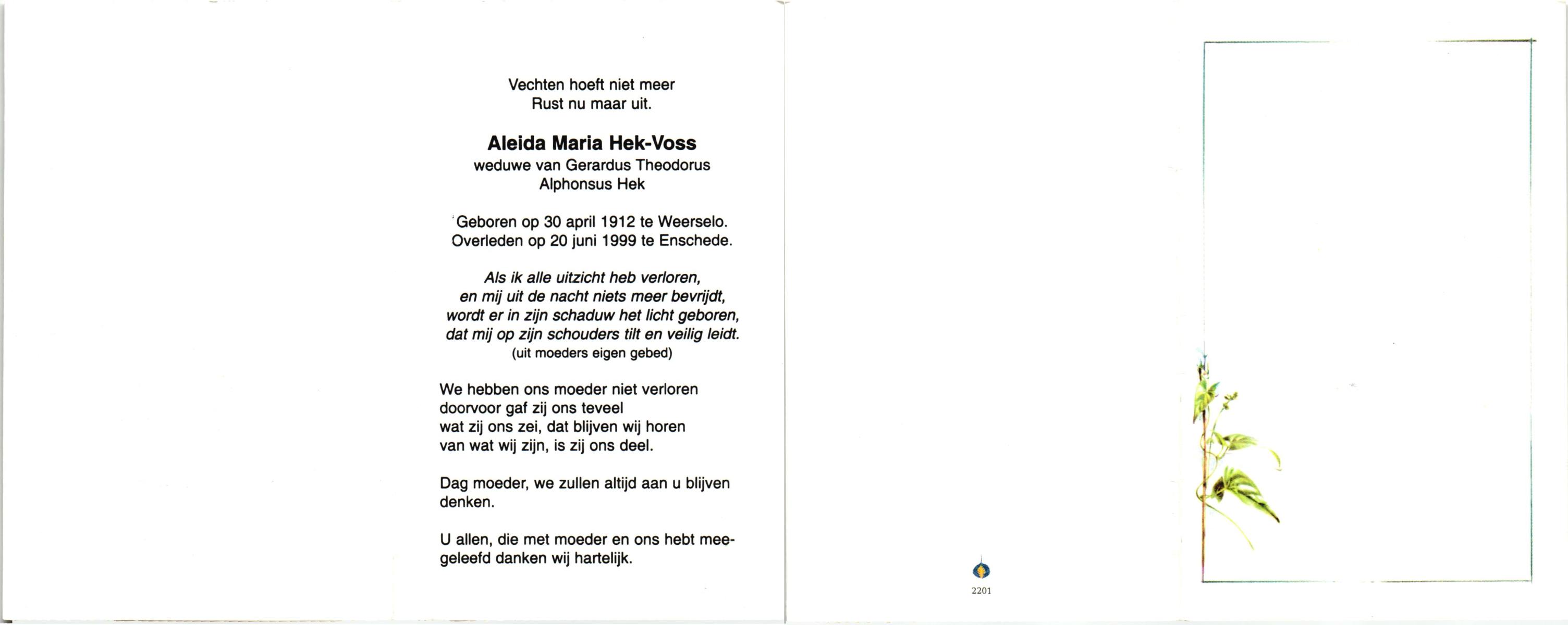 VLODDER, Aleida Elisabeth Maria, geboren op 28-7-1913 te Glane, overleden op 21-7-1995 te Losser op 81-jarige leeftijd, begraven op 26-7-1995 te Losser.