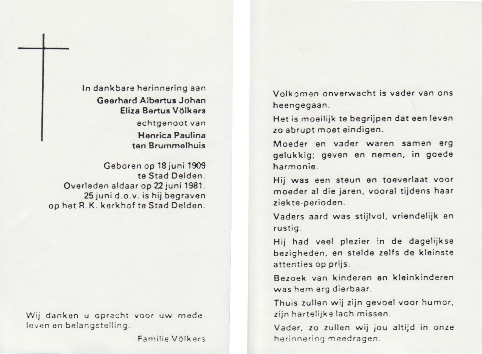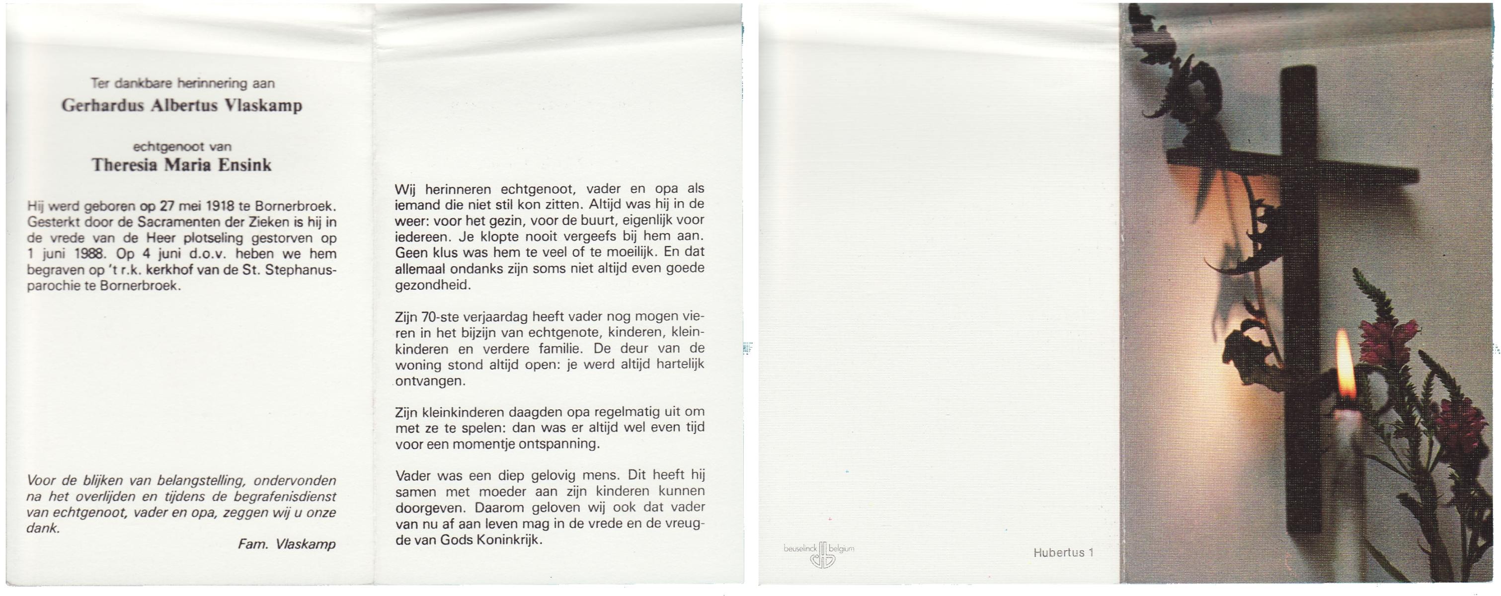 VLASKAMP, Gerhardus Albertus, geboren op 27-5-1918 te Bornerbroek, overleden op 1-6-1988 op 70-jarige leeftijd, begraven op 4-6-1988 te Bornerbroek.
