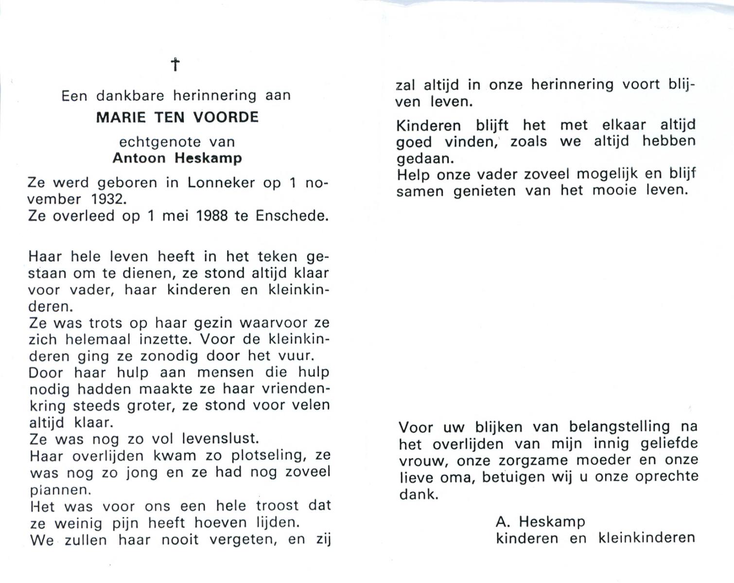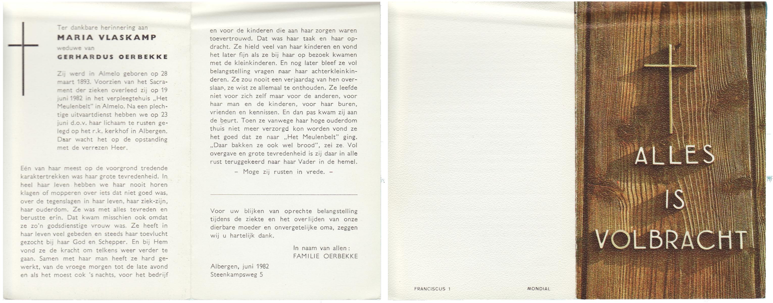 VLASKAMP, Maria, geboren op 28-03-1893 te Almelo, overleden op 19-6-1982 te Almelo op 89-jarige leeftijd, begraven op 23-6-1982 te Albergen.