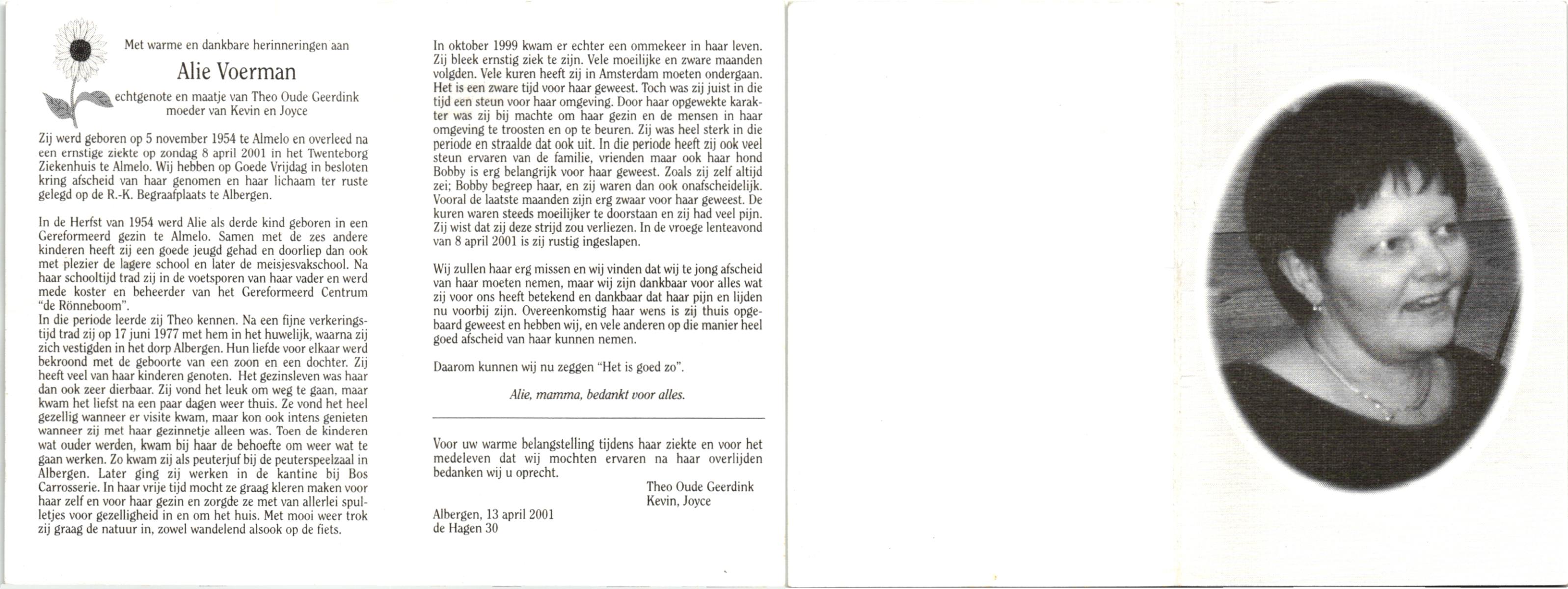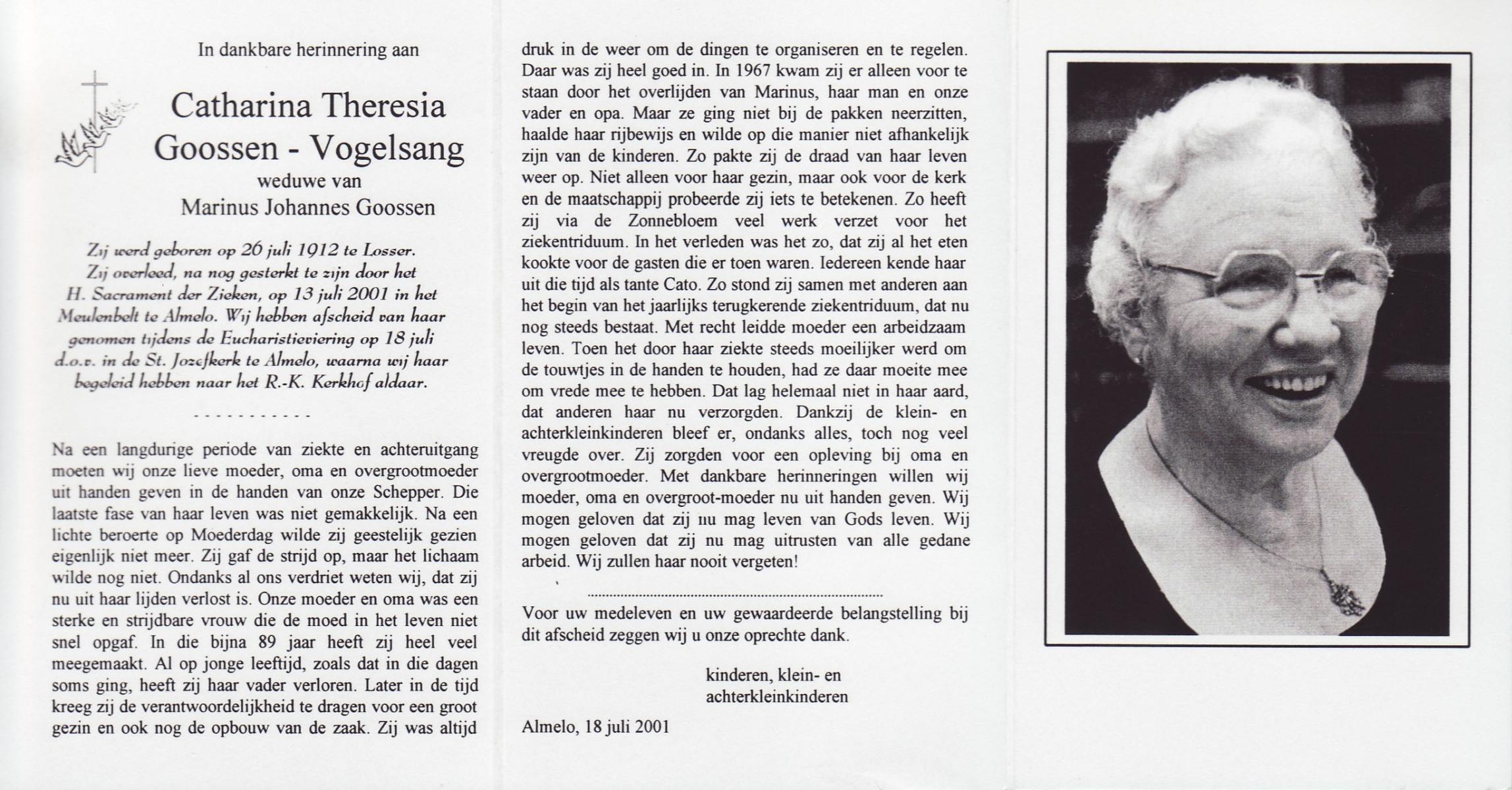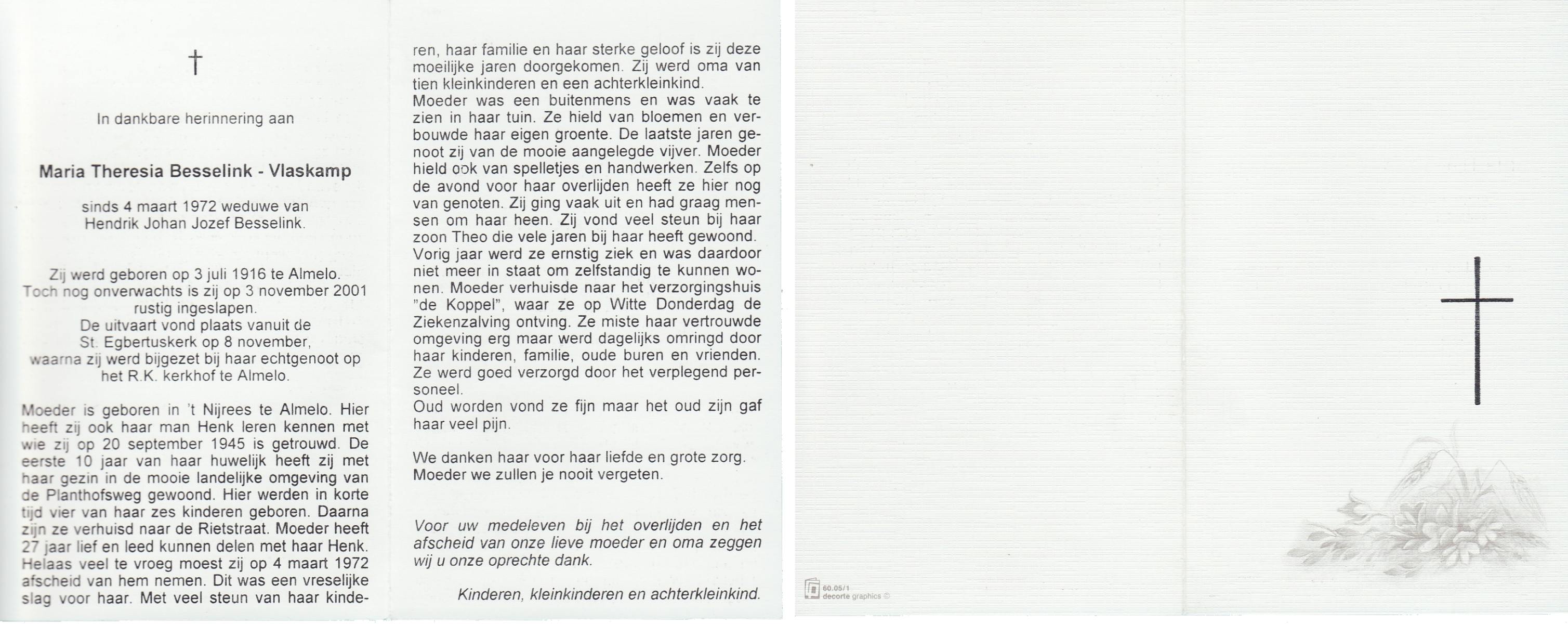 VLASKAMP, Maria Theresia, geboren op 3-7-1916 te Almelo, overleden op 3-11-2001 op 85-jarige leeftijd, begraven op 8-11-2001 te Almelo.