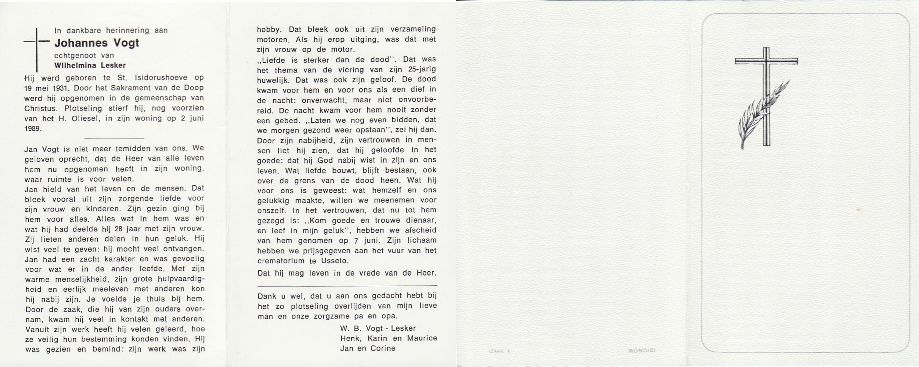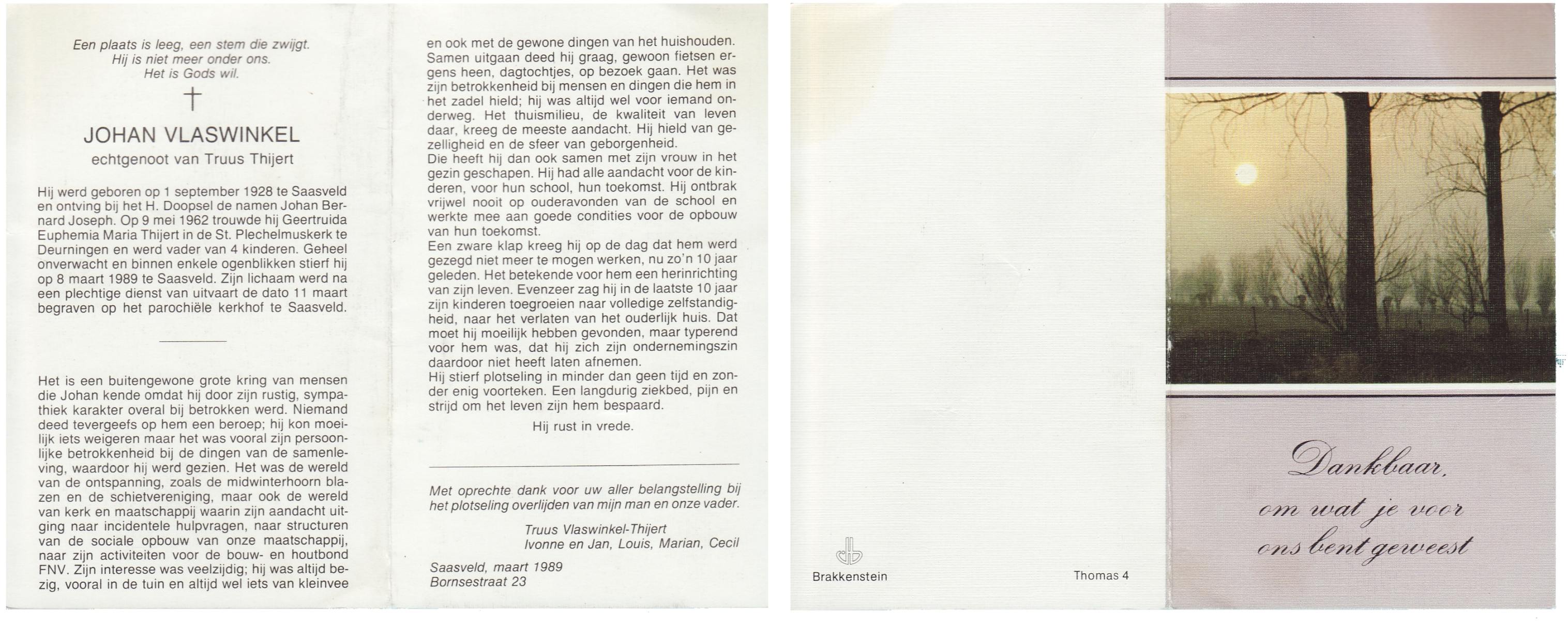 VLASWINKEL, Johan, geboren op 1-9-1928 te Saasveld, overleden op 8-3-1989 te Saasveld op 60-jarige leeftijd, begraven op 11-3-1989 te Saasveld.