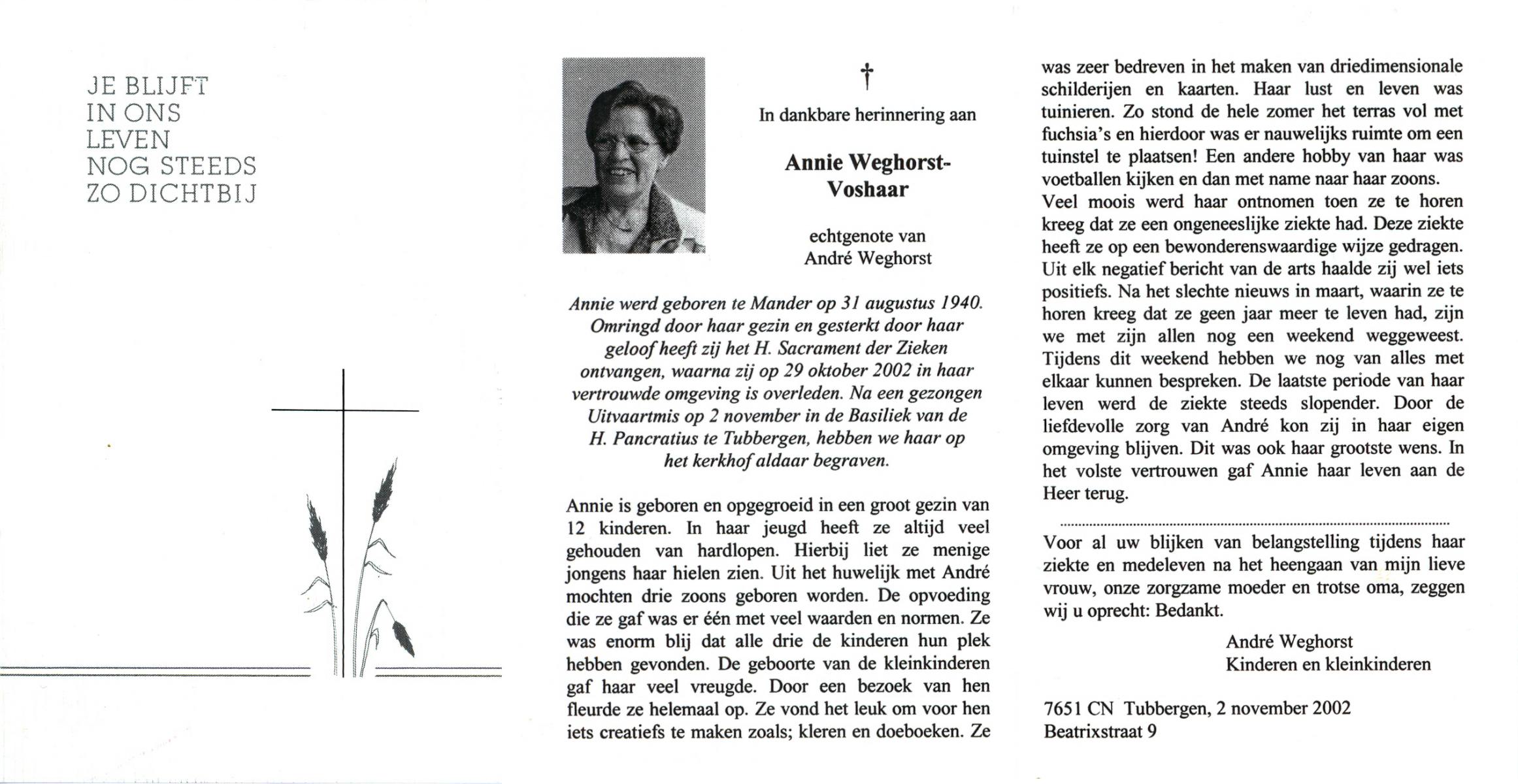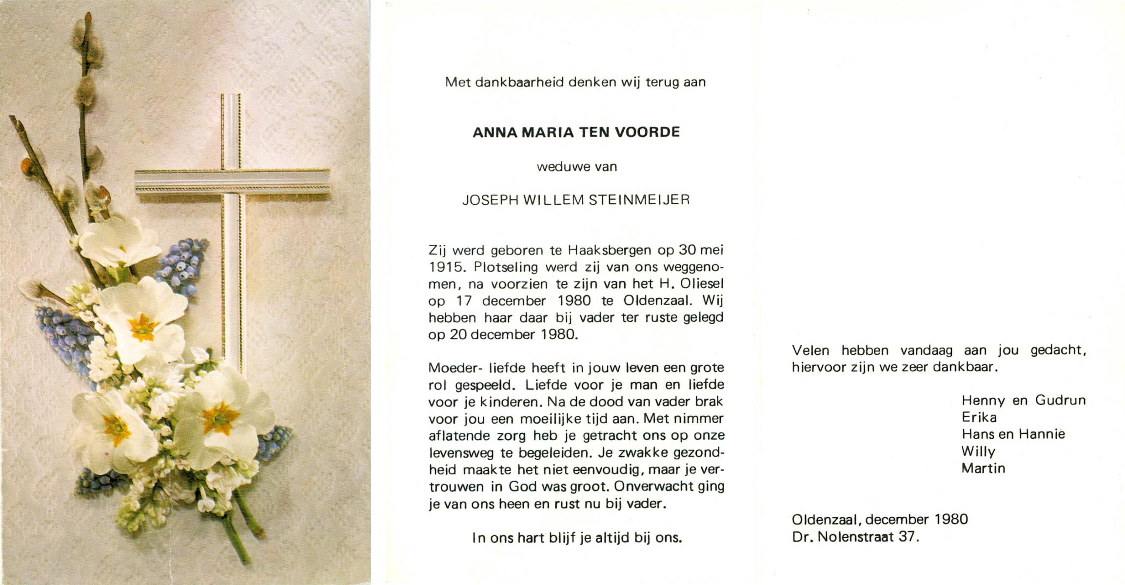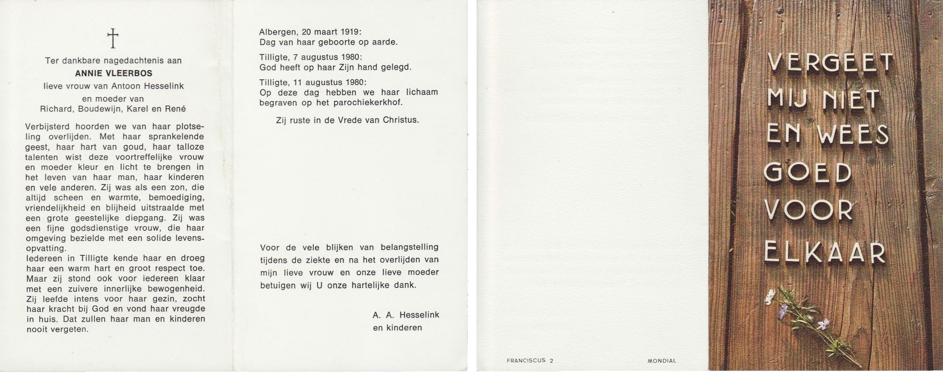 VLEERBOS, Annie, geboren op 20-3-1919 te Albergen, overleden op 7-8-1980 te Tilligte op 61-jarige leeftijd, begraven op 11-8-1980 te Tilligte.