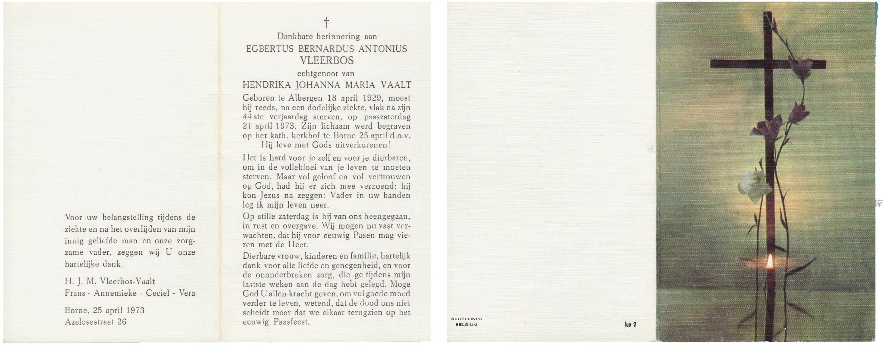 VLEERBOS, Egbertus Bernardus Antonius, geboren op 18-4-1929 te Albergen, overleden op 21-4-1973 op 44-jarige leeftijd, begraven op 25-4-1973 te Borne.