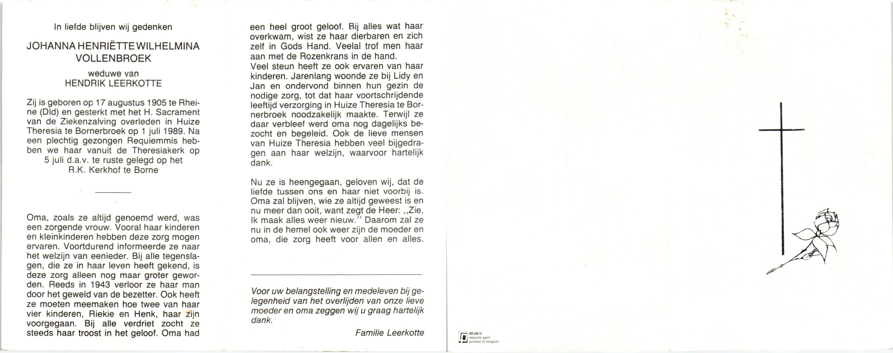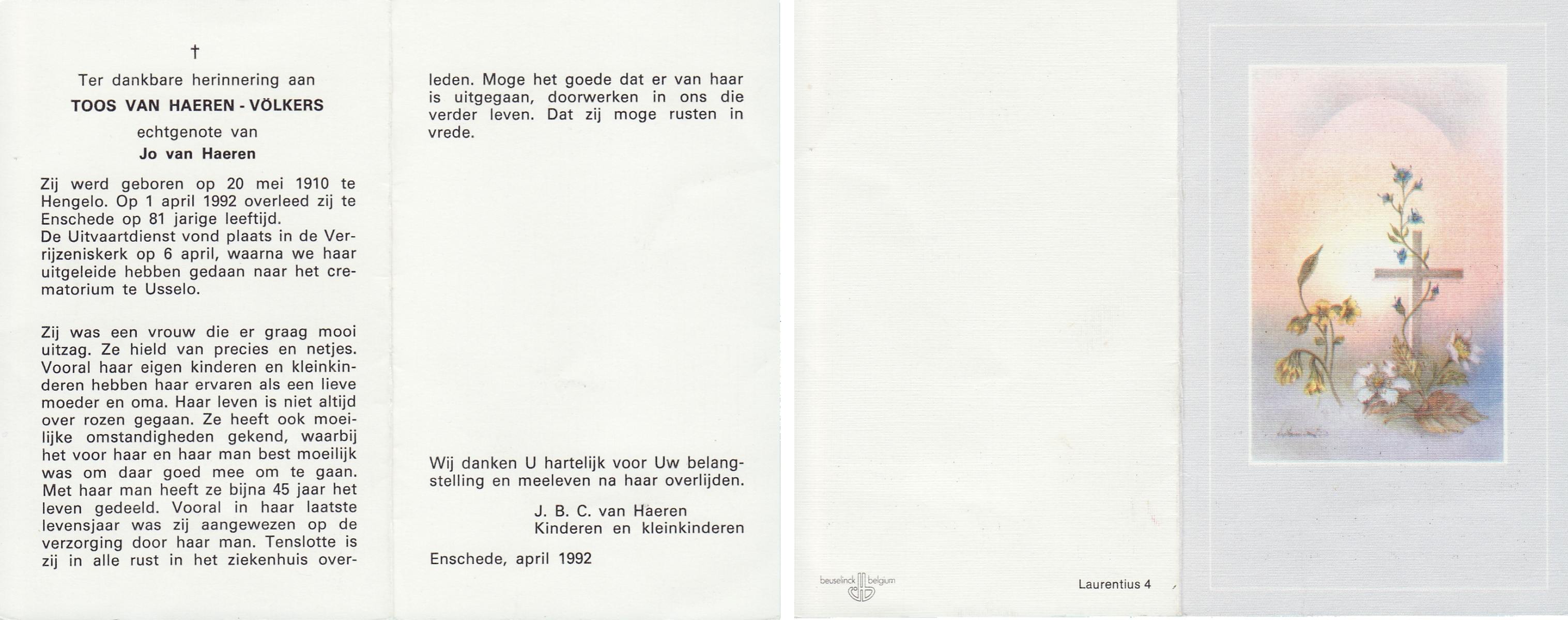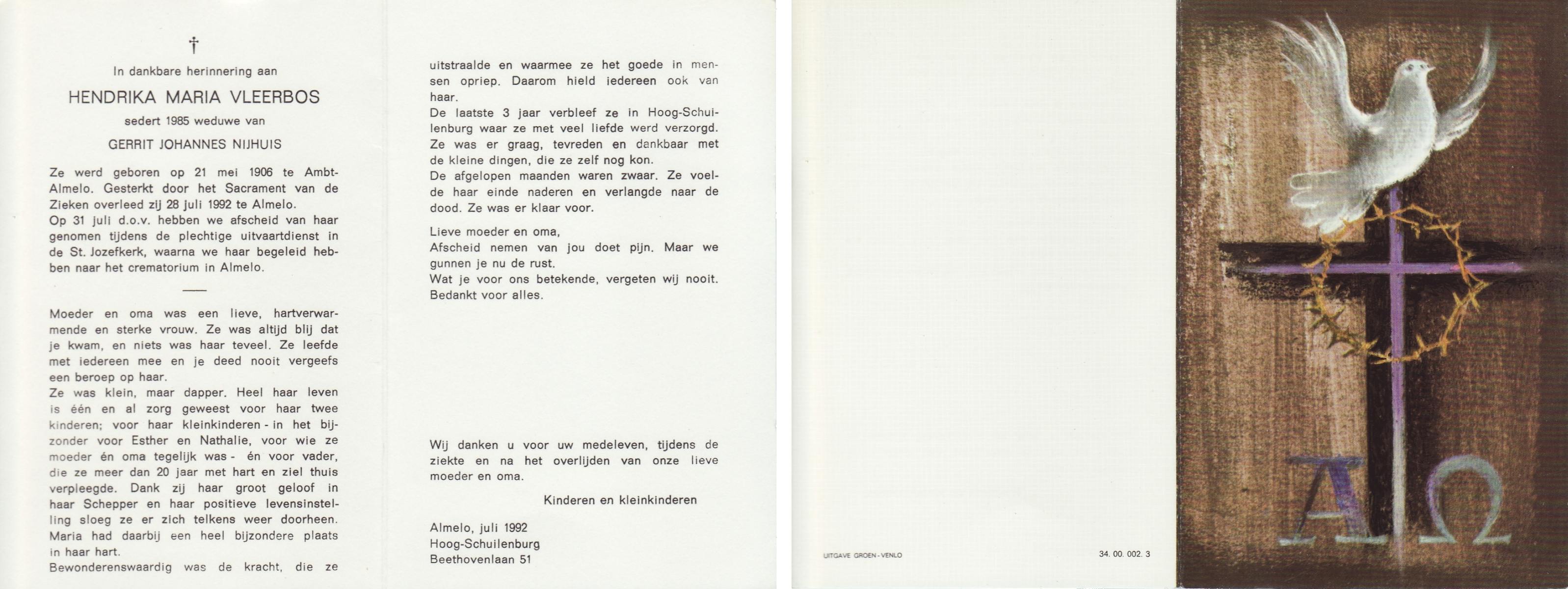VLEERBOS, Hendrika Maria, geboren op 21-5-1906 te Almelo, Ambt, overleden op 28-7-1992 te Almelo op 86-jarige leeftijd, gecremeerd op 31-7-1992 te Almelo.