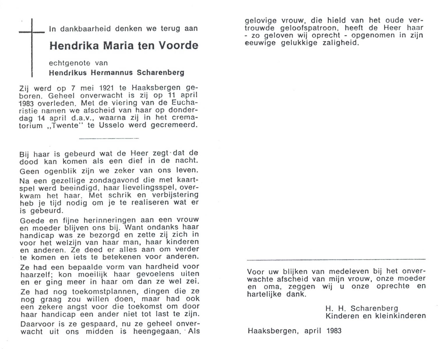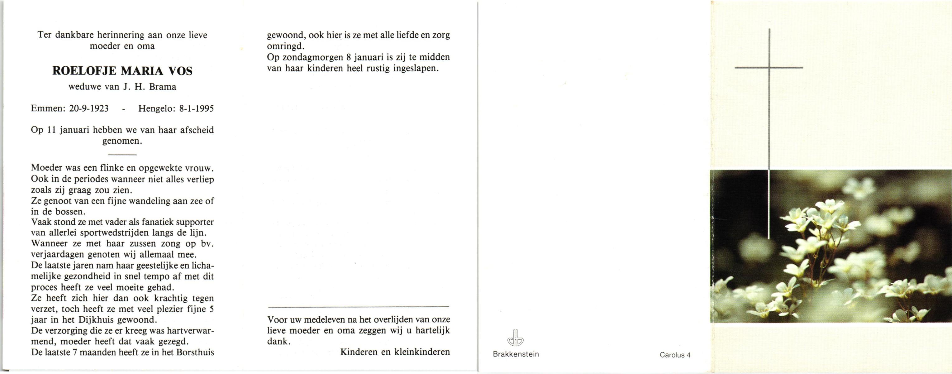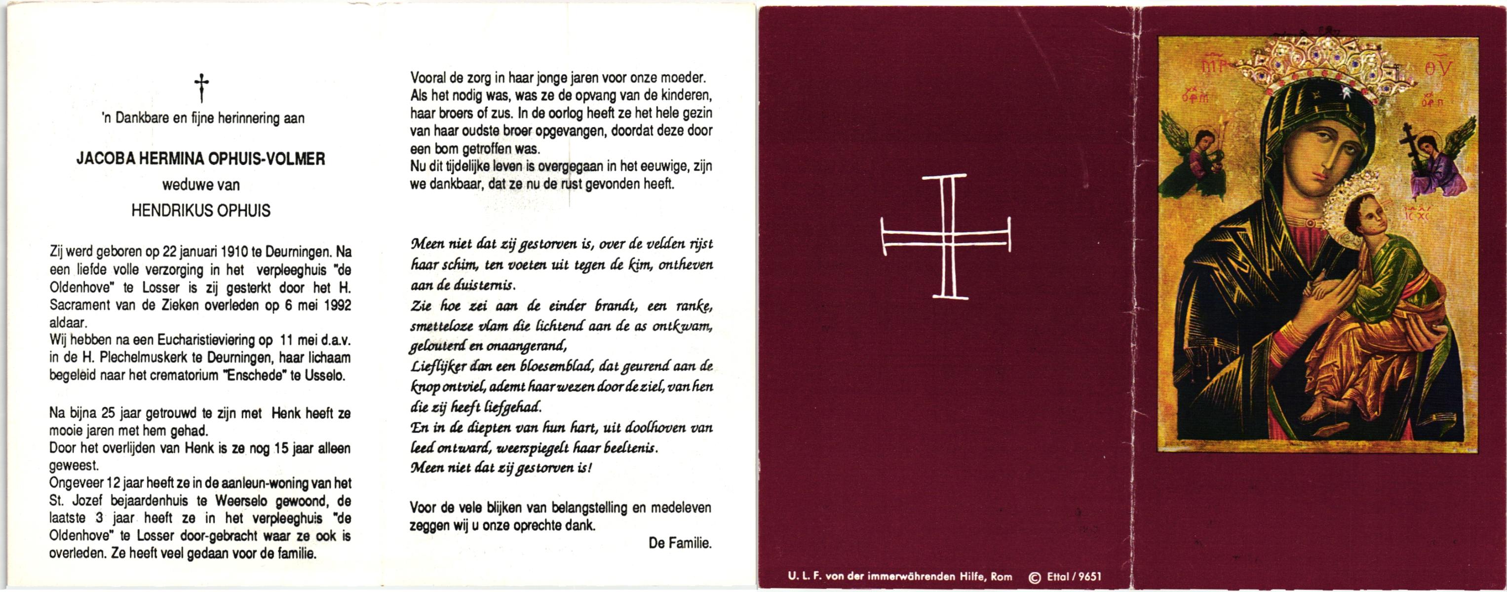 VLEERBOS, Hendrika Maria, geboren op 21-5-1906 te Almelo, Ambt, overleden op 28-7-1992 te Almelo op 86-jarige leeftijd, gecremeerd op 31-7-1992 te Almelo.