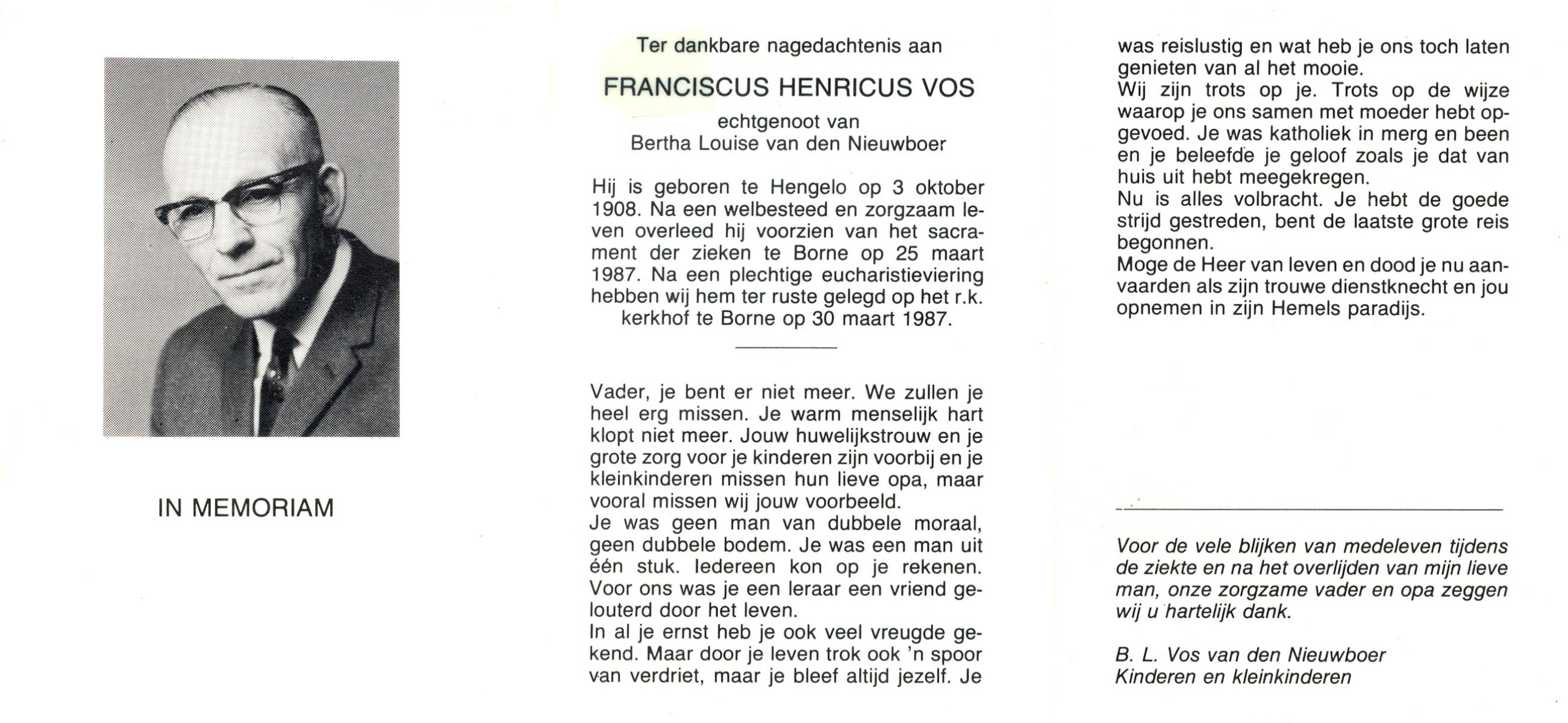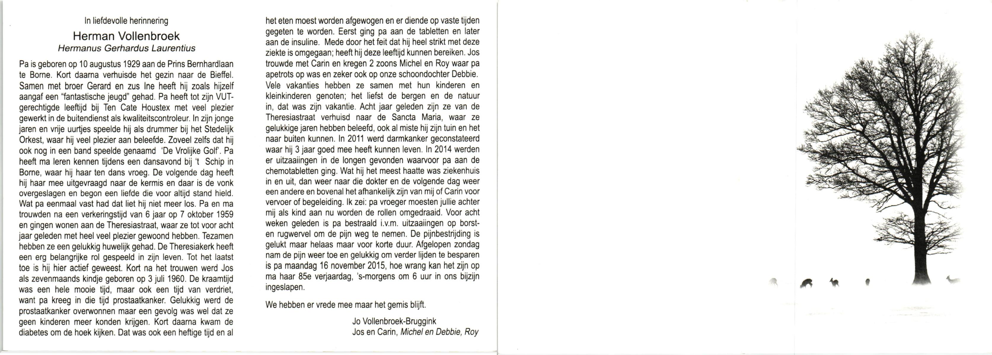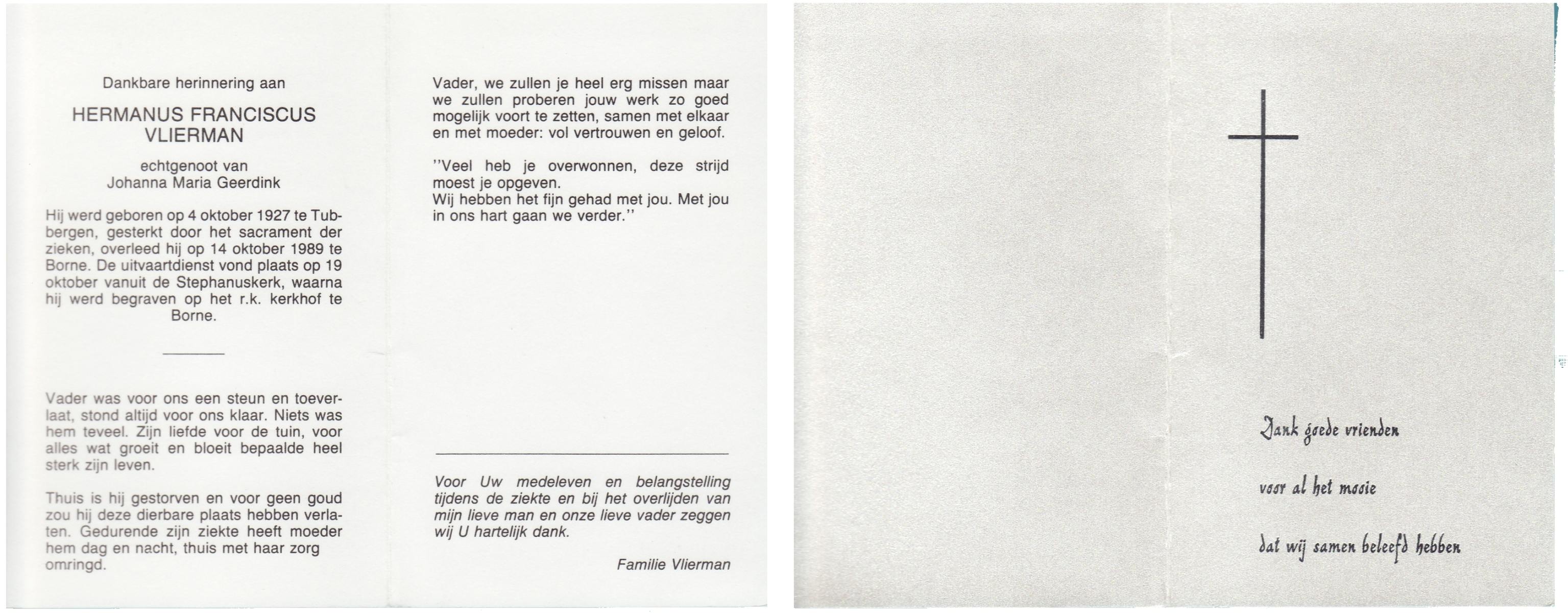 VLIERMAN, Hermanus Franciscus, geboren op 4-10-1927 te Tubbergen, overleden op 14-10-1989 te Borne op 62-jarige leeftijd, begraven op 19-10-1989 te Borne.