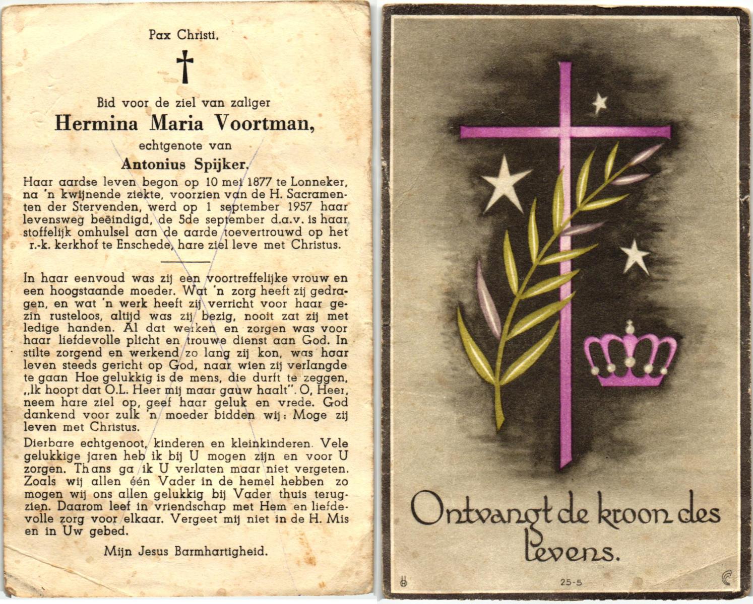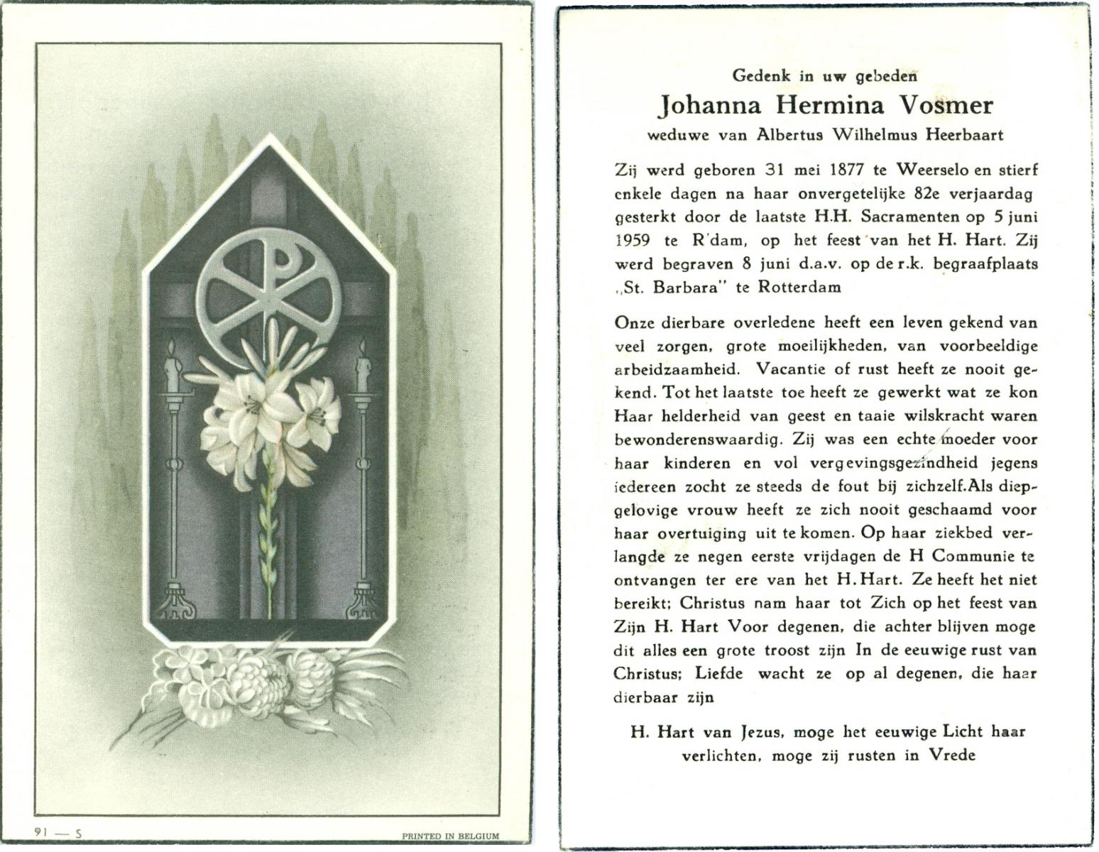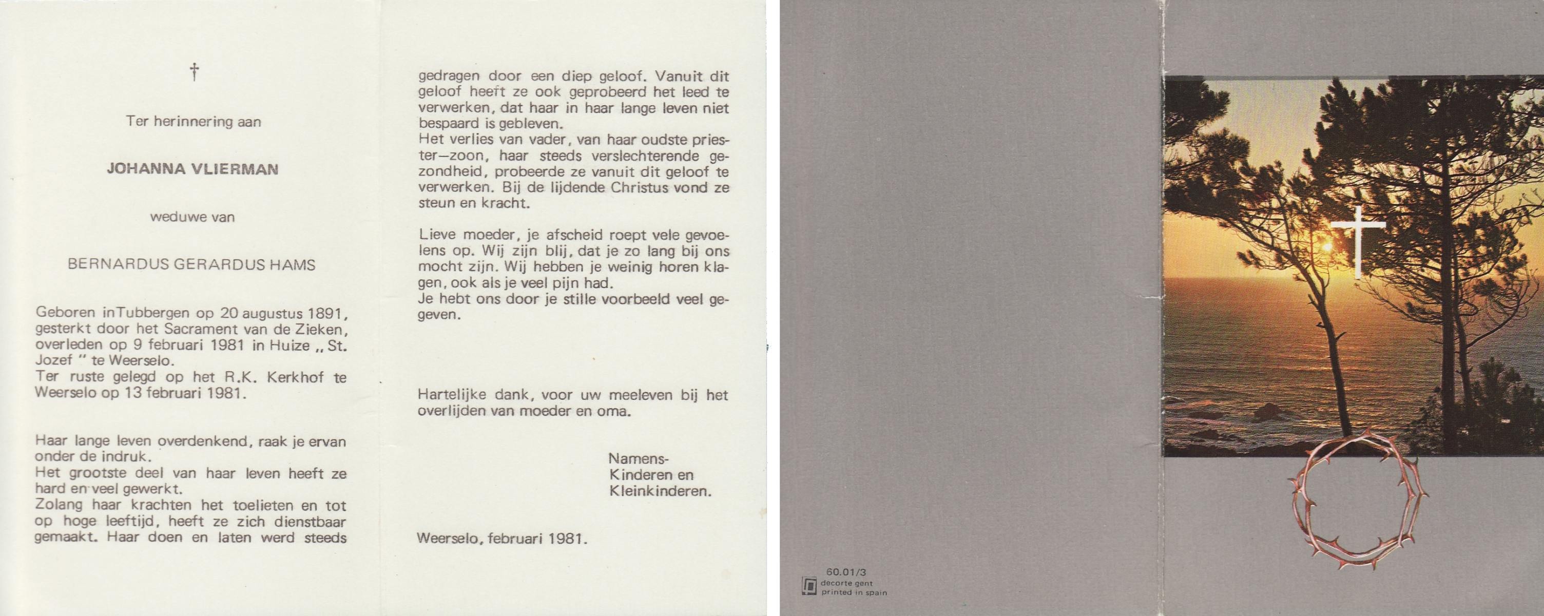 VLIERMAN, Johanna, geboren op 20-08-1891 te Tubbergen, overleden op 9-2-1981 te Weerselo op 89-jarige leeftijd, begraven op 13-2-1981 te Weerselo.