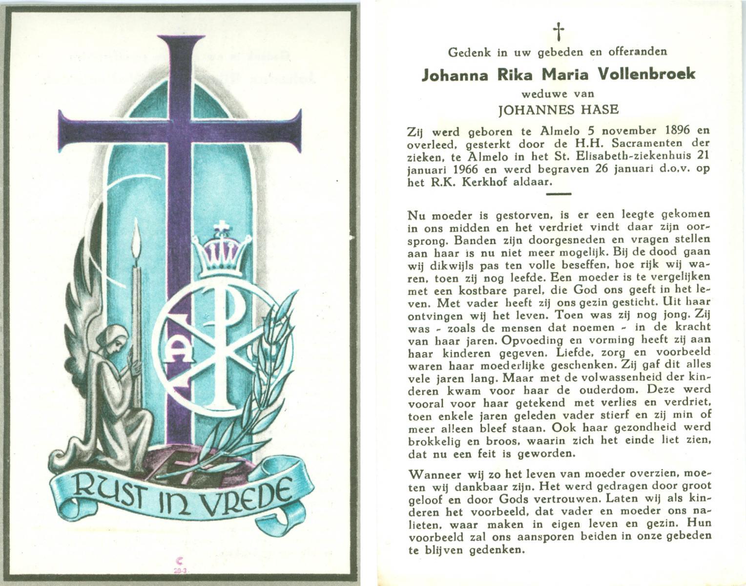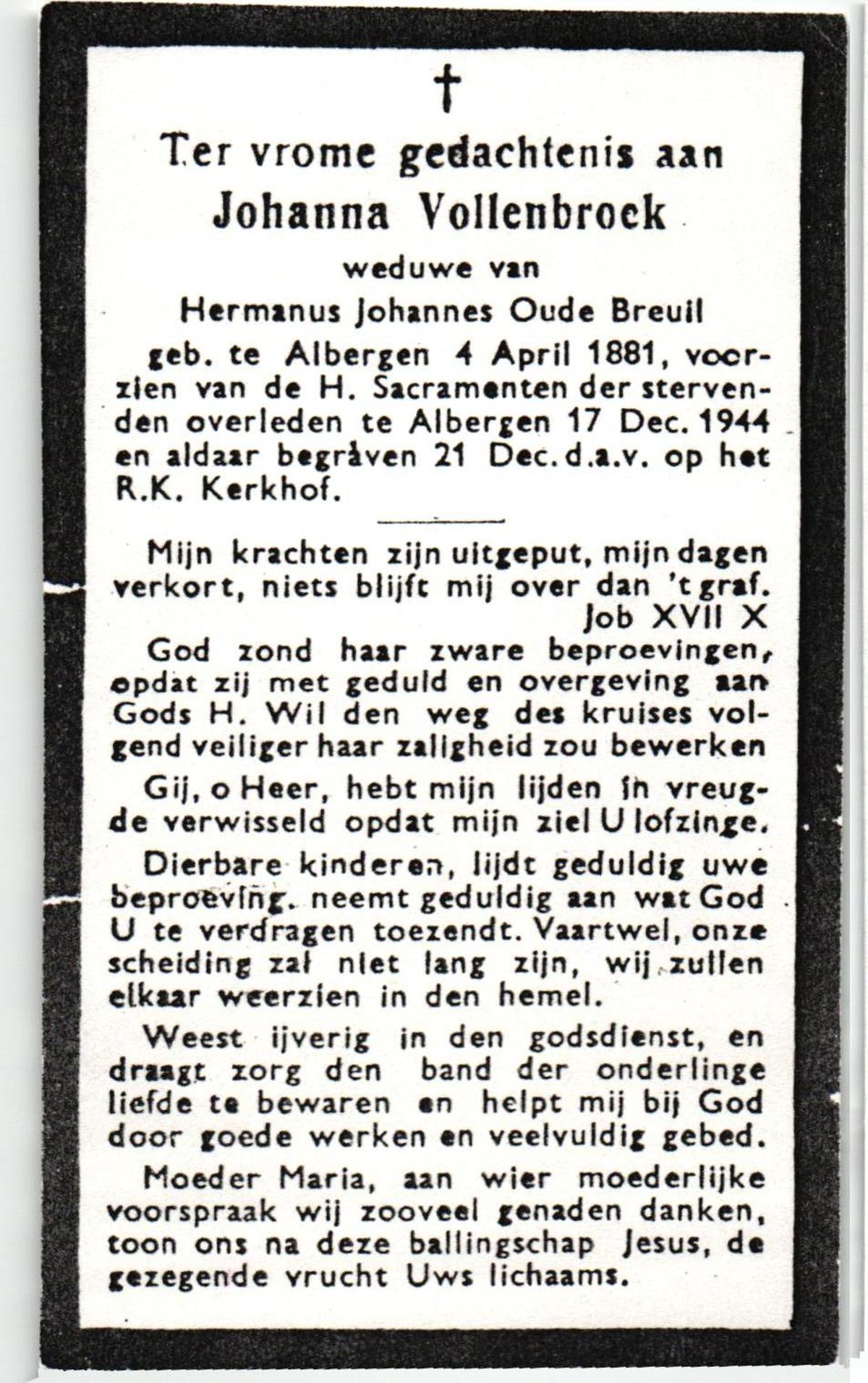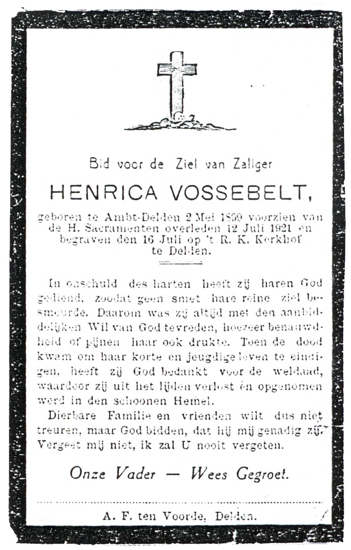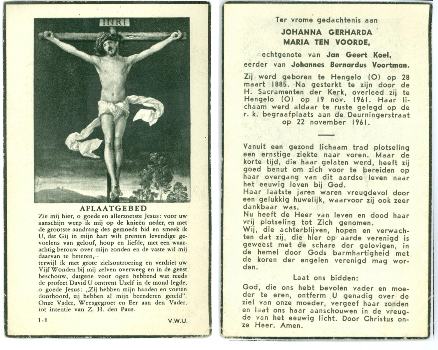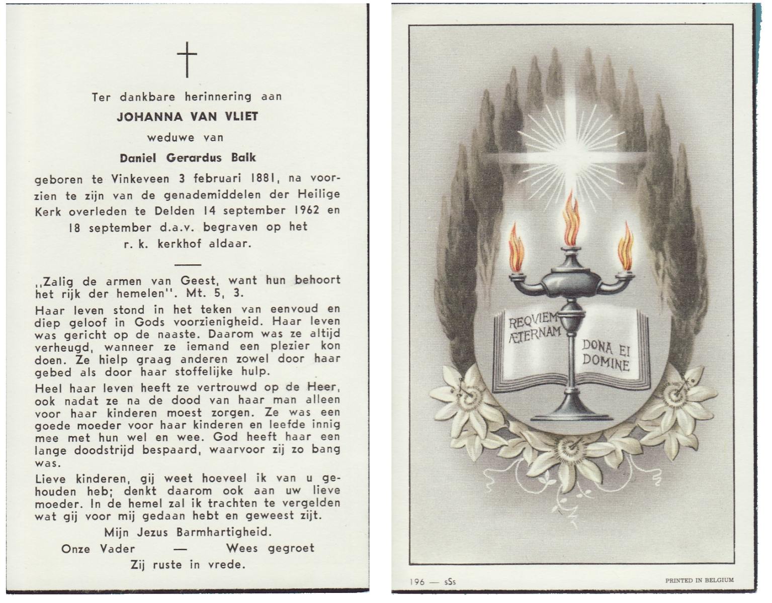 VLIET, van, Johanna, geboren op 03-02-1881 te Vinkeveen, overleden op 14-9-1962 te Delden op 81-jarige leeftijd, begraven op 18-9-1962 te Delden parochie-kerkhof H.Blasius.