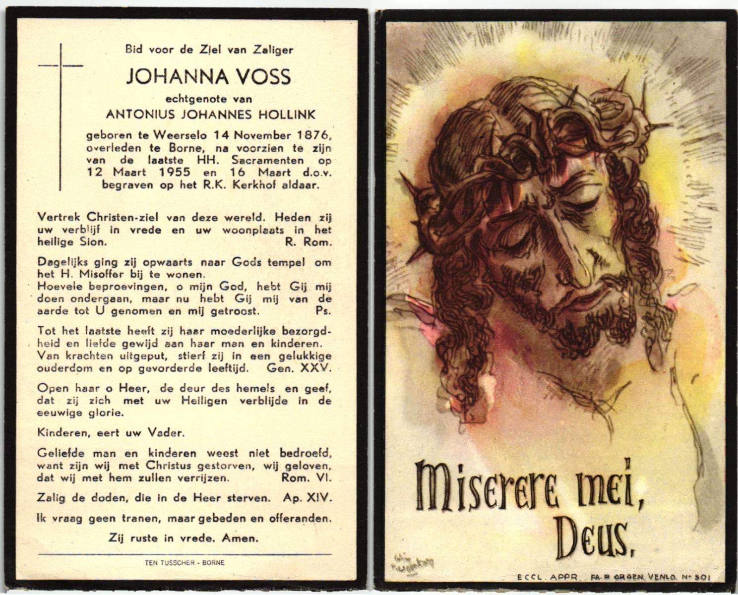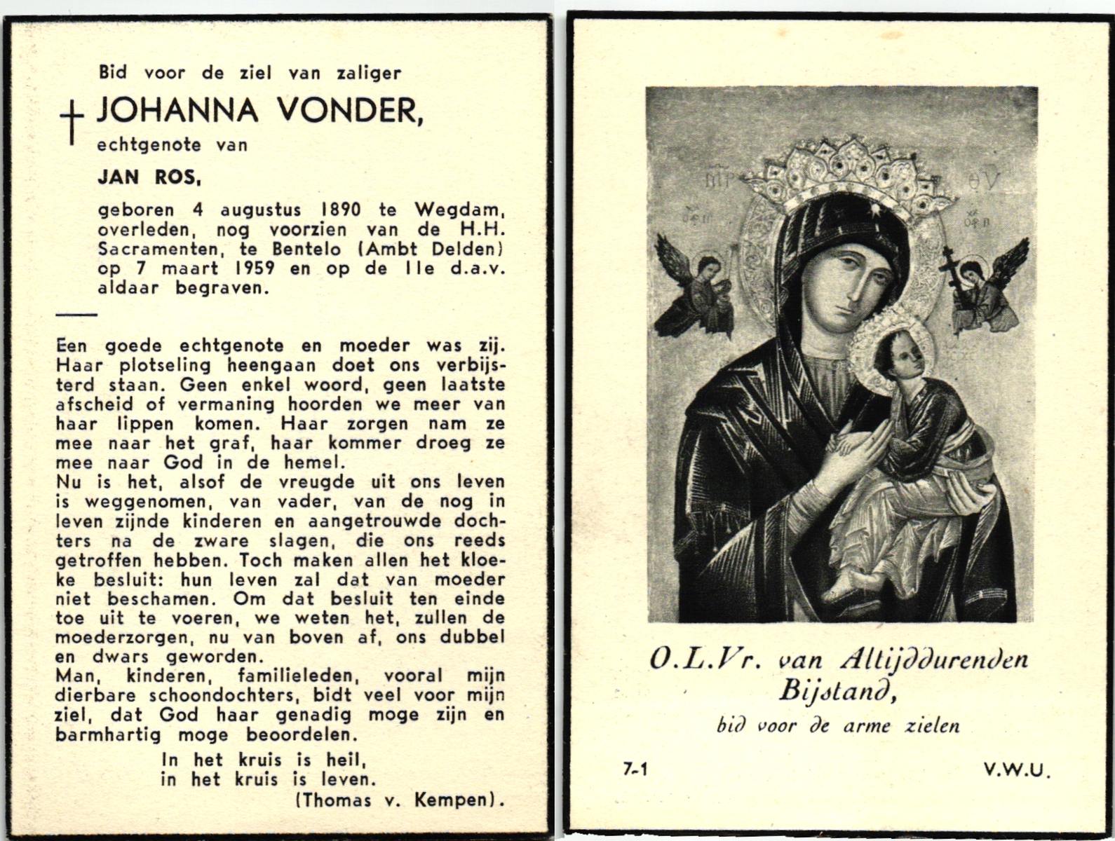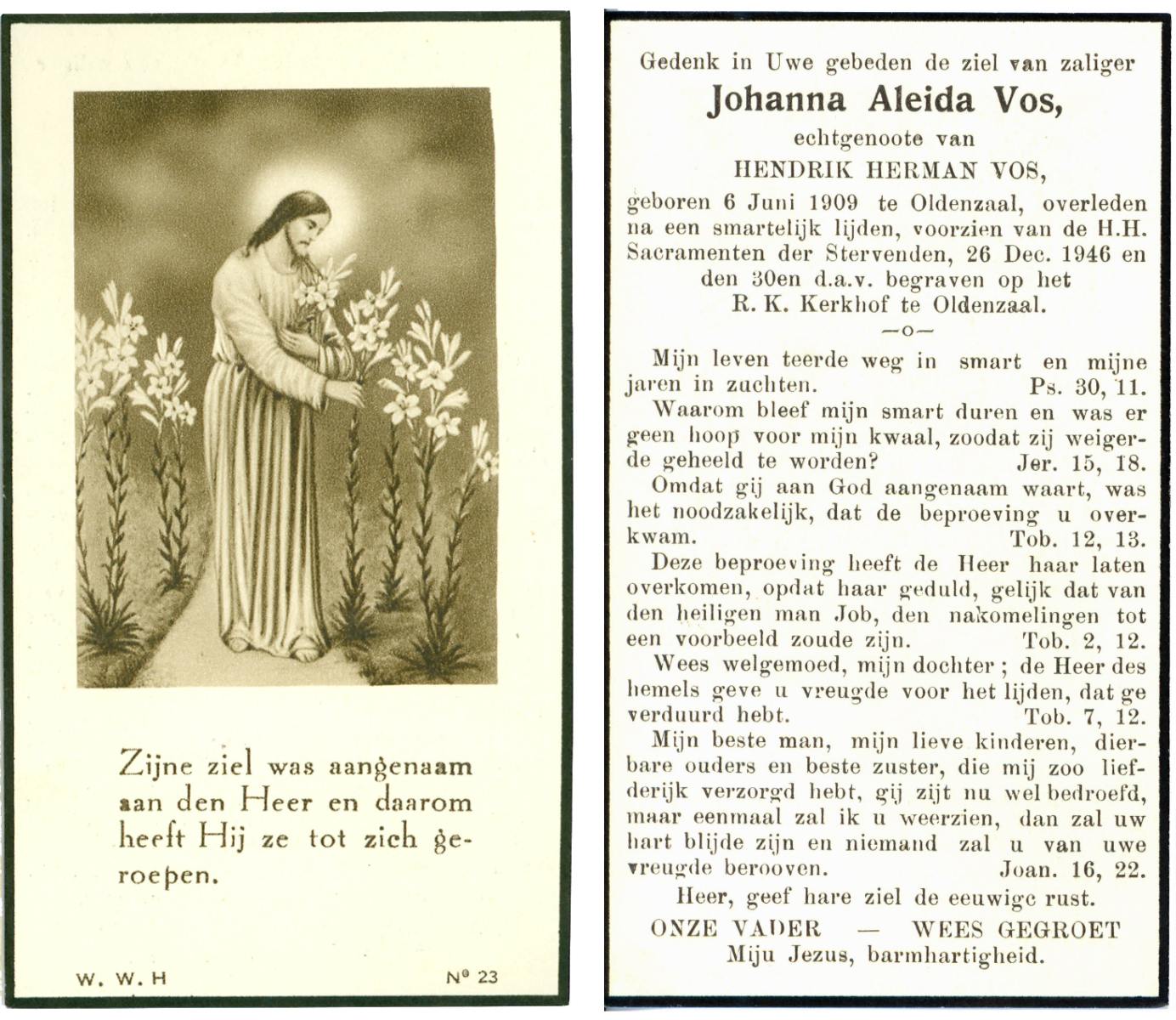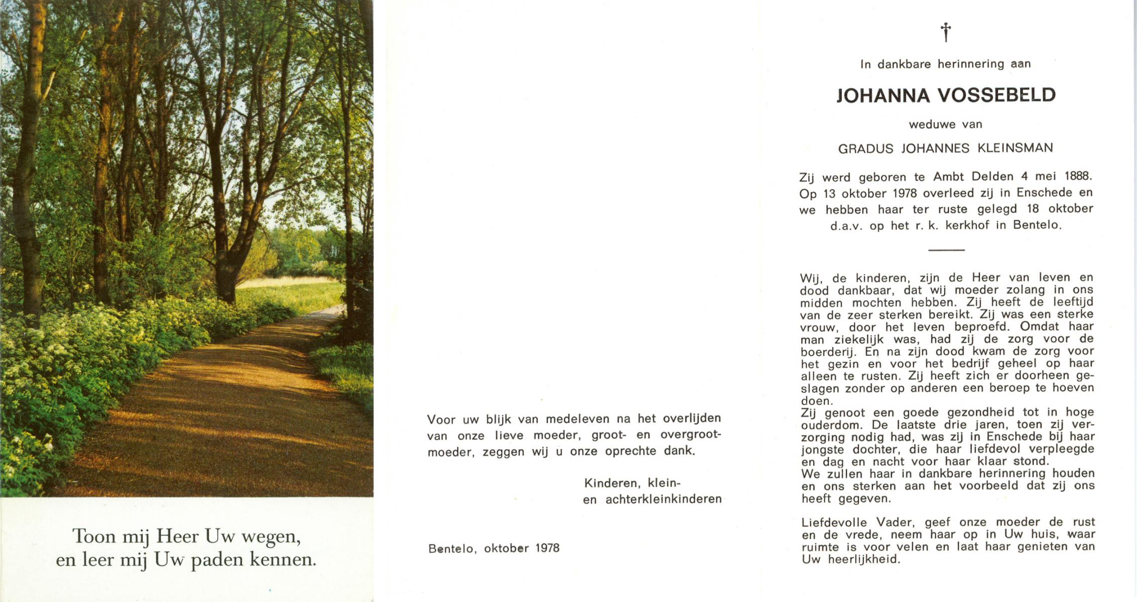 VLIET, van, Johanna, geboren op 03-02-1881 te Vinkeveen, overleden op 14-9-1962 te Delden op 81-jarige leeftijd, begraven op 18-9-1962 te Delden parochie-kerkhof H.Blasius.